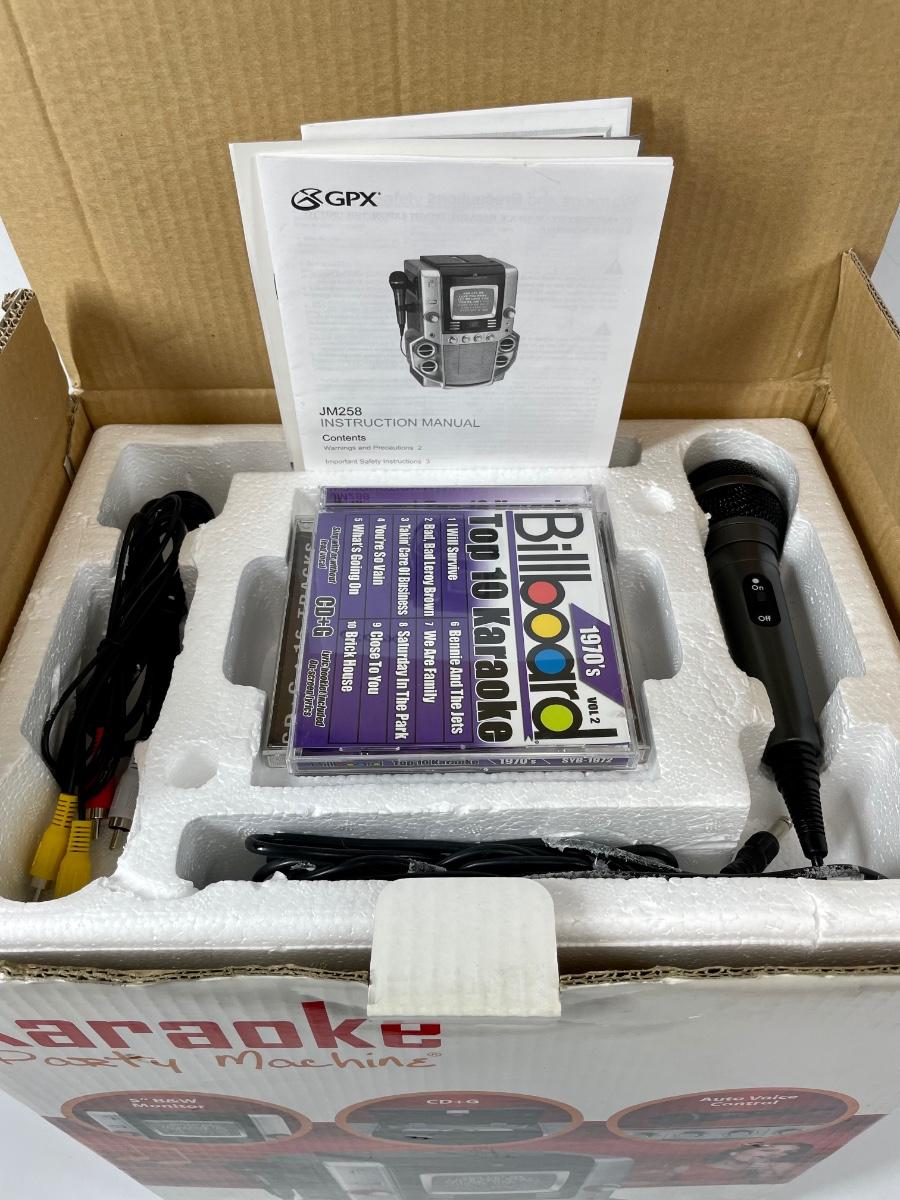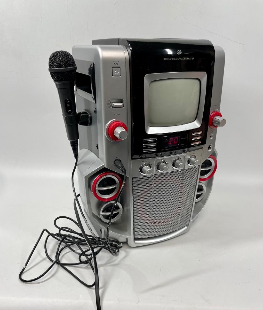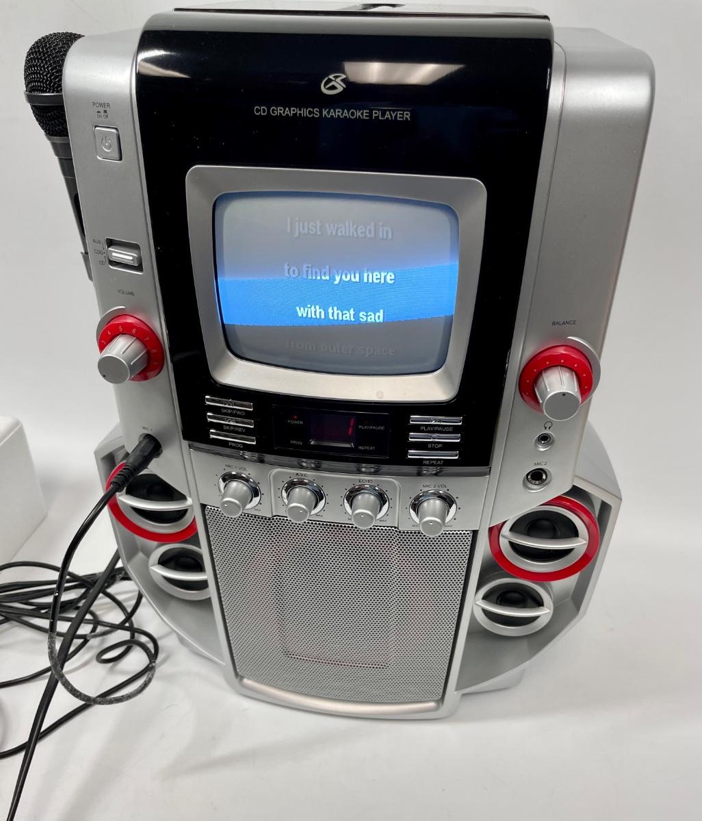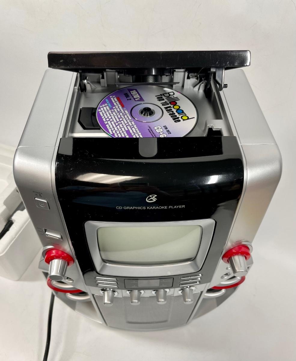 Used but in good condition. Includes 2 CDs. Top-loading CD+Graphics karaoke player with CD, CD-R, CD-RW and CD+G playback; 2-digit LCD track display