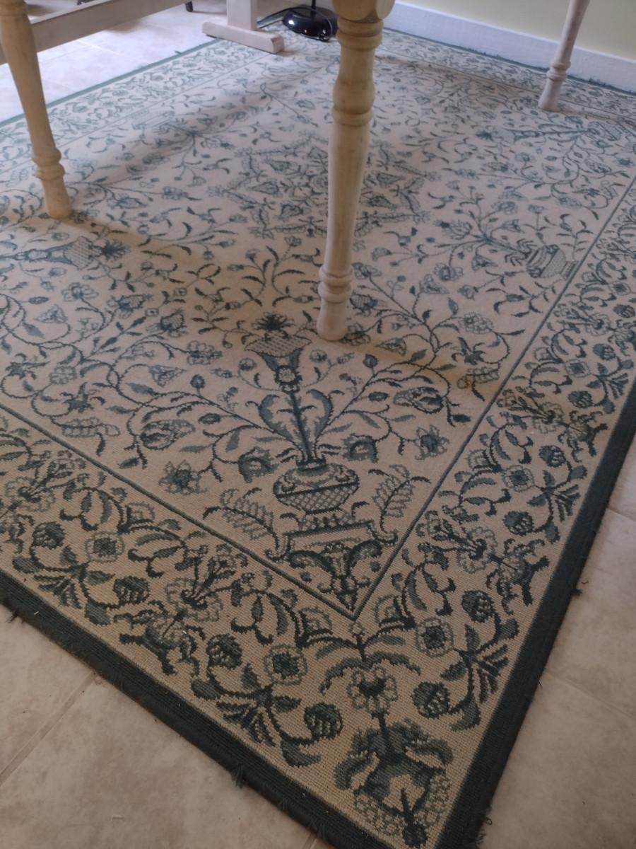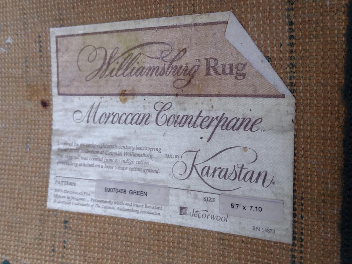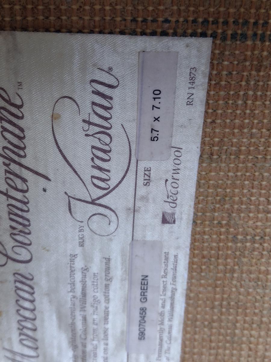 Karastan Indoor/Outdoor Patio Rug- Approx 5.7' x 7.10'. Item is in used condition and has some staining and frayed edges- please see all pictures for condition.