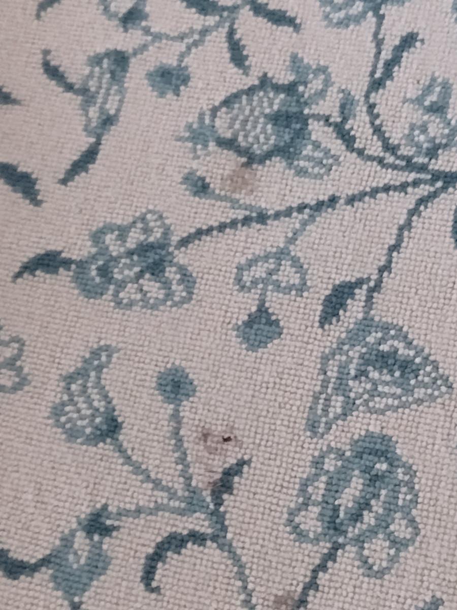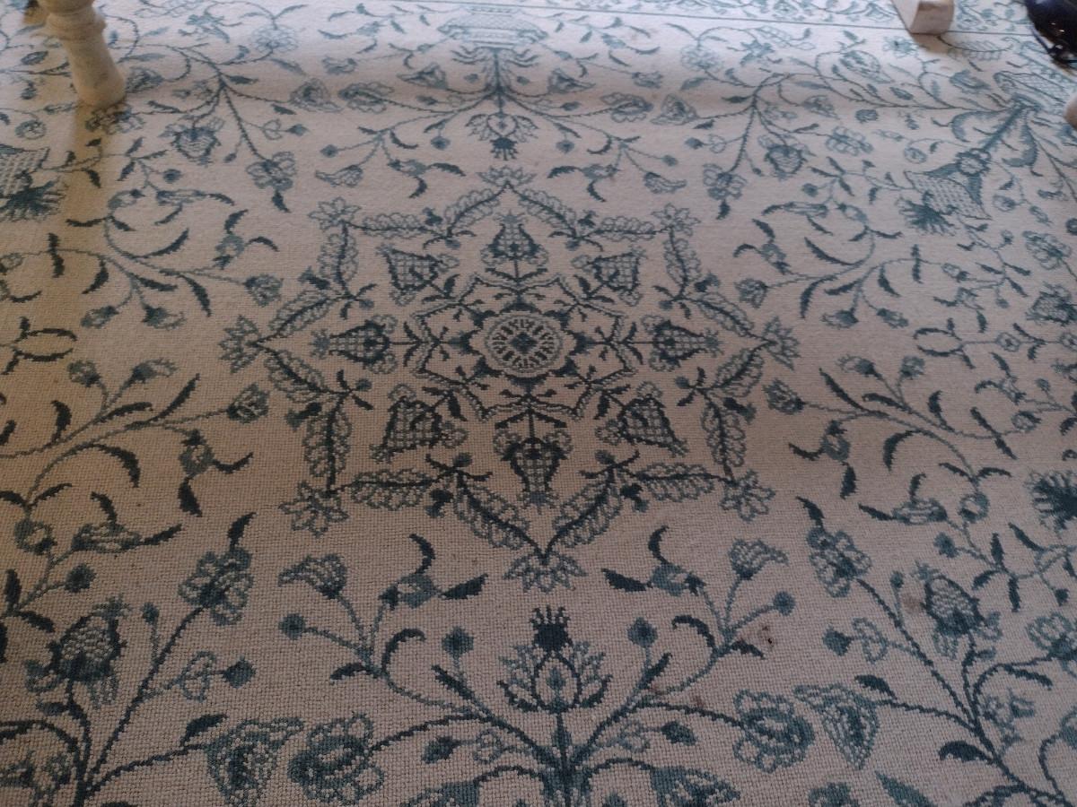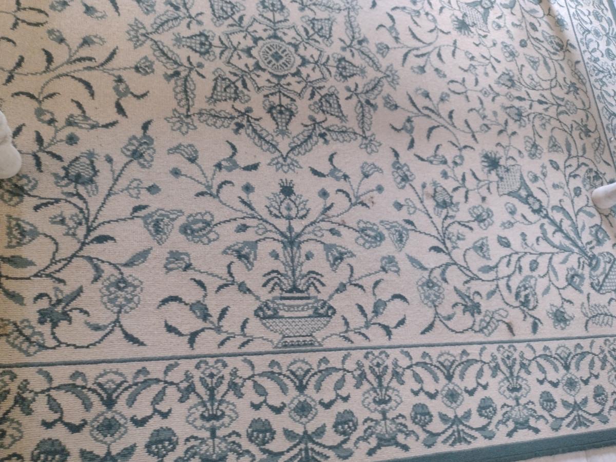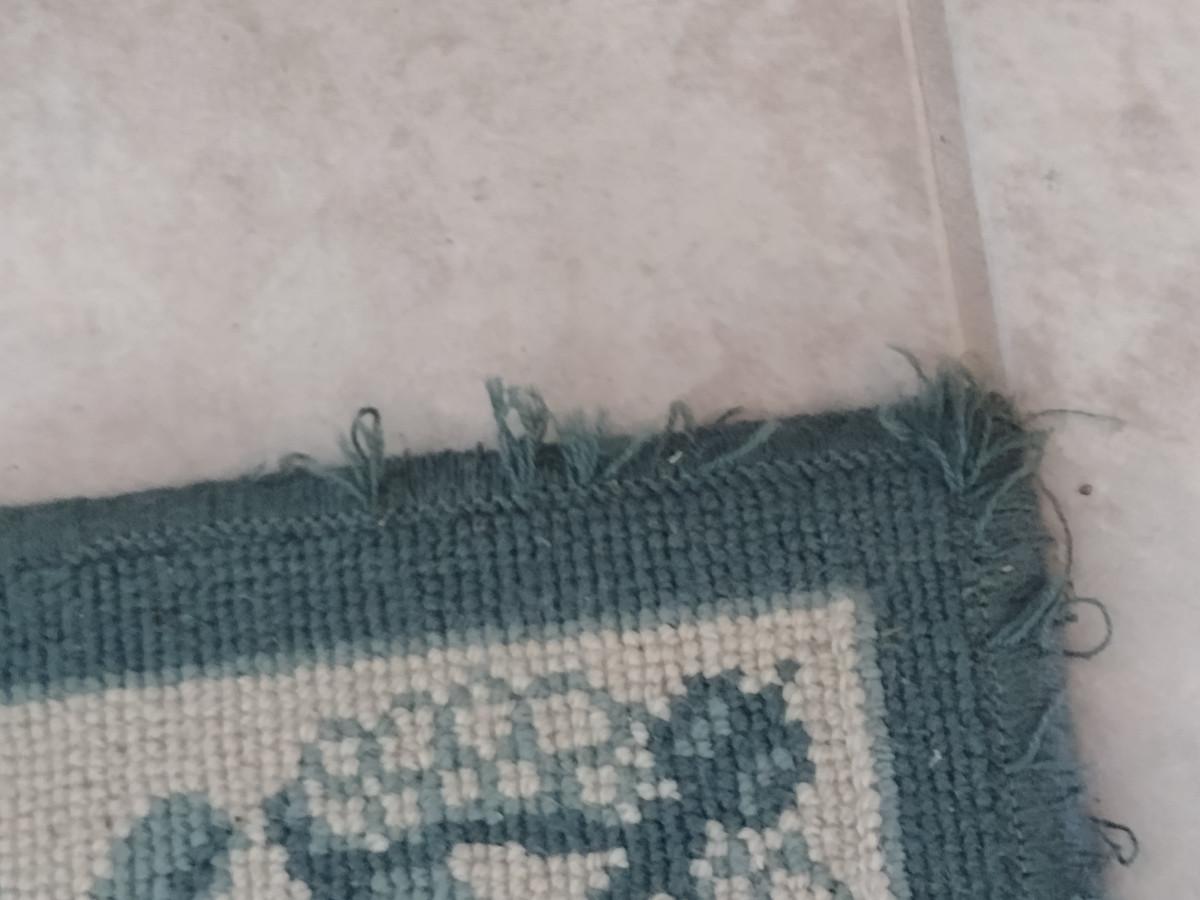 Karastan Indoor/Outdoor Patio Rug- Approx 5.7' x 7.10'. Item is in used condition and has some staining and frayed edges- please see all pictures for condition.