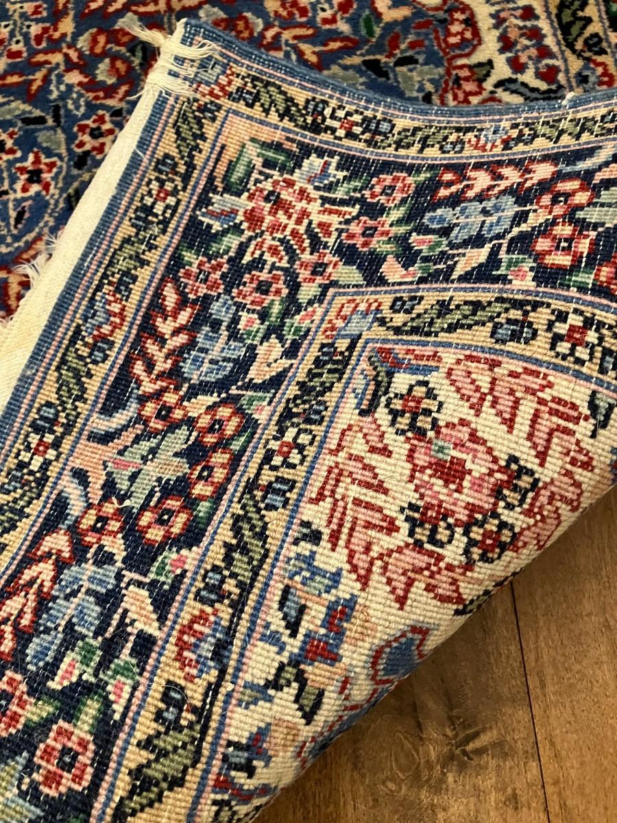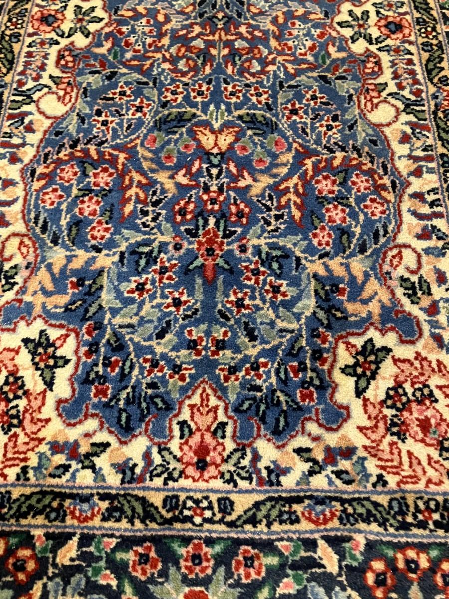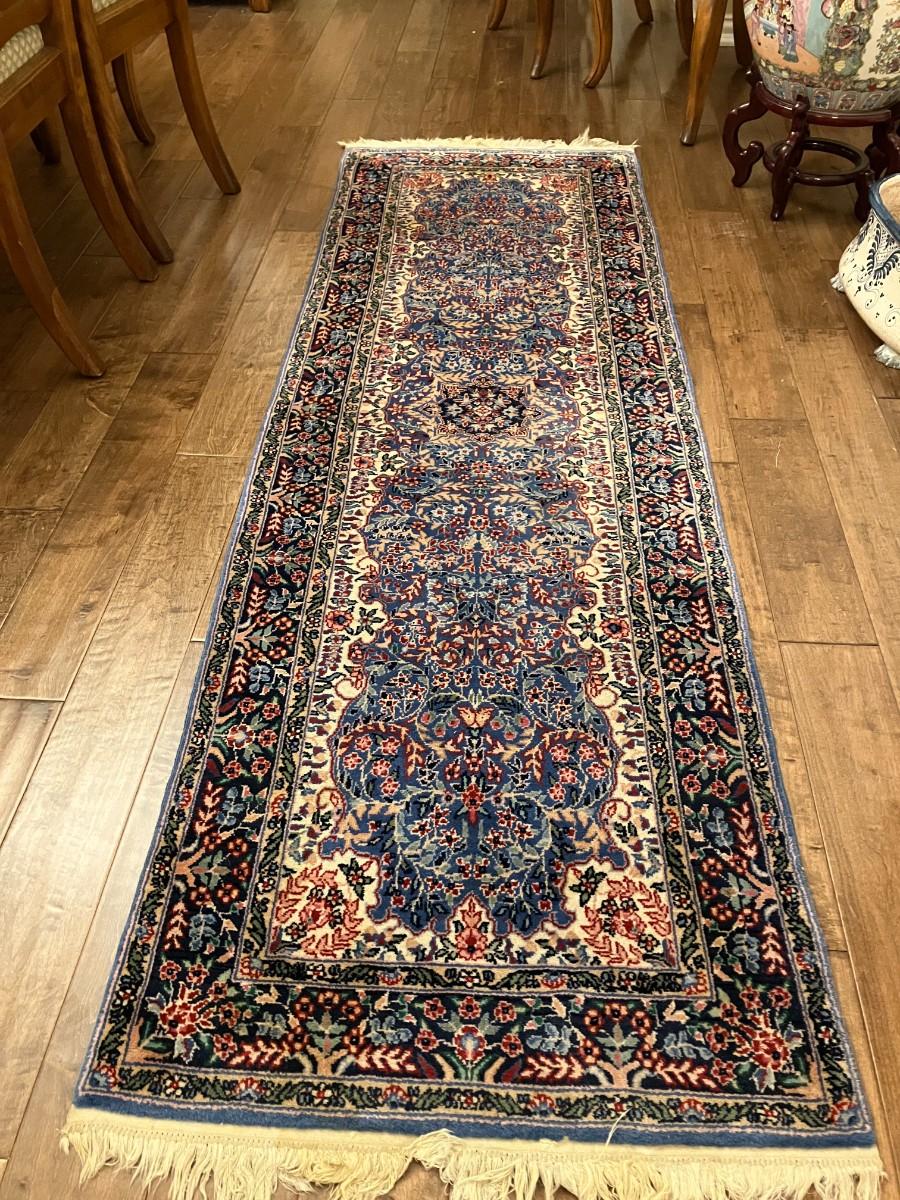 Vintage Karastan Kirman runner rug with normal wear, no significant damage or ink bleed. 92" L x 27.5" W