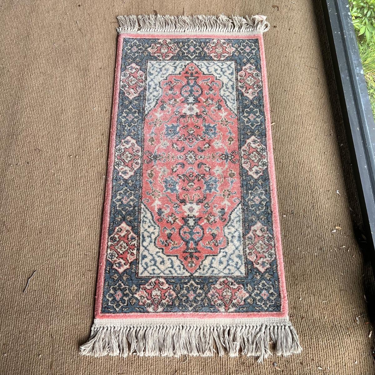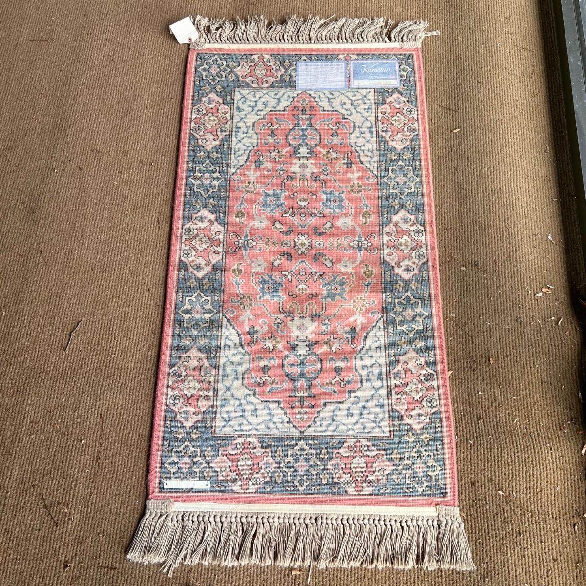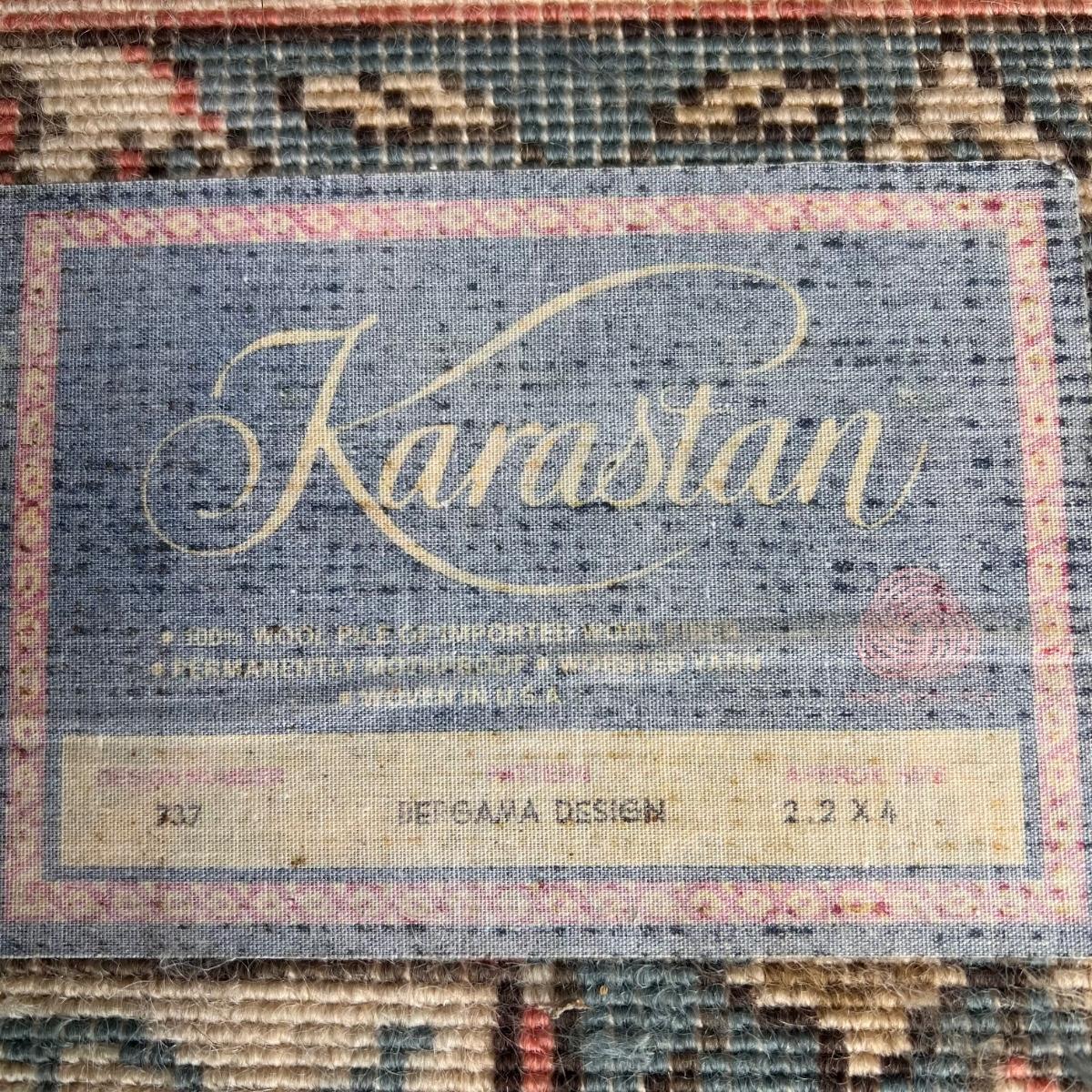 This lot includes one Karastan rug that measures 56” x 26”H. It has hues of pinks, blues, and browns. Shipping available.