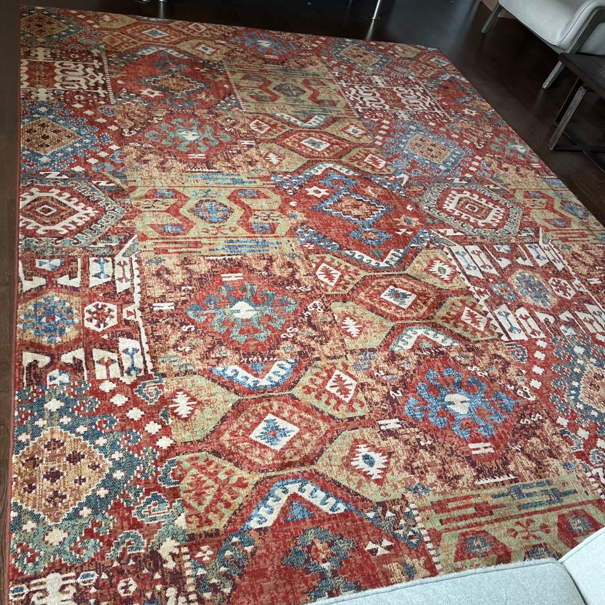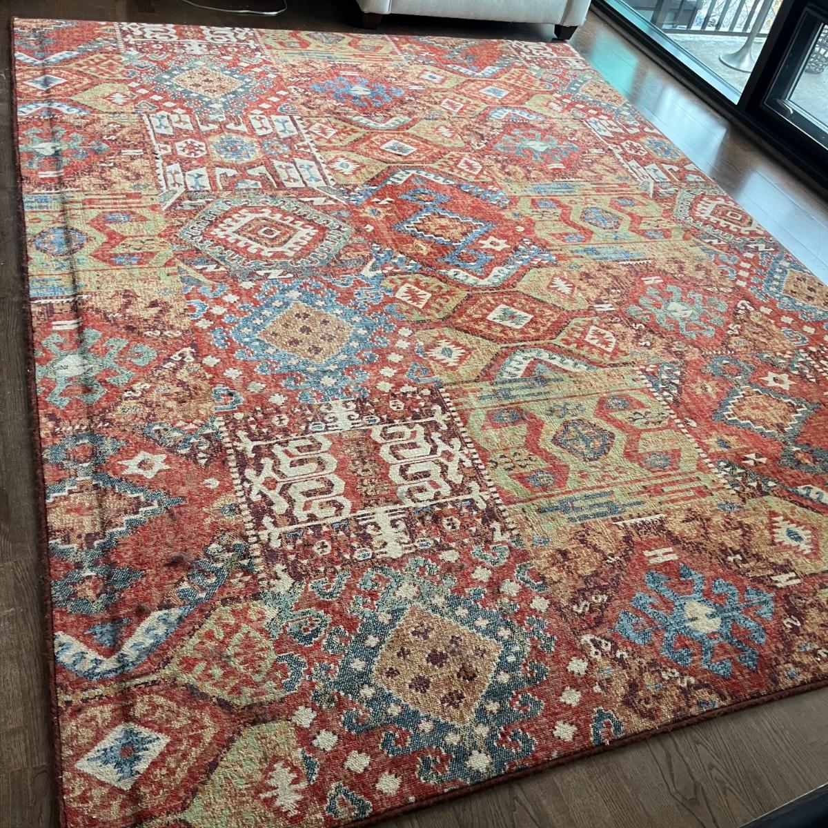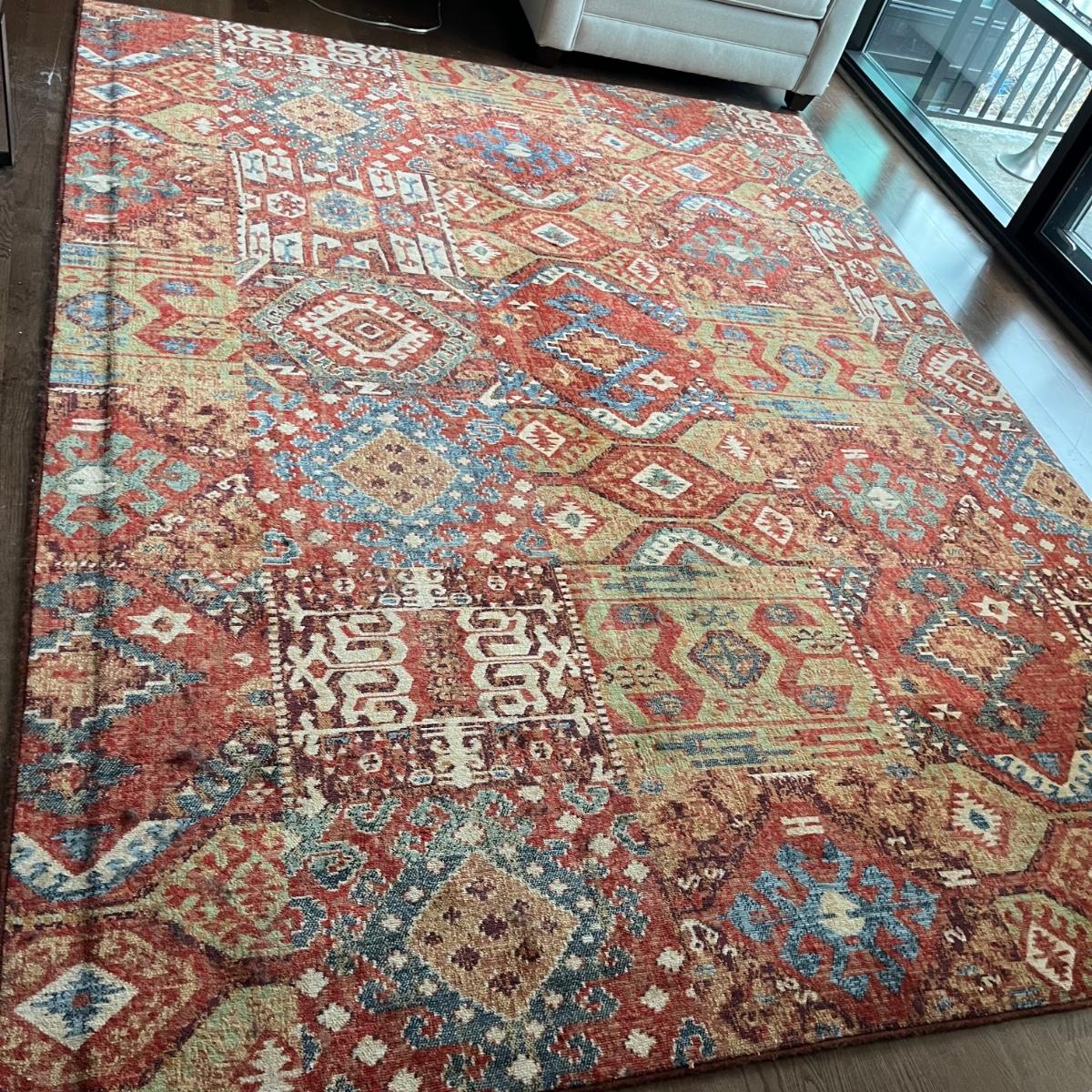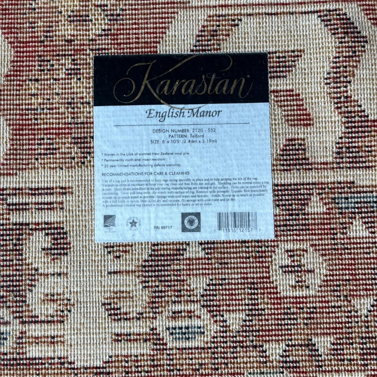 Lot includes a Karastan area rug made of Worsted New Zealand wool. Rug measures 8’ x 10.5’. Rug is in excellent condition and is both vibrant colored but slightly muted, see pictures. Also includes pad.