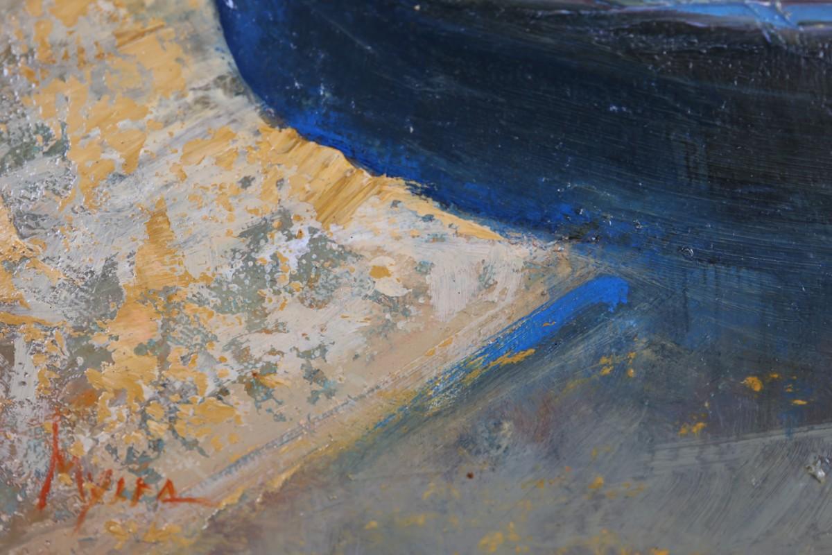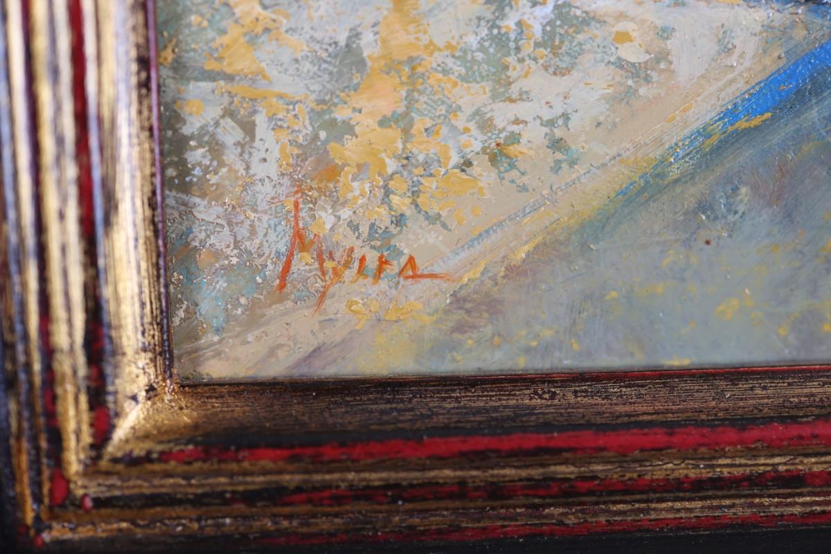 Oil on linen, mounted on board.