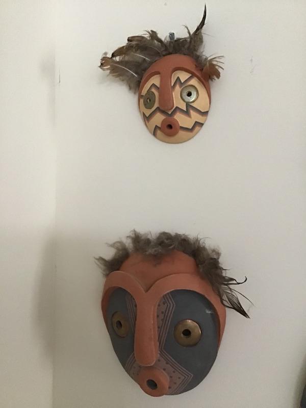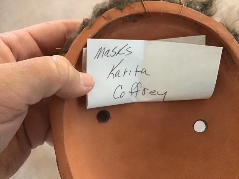 Beautiful and unique Karita Coffrey Terra cotta looking faces with copper eyes. Hair are made rom feathers. Masks measure around 4” and 6”. Purchase price over 500.00.