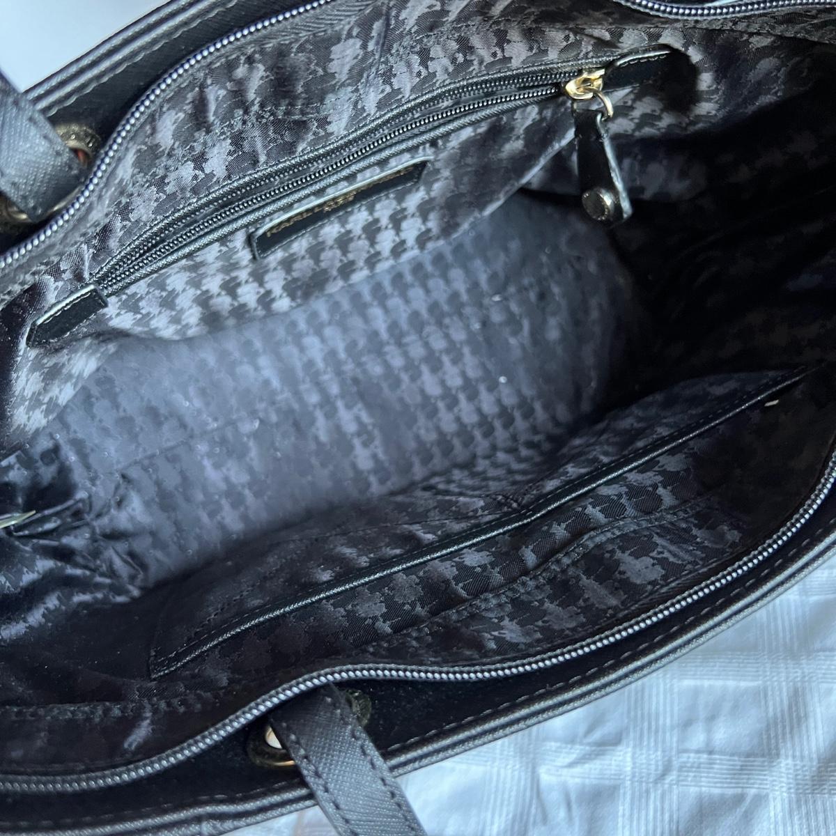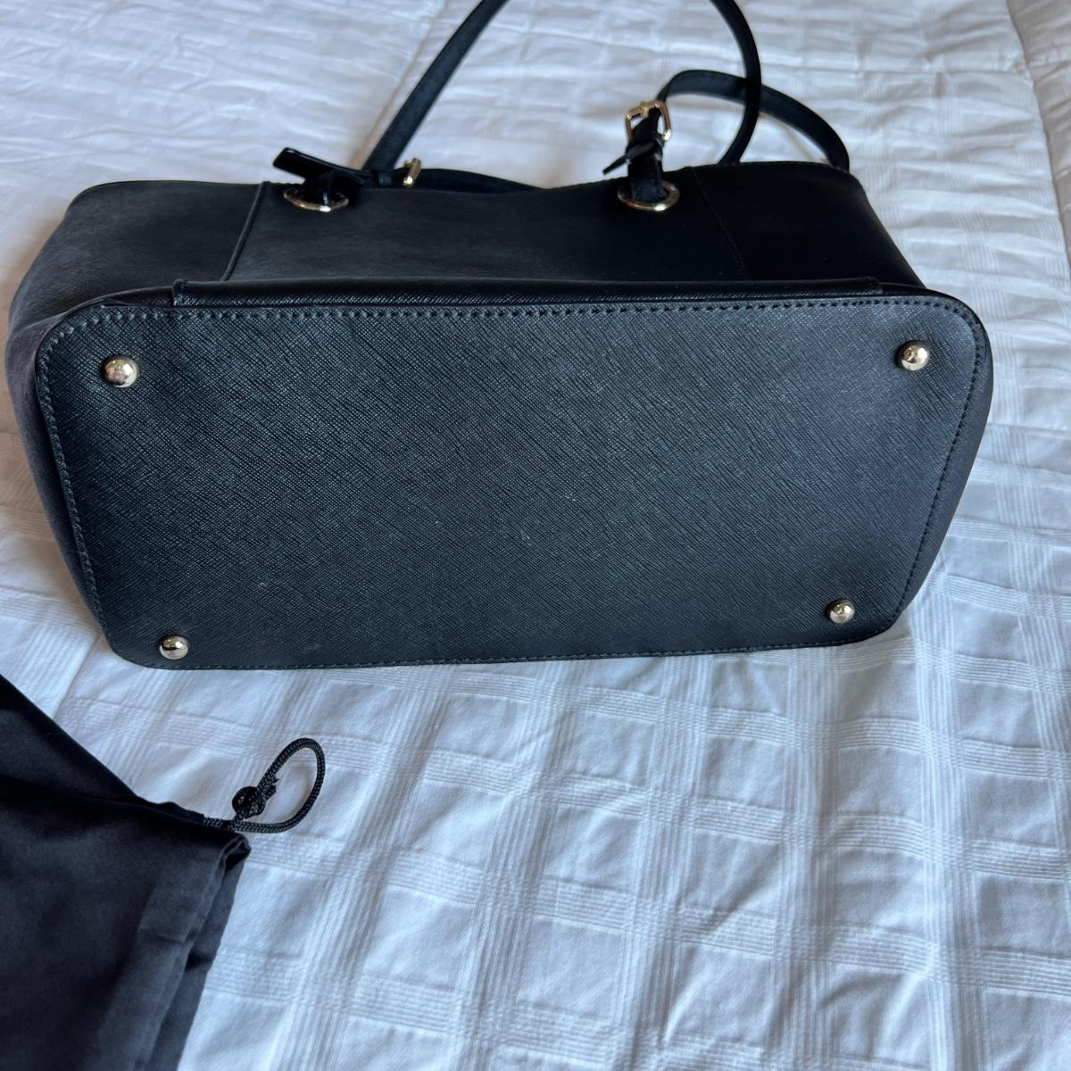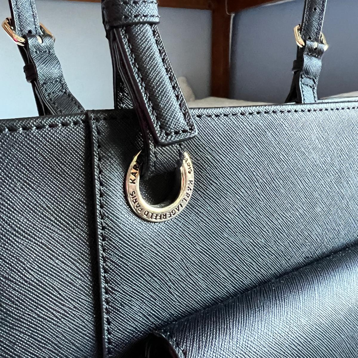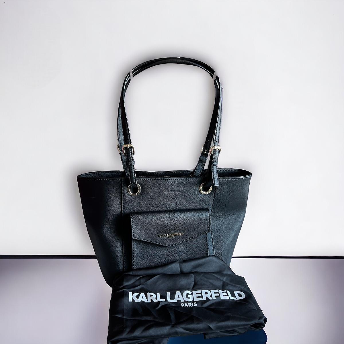 Karl Lagerfeld Paris saffiano leather tote bag in black with gold tone colored accent.Gold tone hardware