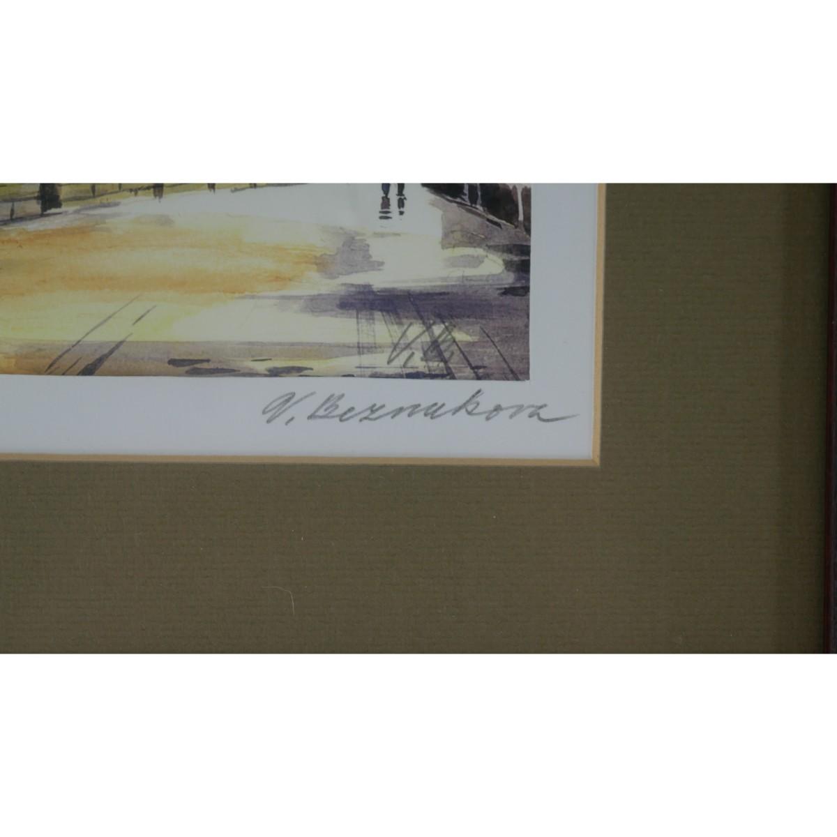 "Karluv Most" or Charles Bridge in Prague, Czech Republic print of painting. Double hand signed by artist "V. B." and possibly "V. Beznakova" in pencil. Exact artist is unkown. Excellent condition! Artwork measures 8.5" x 6", total frame measures 13.25" x 11.25" x 1". (A16)
