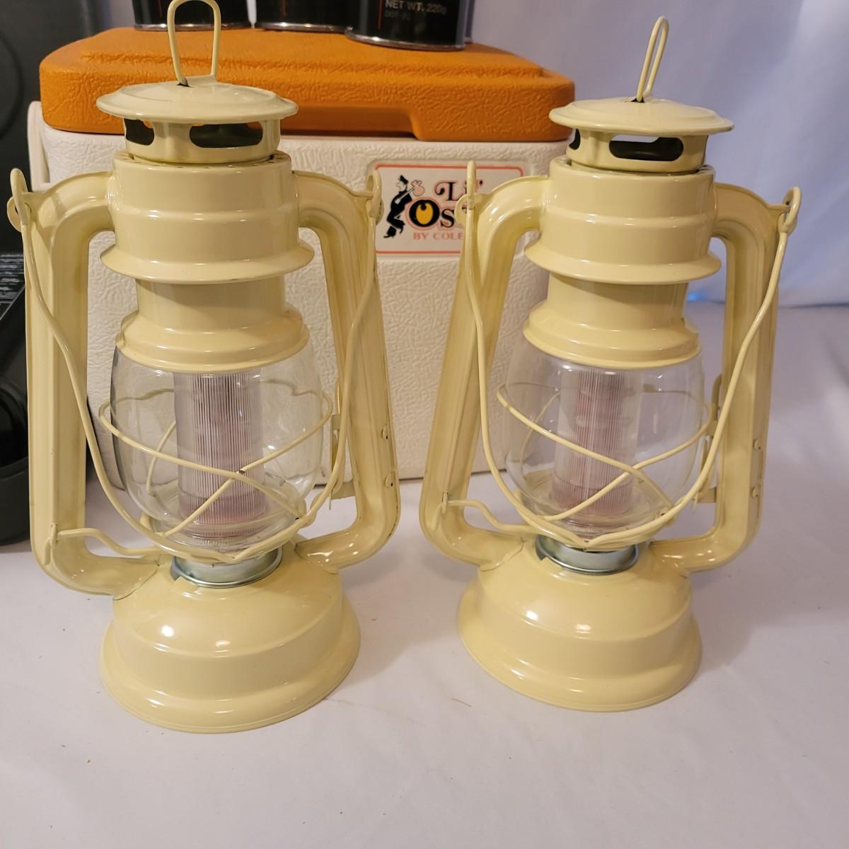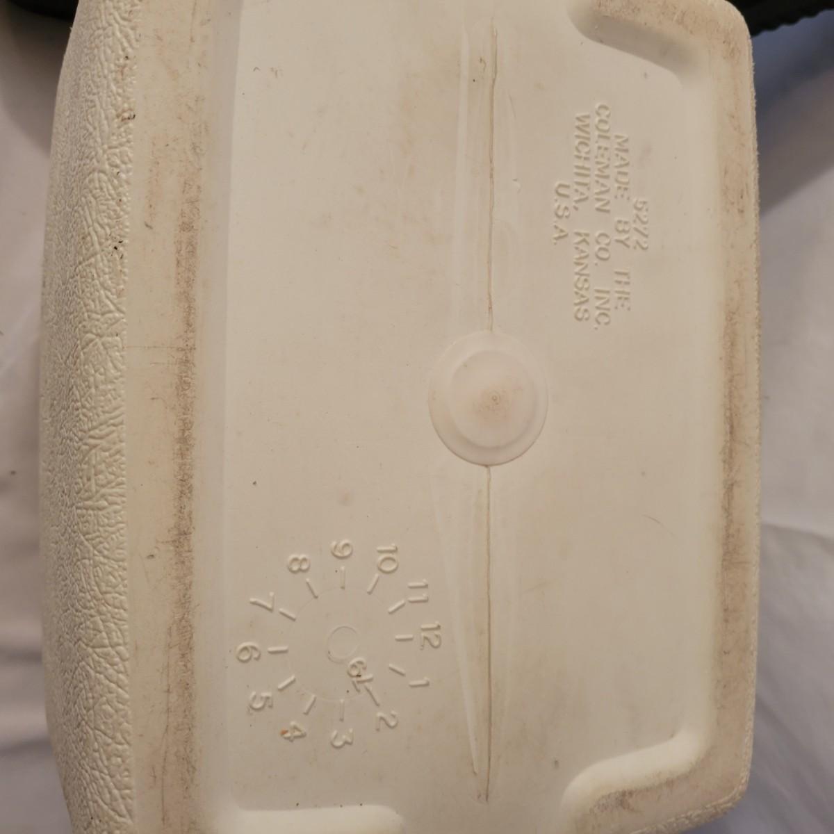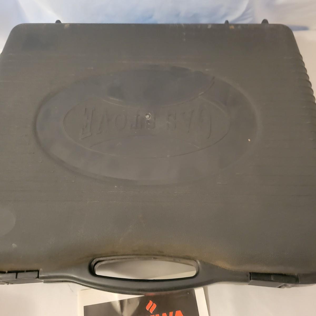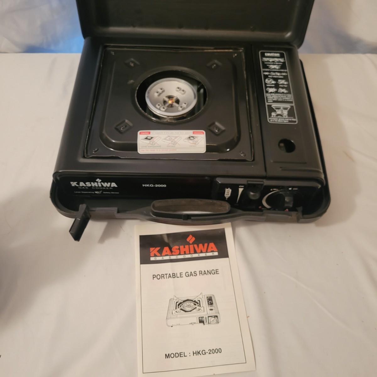 A Kashiwa portable gas camping stove that also includes four bottles of fuel. It measures approximately 13.5" x 11" x 4"H. Also included is a Coleman Lil' Oscar cooler and two battery powered lanterns. We cannot guarantee the contents of the fuel bottles. Local pickup only