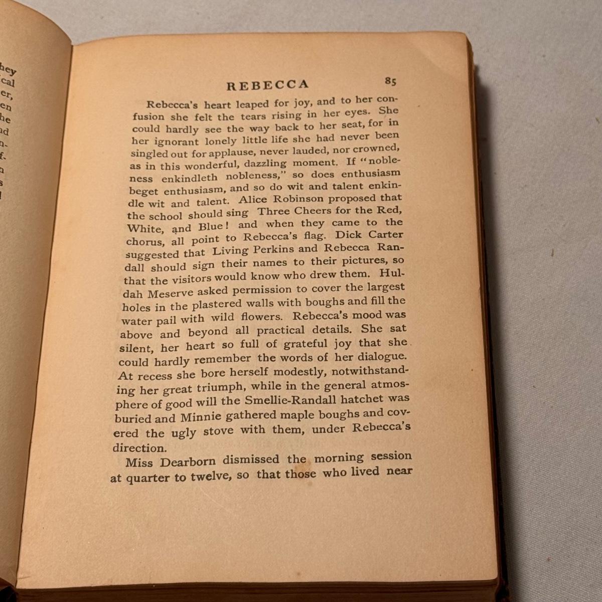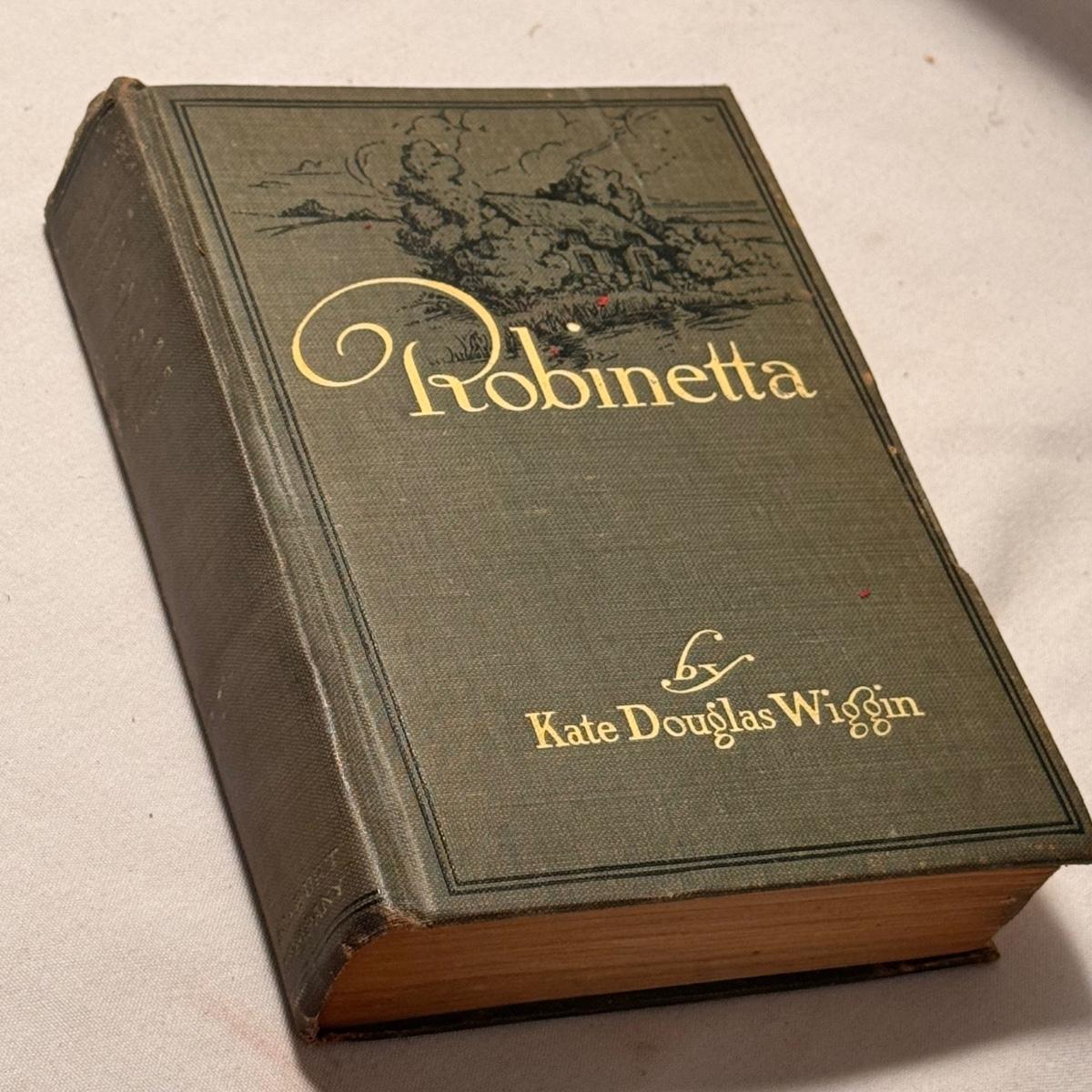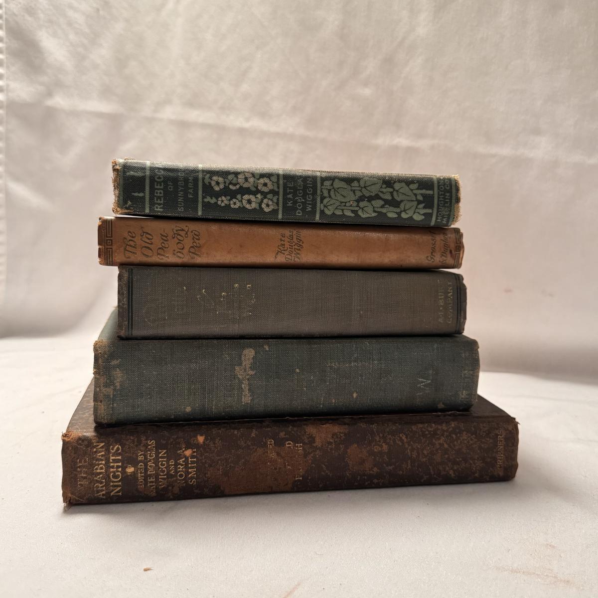 This lot includes five Kate Douglas Wiggin antique books. There is Rebecca of Sunnybrook Farm (copyright 1903), The Old Peabody Pew (1907), Robinetta (1910), My Garden of Memory (copyright 1923), and The Arabian Nights: Their Best-known Tales (copyright 1909). The largest book measures 7” x 9.5” x 1.5”H. Shipping available