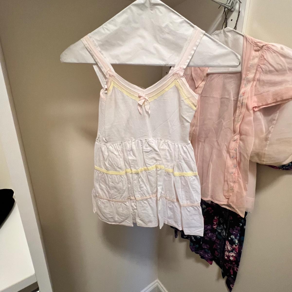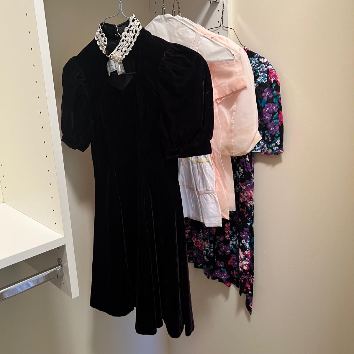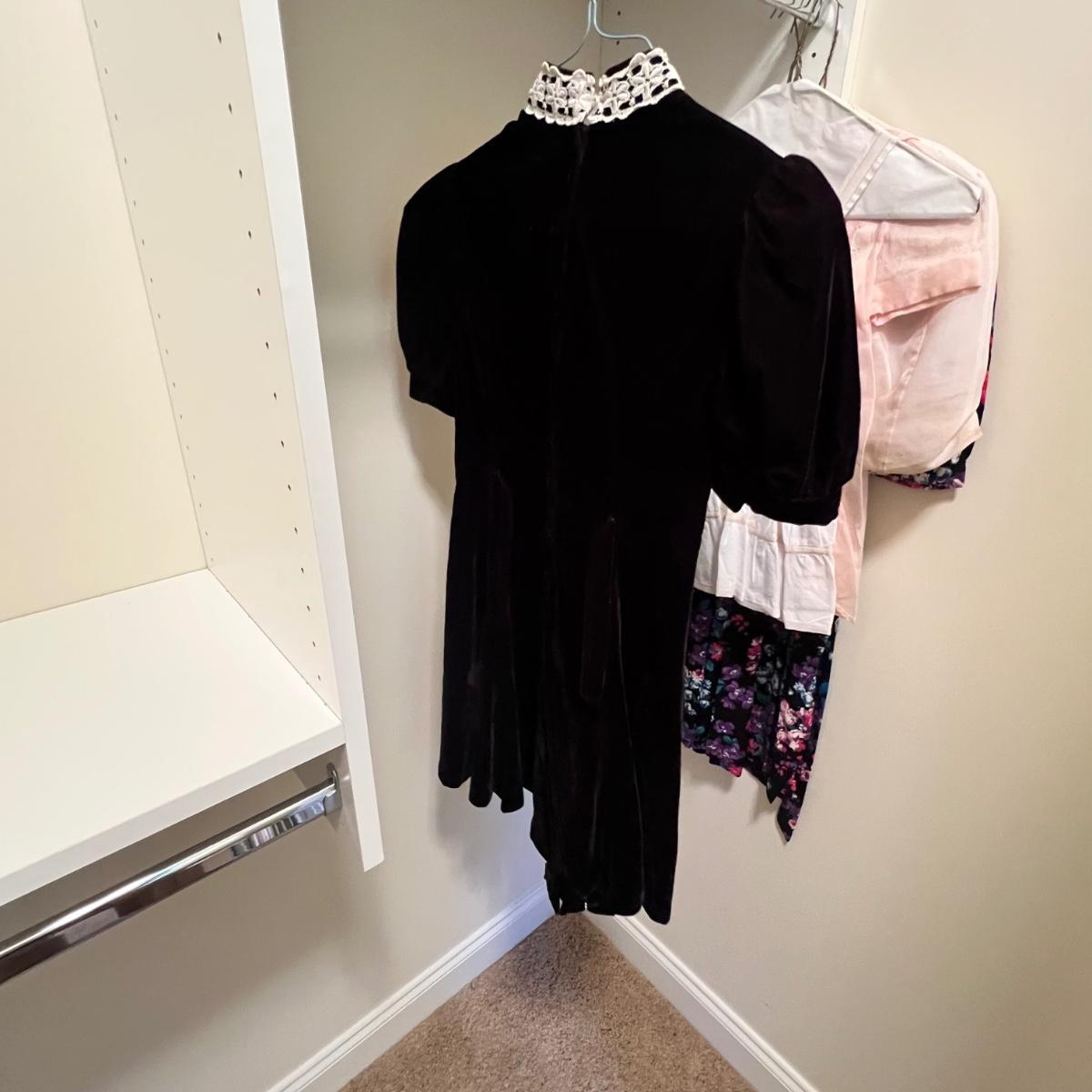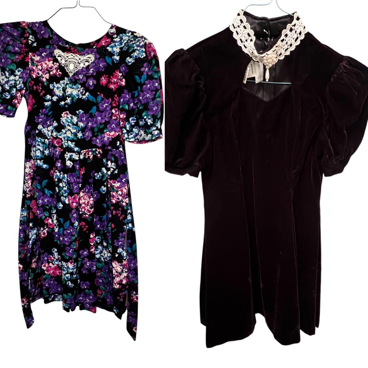 Lovely assortment of vintage girls clothing. The tops appear to be smaller in size than the dresses, see images for any sizes and labels found. The two pale pink short sleeved tops have some stains and one shirt has some blue unidentifiable pieces inside the hem, see pics. The black velvet like dress has a silk like lining and lace collar around the neckline with a faux pearl brooch..