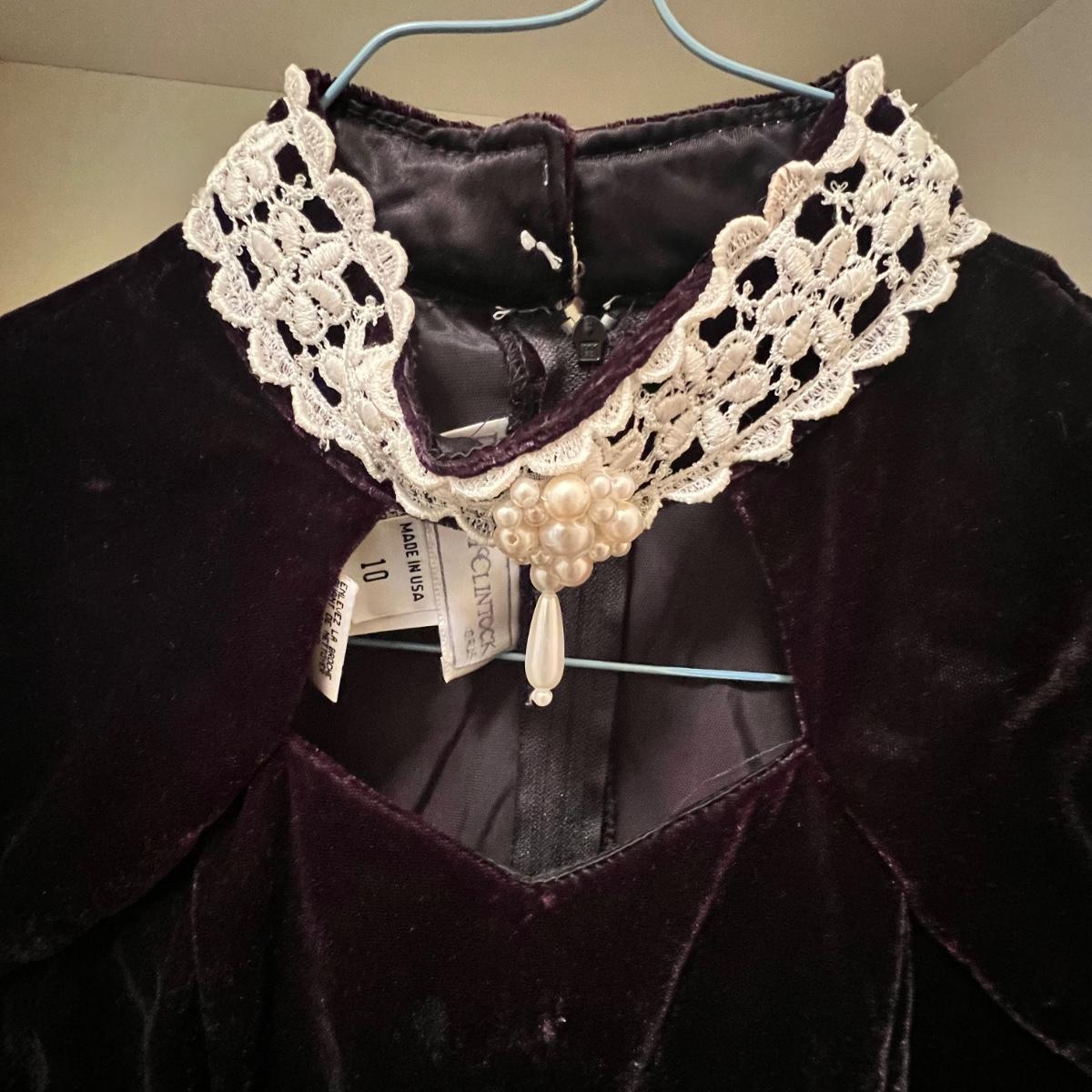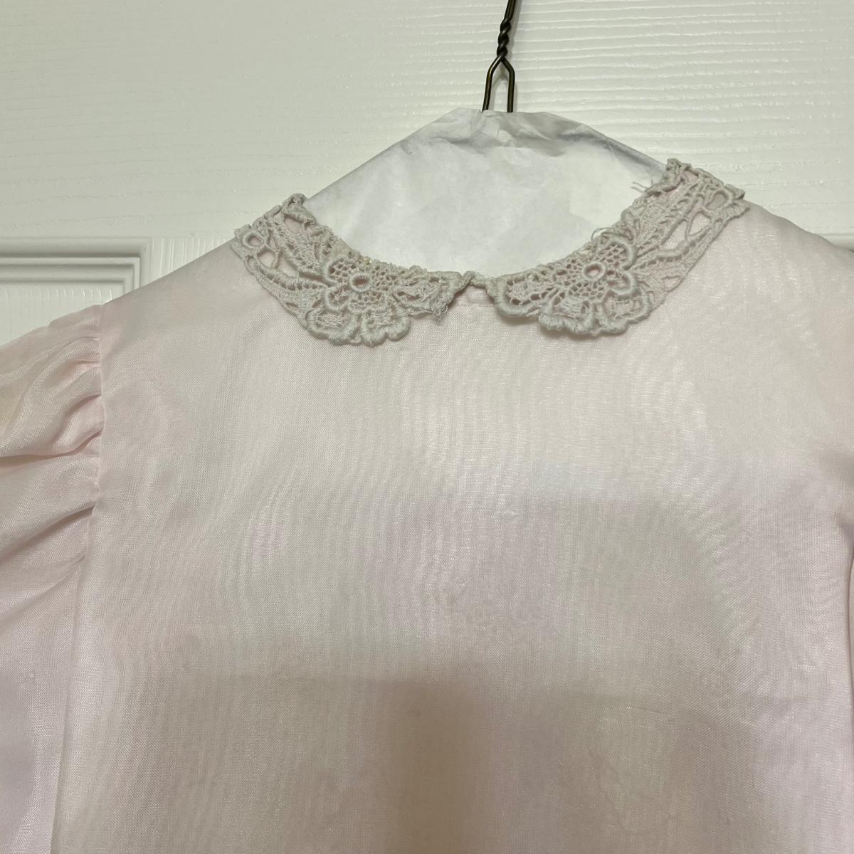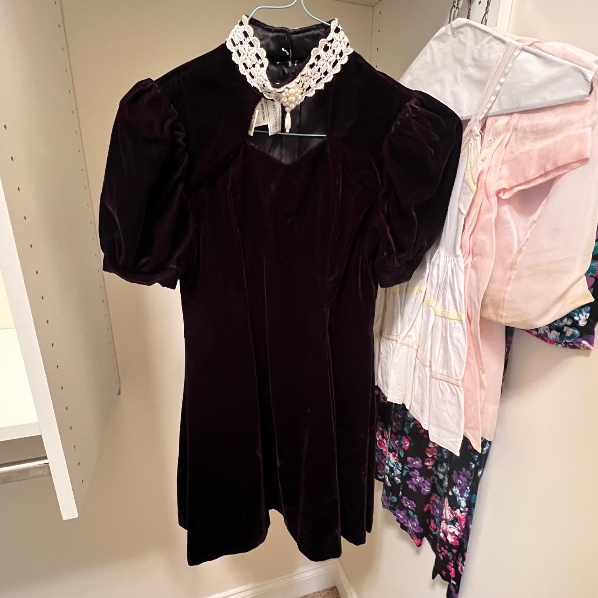 Lovely assortment of vintage girls clothing. The tops appear to be smaller in size than the dresses, see images for any sizes and labels found. The two pale pink short sleeved tops have some stains and one shirt has some blue unidentifiable pieces inside the hem, see pics. The black velvet like dress has a silk like lining and lace collar around the neckline with a faux pearl brooch..