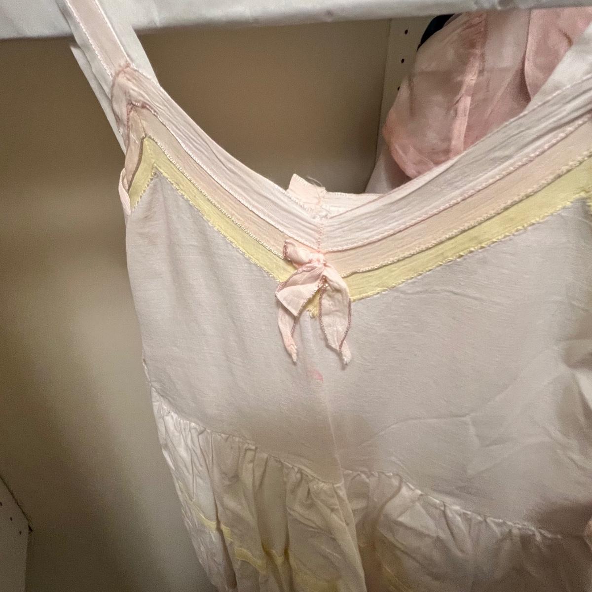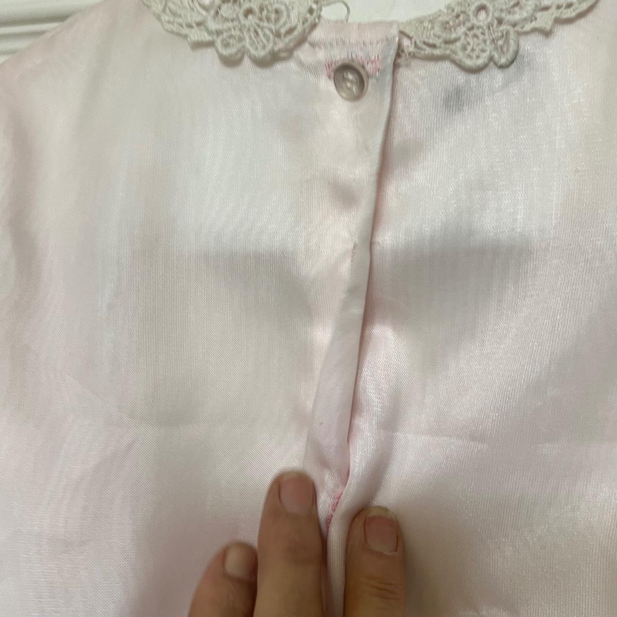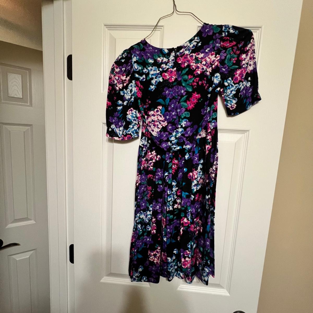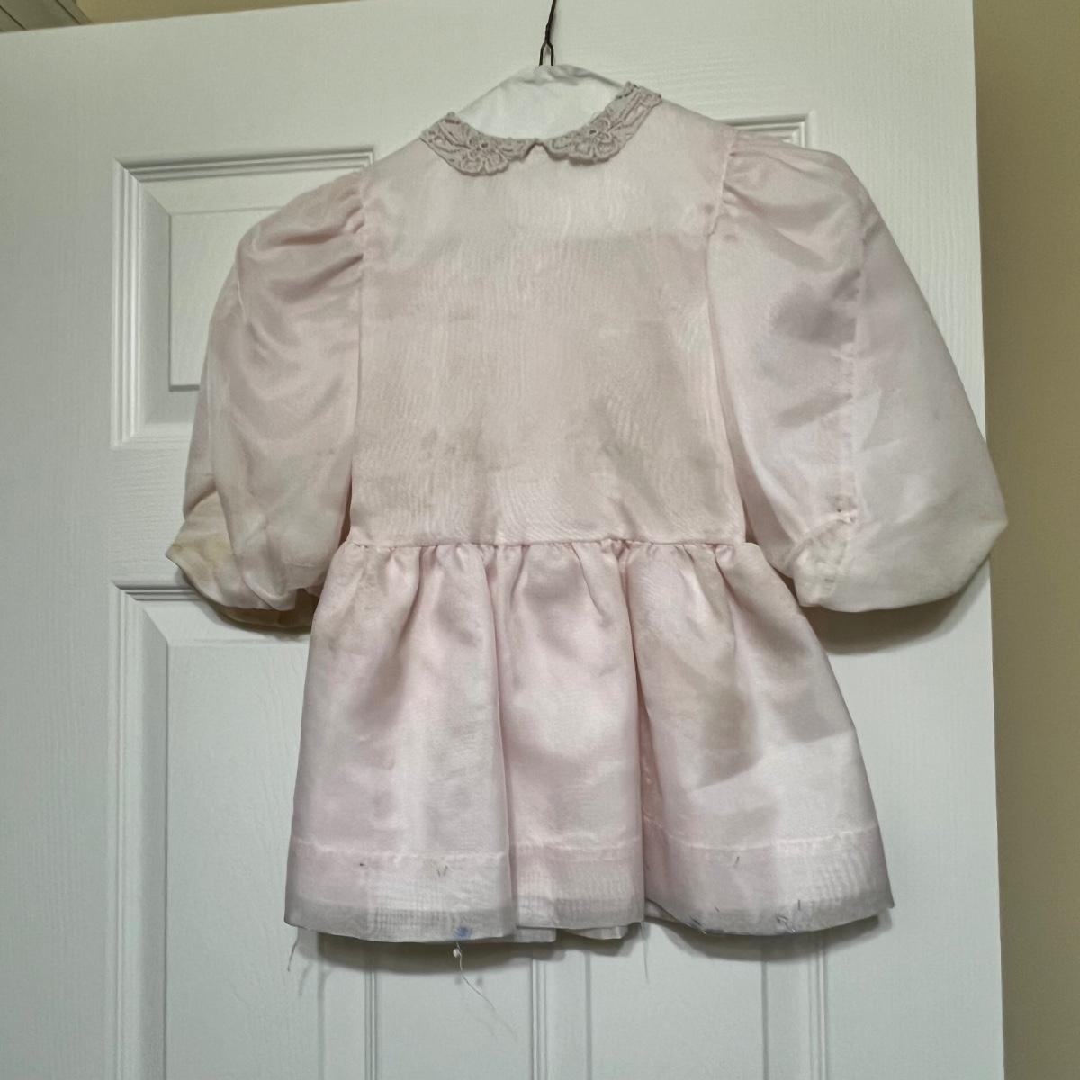 Lovely assortment of vintage girls clothing. The tops appear to be smaller in size than the dresses, see images for any sizes and labels found. The two pale pink short sleeved tops have some stains and one shirt has some blue unidentifiable pieces inside the hem, see pics. The black velvet like dress has a silk like lining and lace collar around the neckline with a faux pearl brooch..