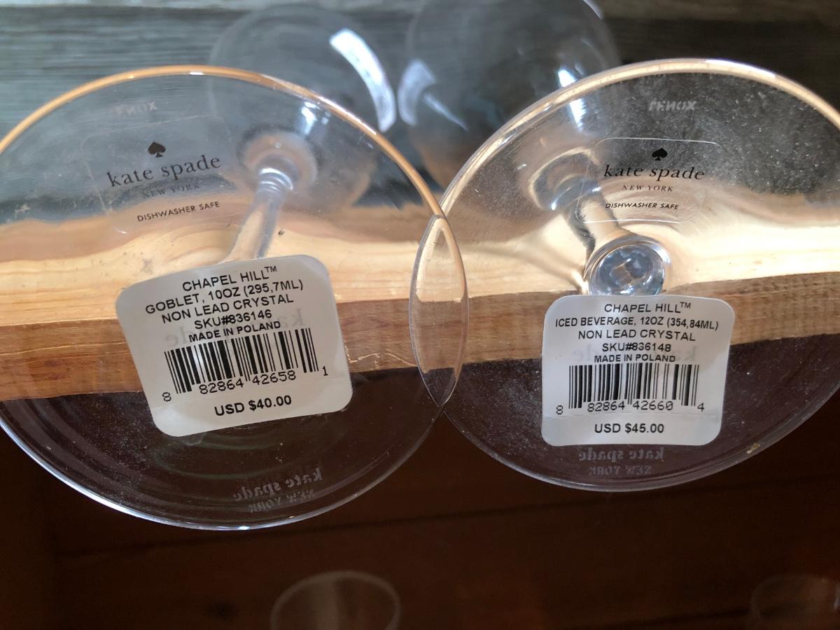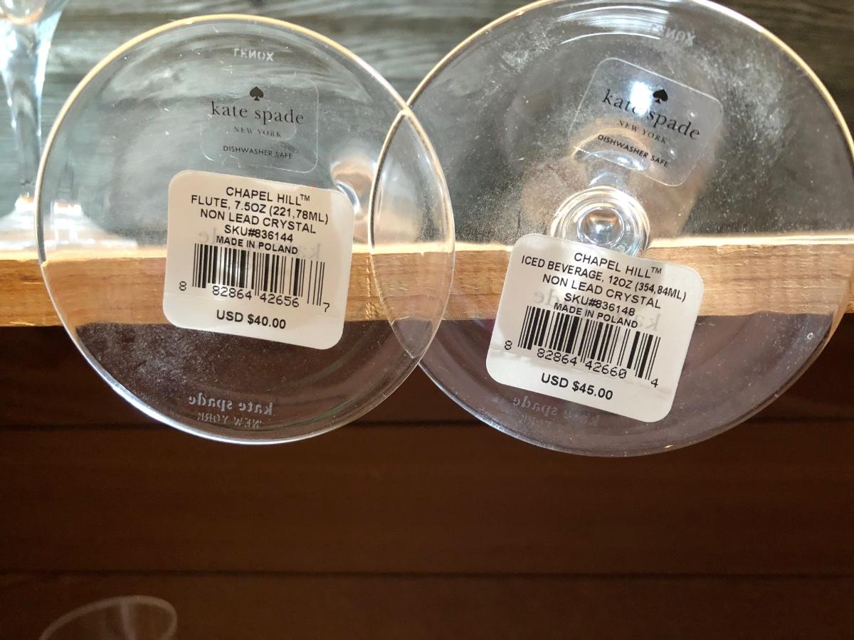 4 Brand new Kate Spade wine glasses/champagne flutes, 1 Ralph Lauren 24% lead crystal glass & 5 Orrefors wine glasses/champagne flutes.