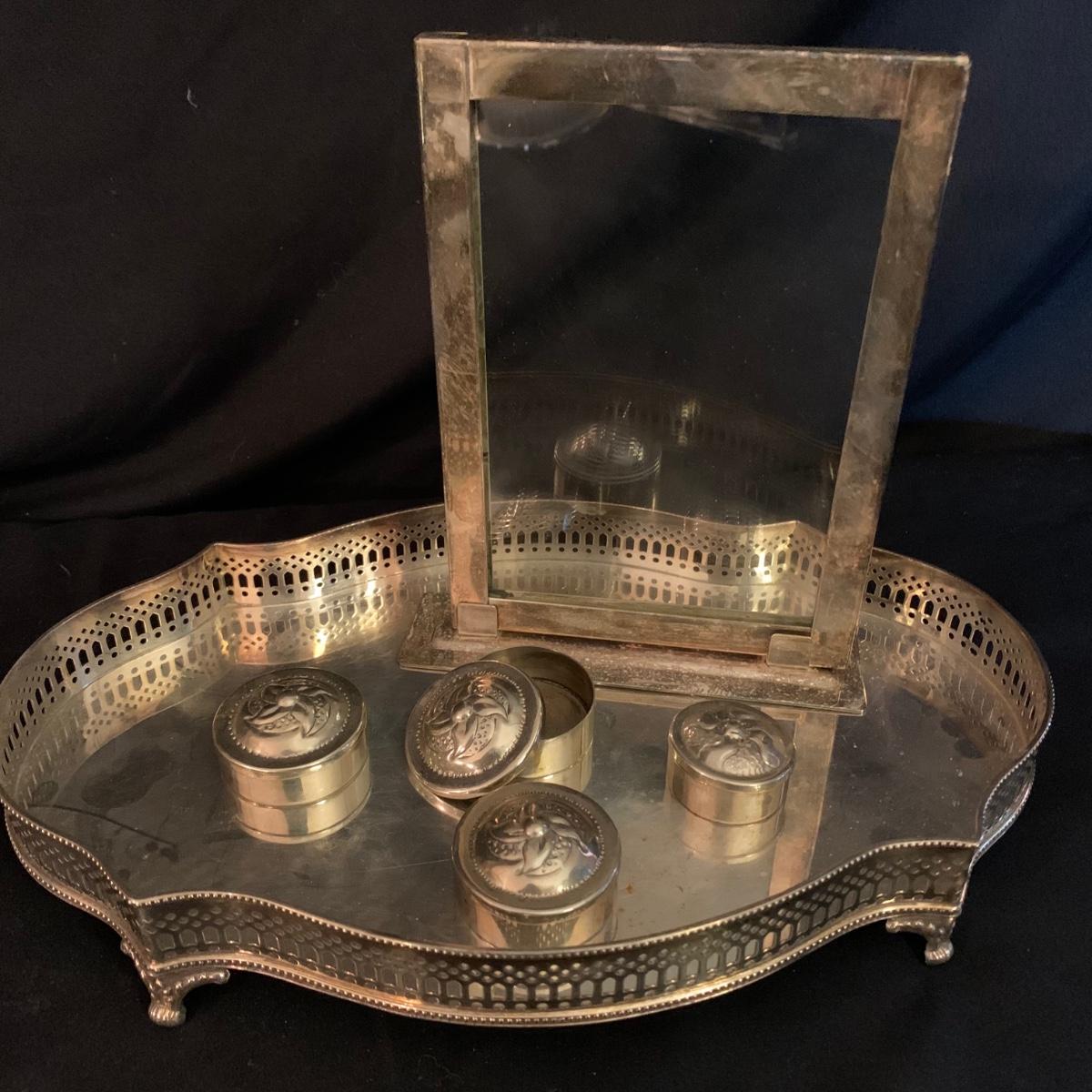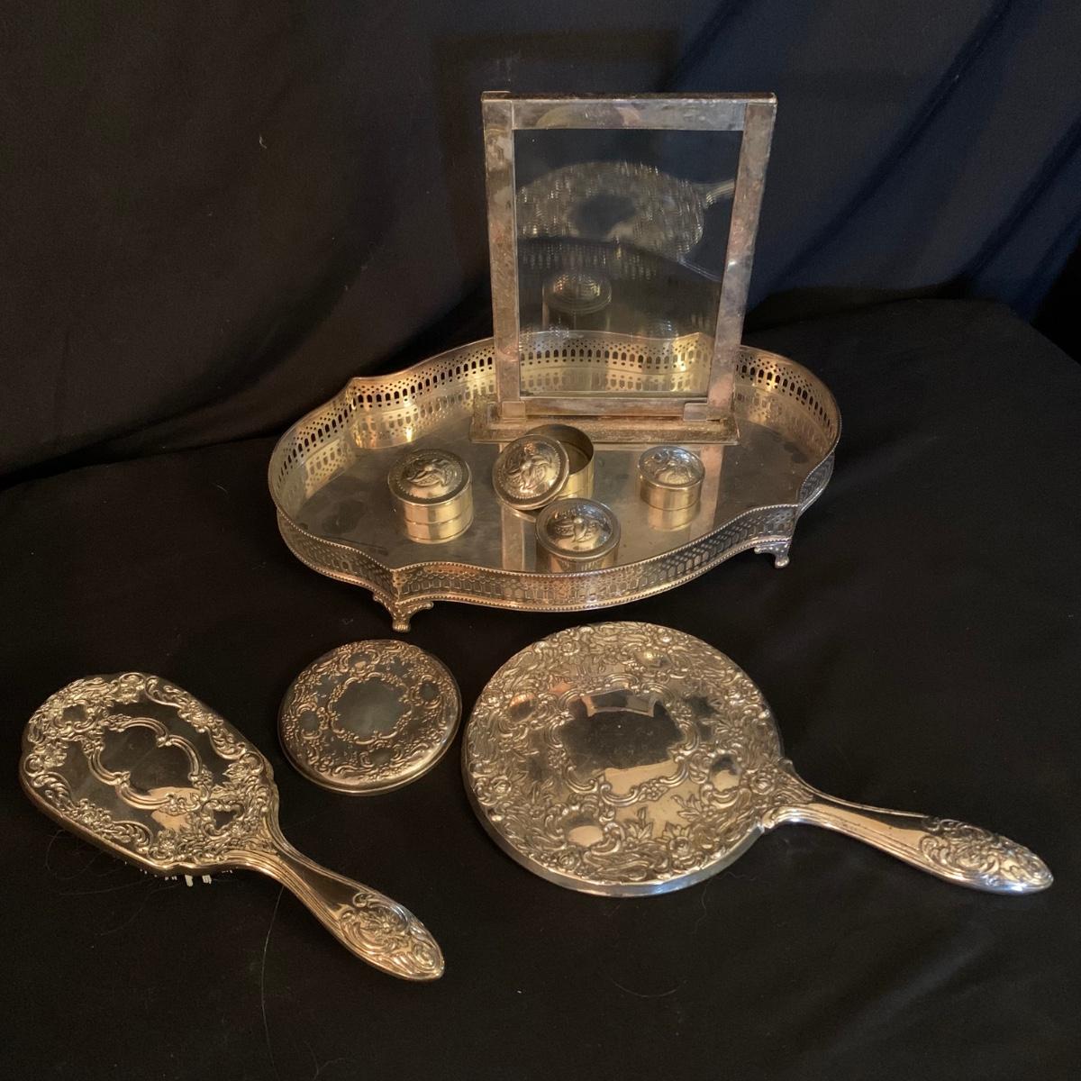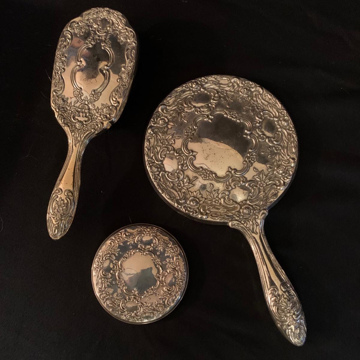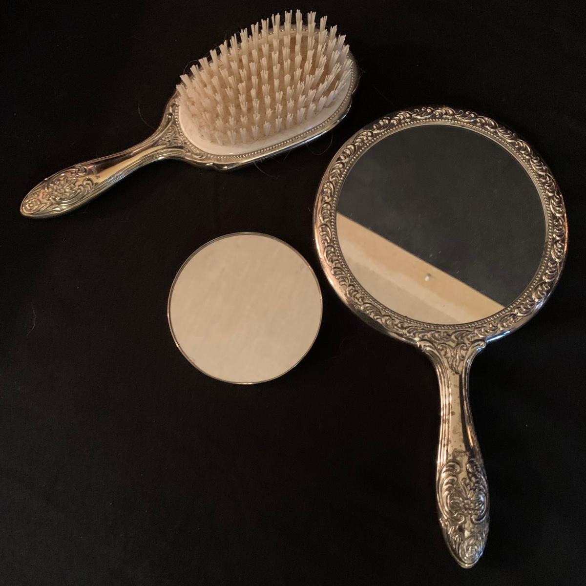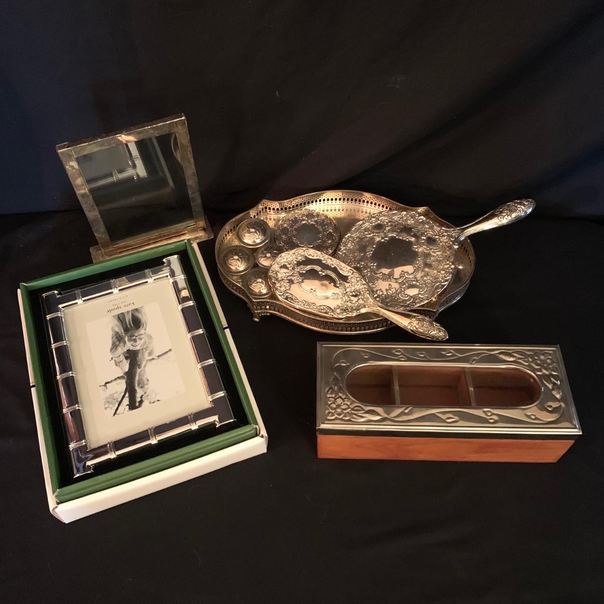 Lovely lot includes pocket mirror marked "Towle Sterling", Kate Spade silver metal plated picture frame, cedar tea box, antique style mirror and brush as well as other treasures. Please see photos for more details. Kate Spade frame measures approximately, 6” x 8.5”. Shipping available. Shipping can be costly. We suggest contacting our preferred local shipping provider, Postage Express, with dimensions and getting an estimate before bidding: (828) 670-5501 or postageexpress@yahoo.com.
