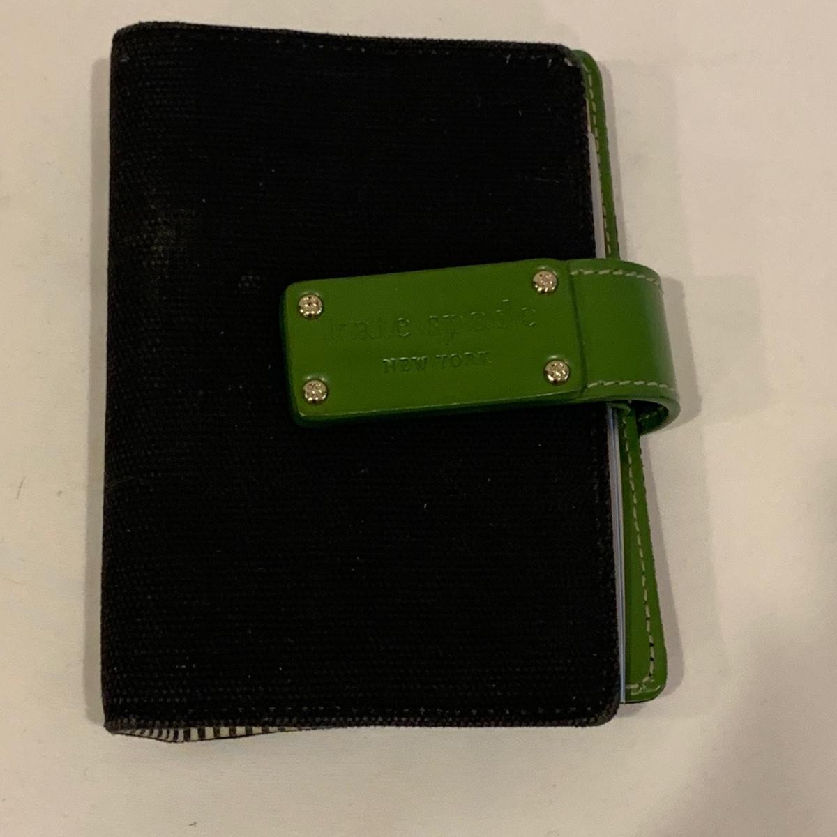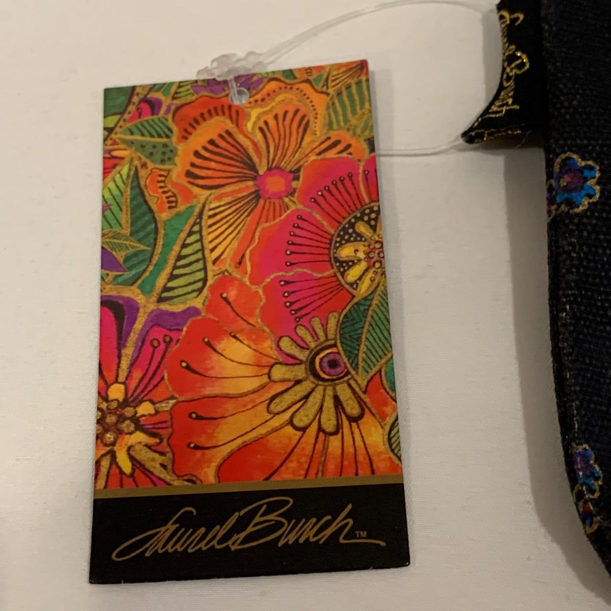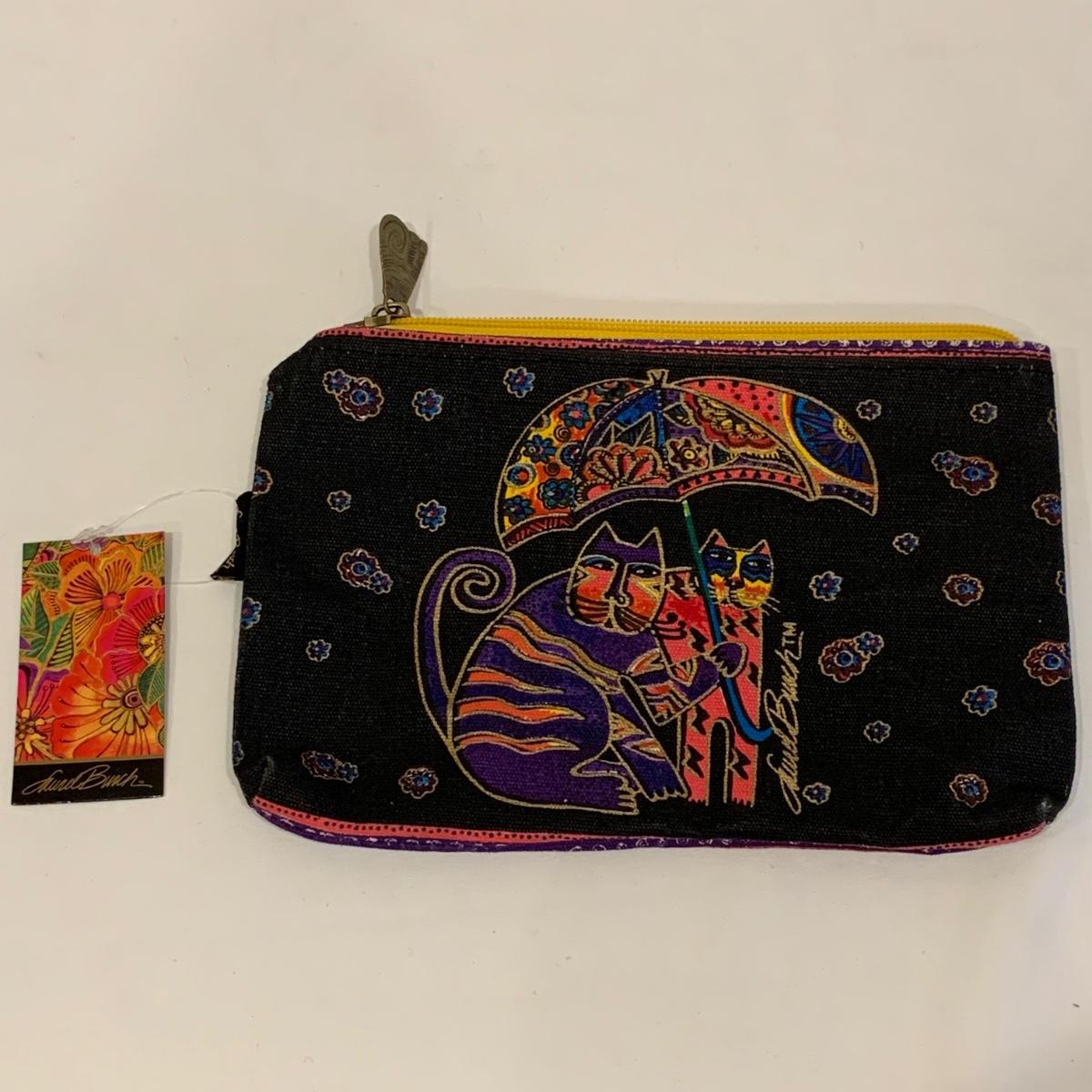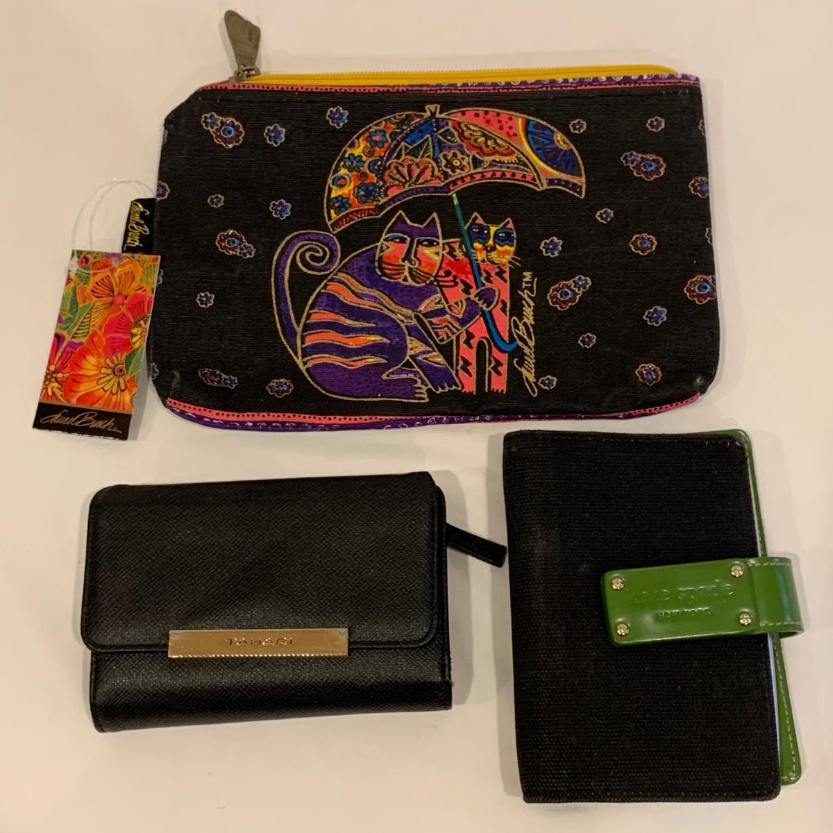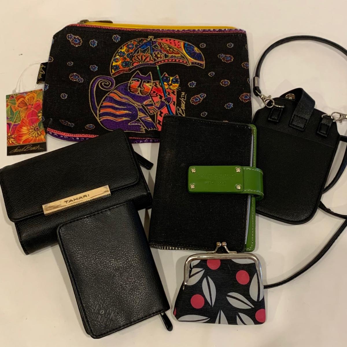 Six items total in this lot including a Kate Spade planner binder, a Tahari wallet, a Laurel Burch canvas pouch with tags attached, and three other small wallets/coin purses. Laurel Burch pouch is 10” x 6.5”.