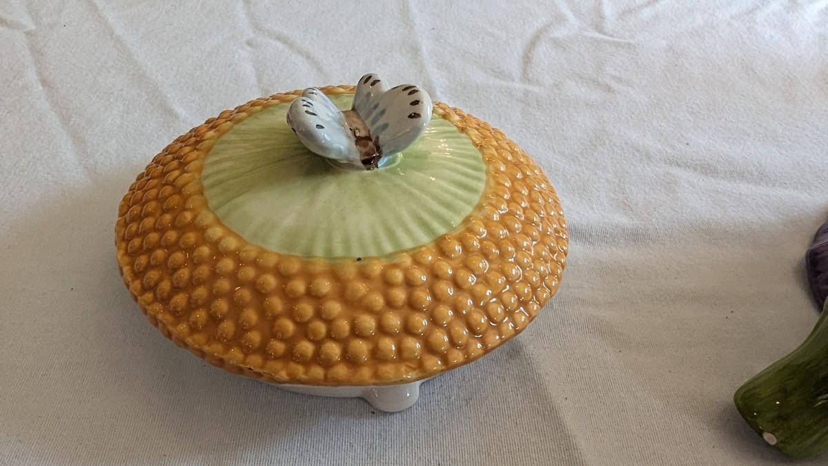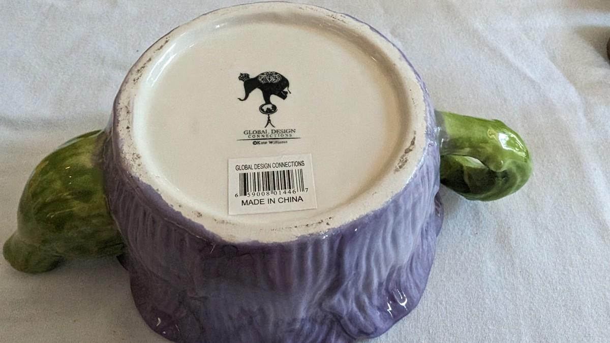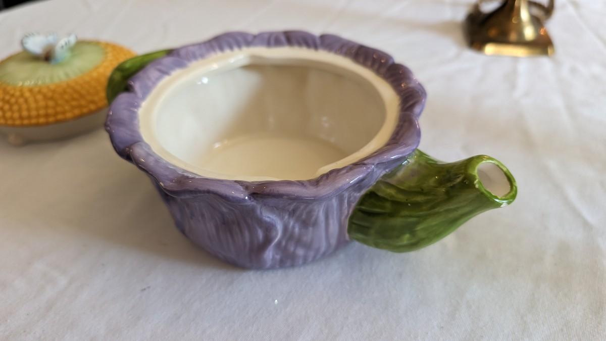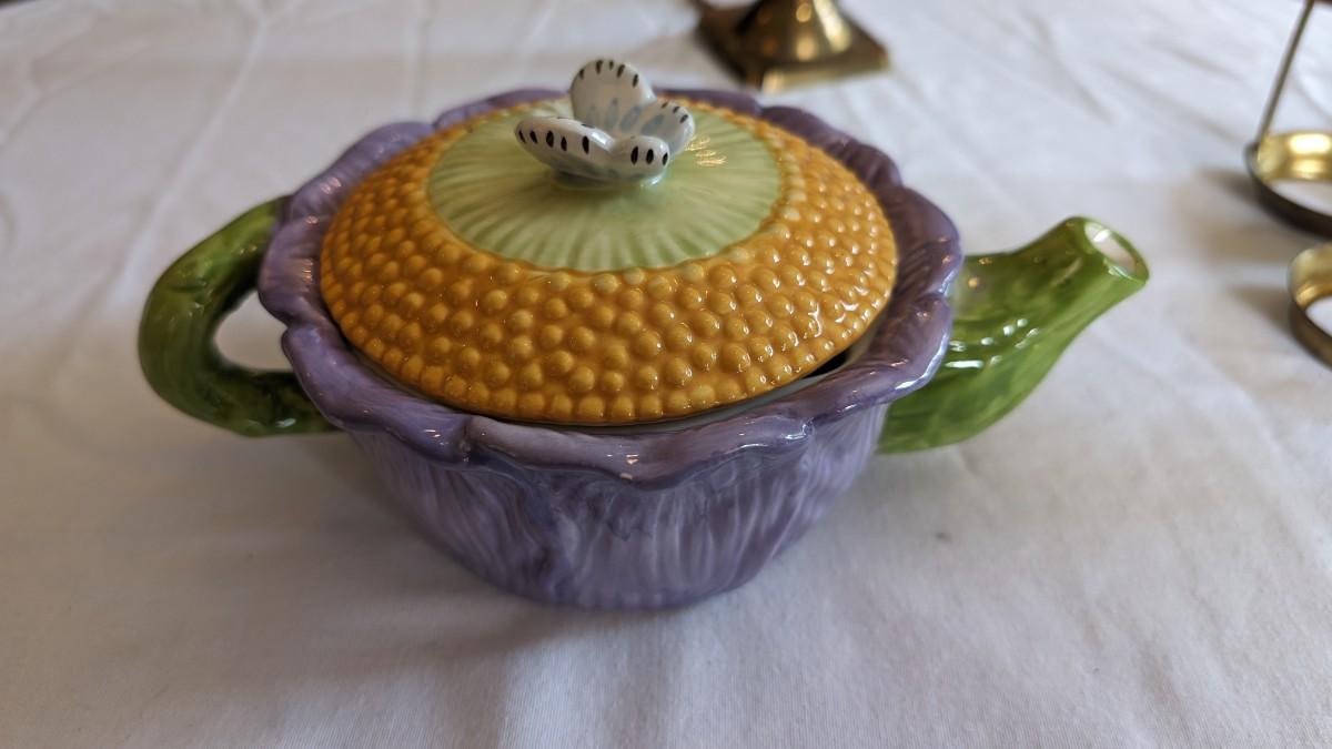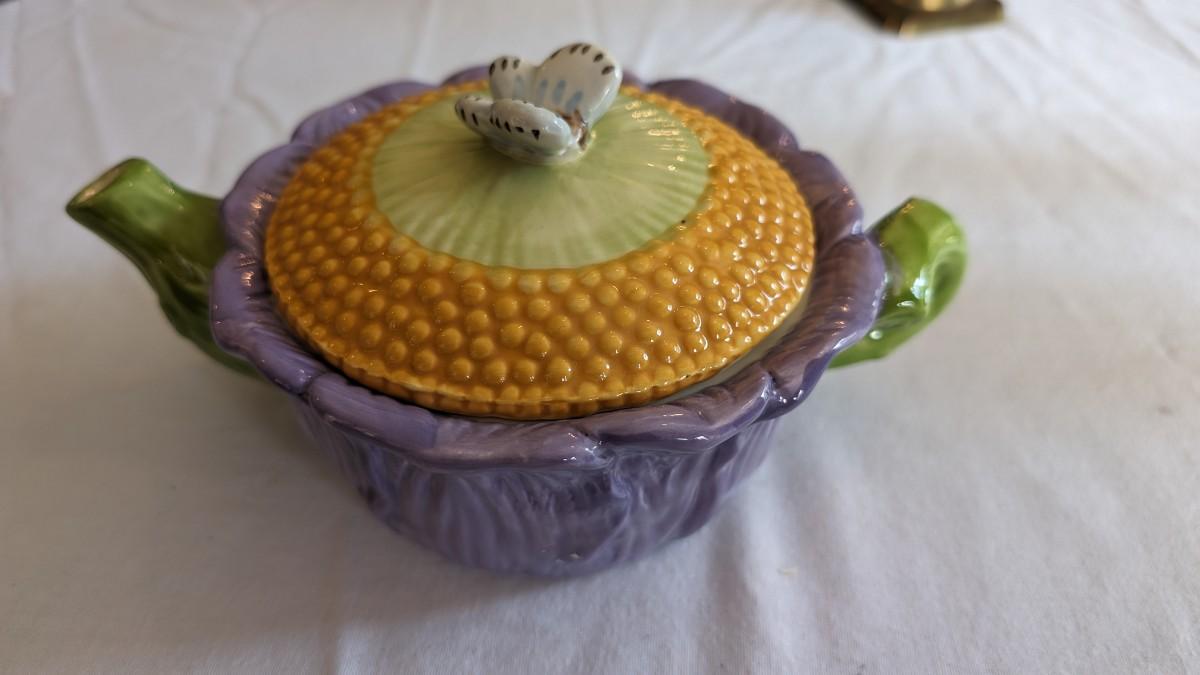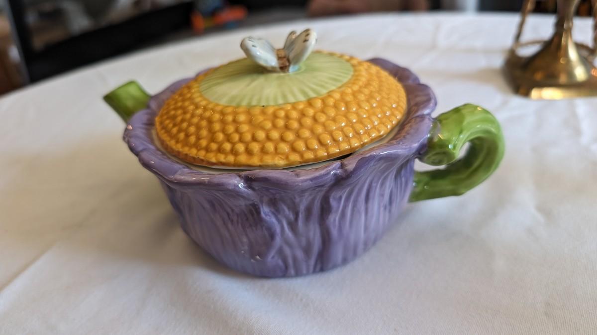This is a Kate Williams purple flower teapot with a butterfly lid handle.