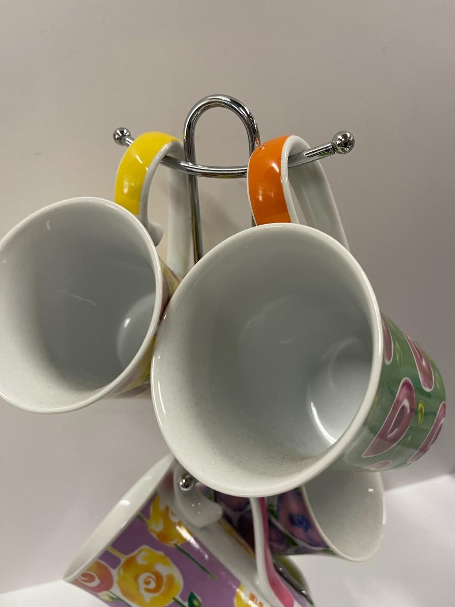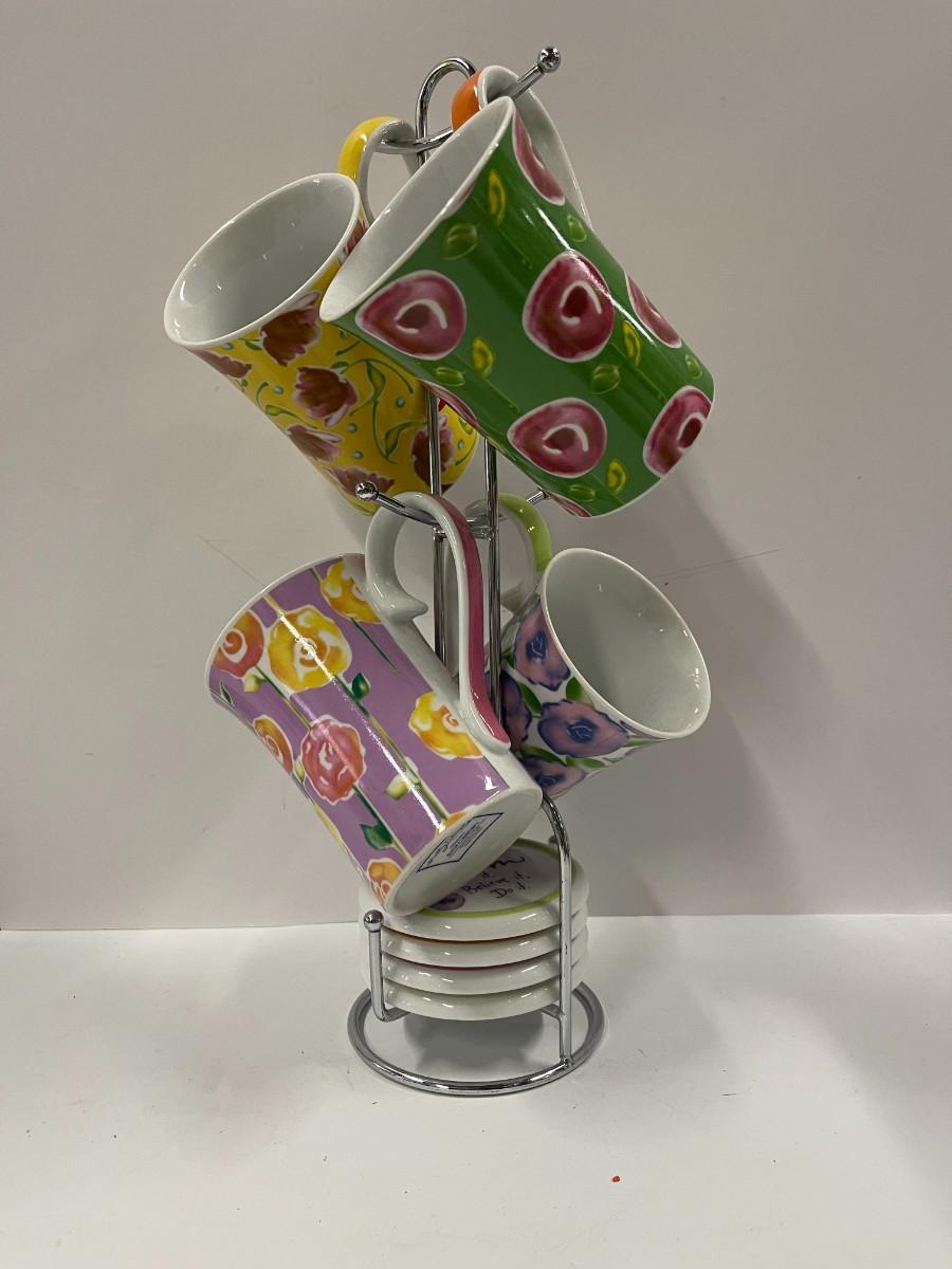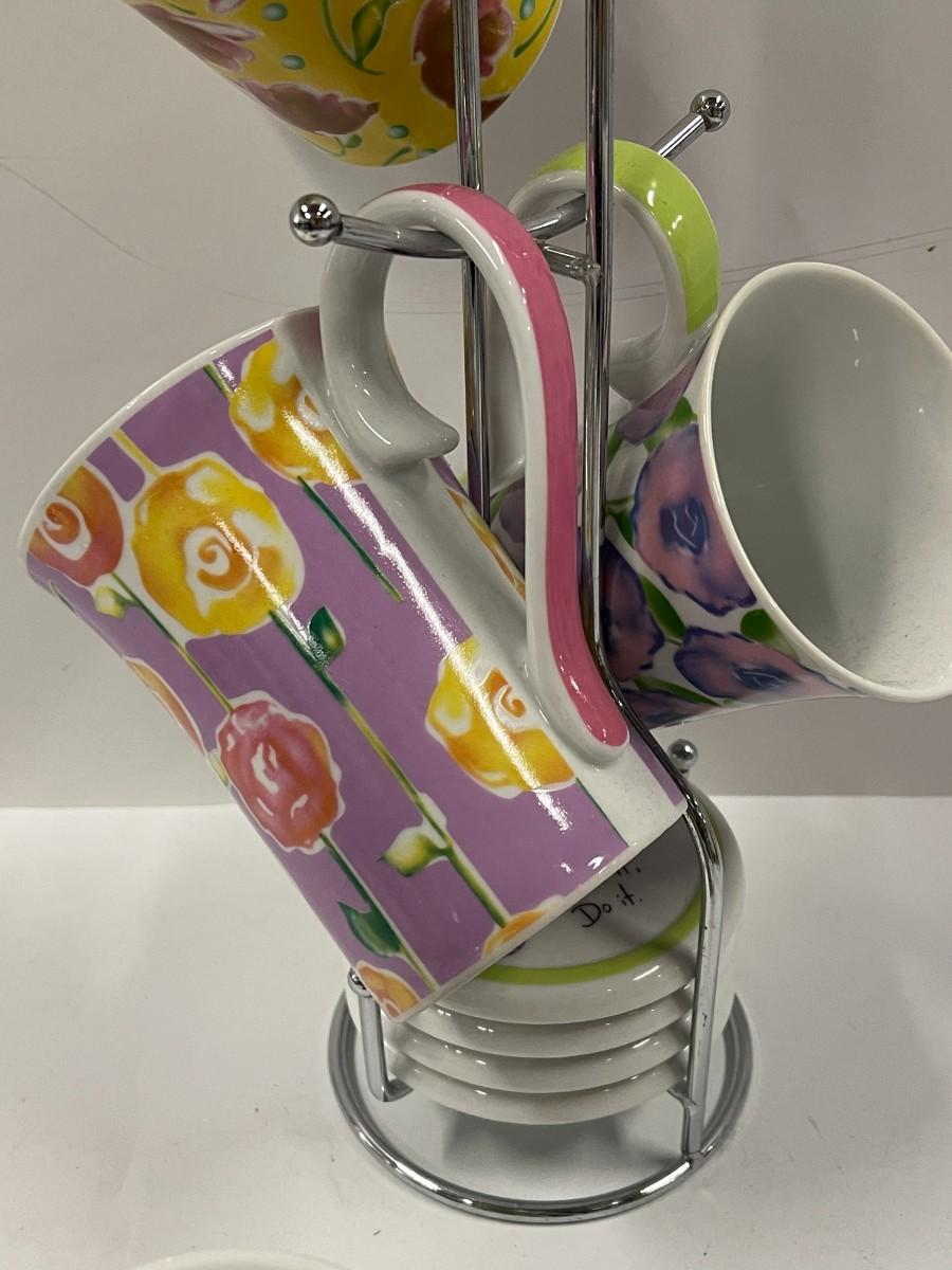 Coffee/tea cups with matching lids and caddy. Like new, unused condition. 4 mugs, 4 lids and caddy. 15" to the top.