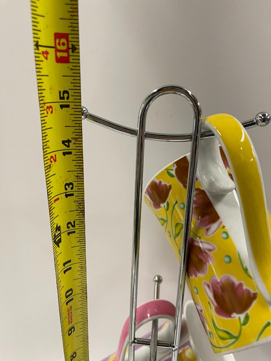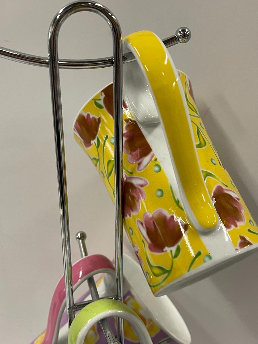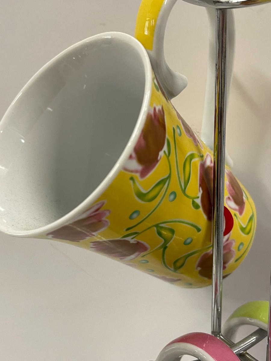 Coffee/tea cups with matching lids and caddy. Like new, unused condition. 4 mugs, 4 lids and caddy. 15" to the top.