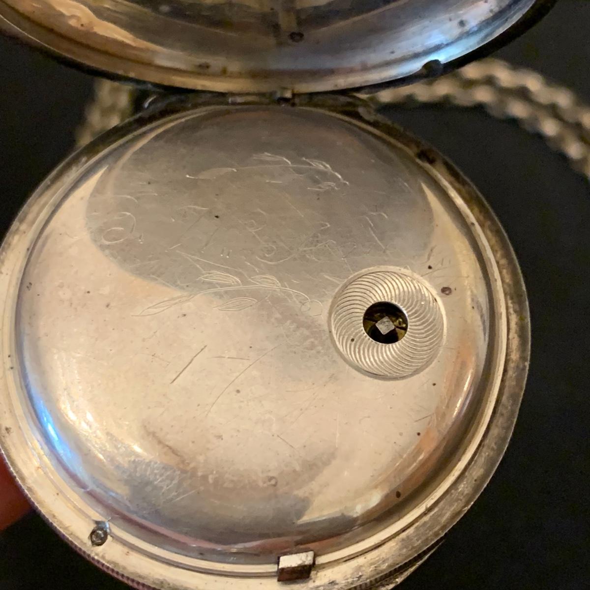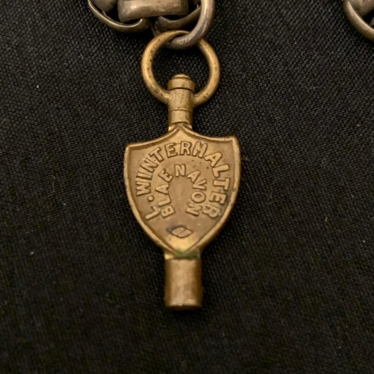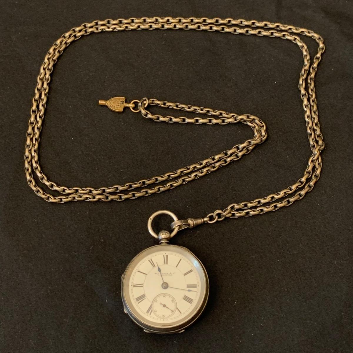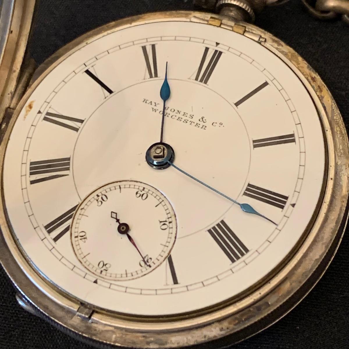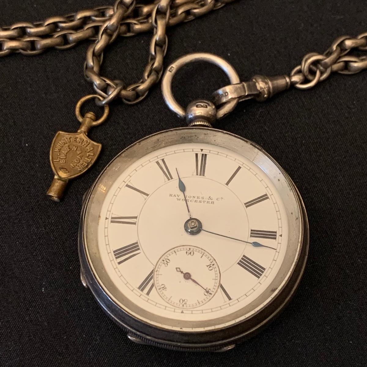 Kay Jones & Co. Worcester pocket watch. Watch is not currently working; it’s possible the key has broken off as when you put in the winding attachment it feels too loose to turn to wind. Comes with a chain that has a winding key marked “˜L. Winterhalter Blaenavon Watch Maker & Jeweller’. Chain measures approximately 58”. Pocket watch is 2”D. See photos for all markings. The inner back case is delicately engraved with “˜B. W. Jones’. Rear plate covering watch mechanics does not appear to be removed easily. Shipping available.
