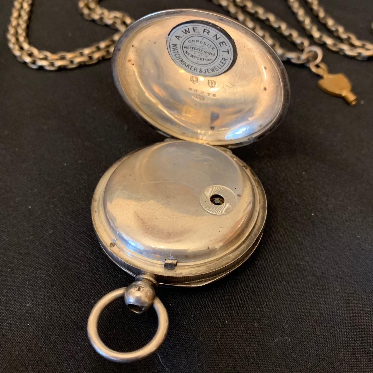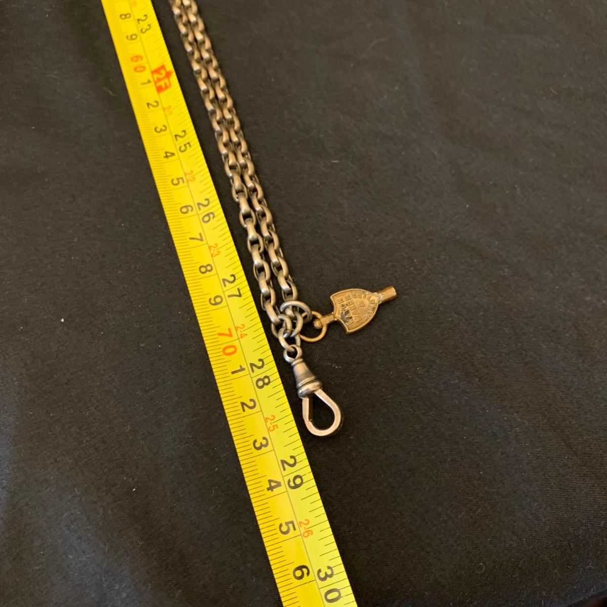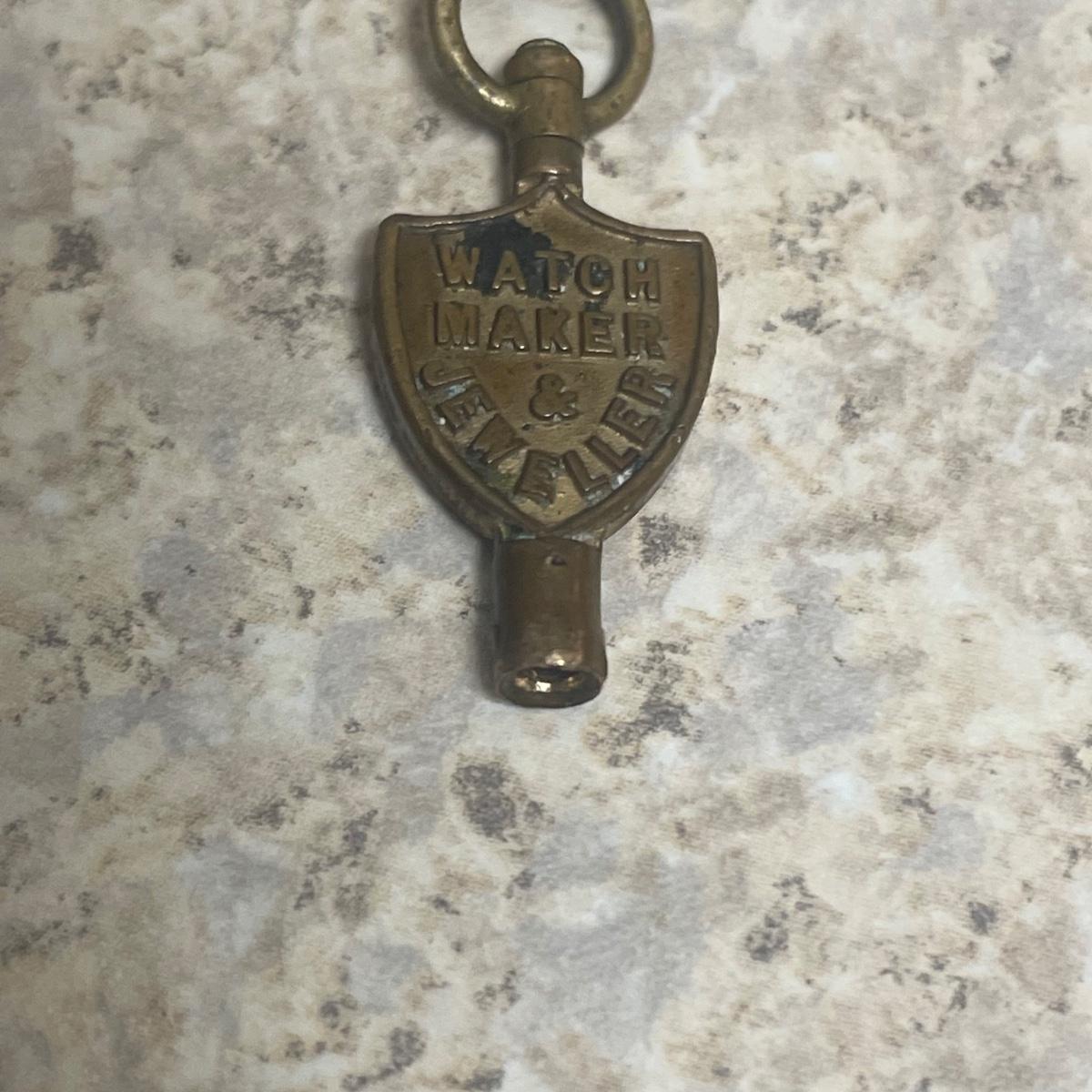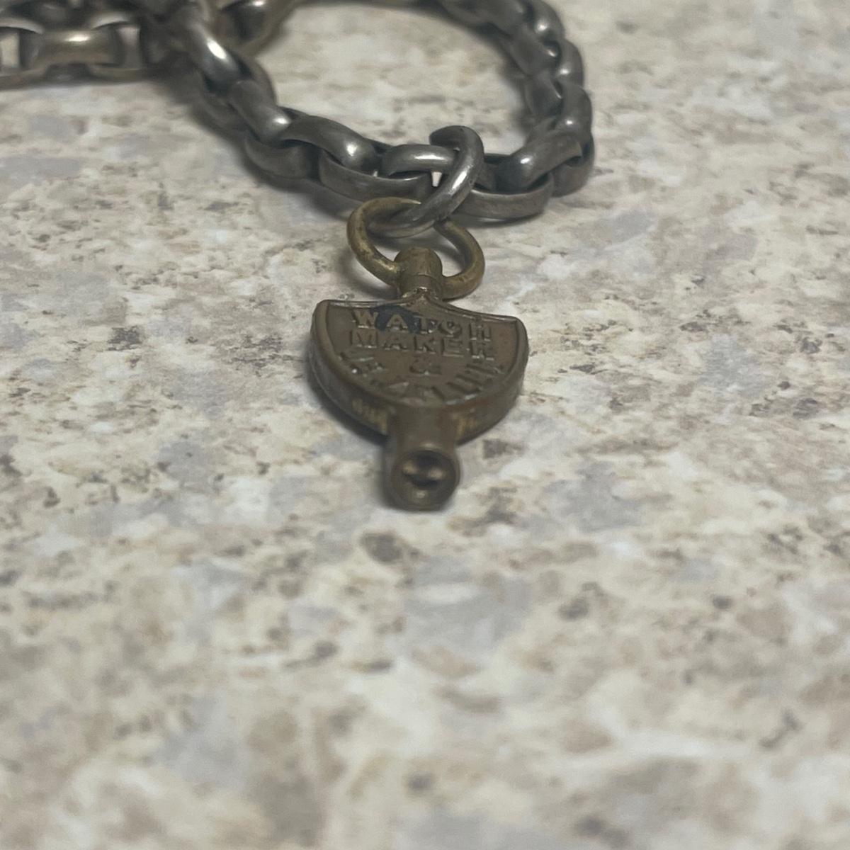 Kay Jones & Co. Worcester pocket watch. Watch is not currently working; it’s possible the key has broken off as when you put in the winding attachment it feels too loose to turn to wind. Comes with a chain that has a winding key marked “˜L. Winterhalter Blaenavon Watch Maker & Jeweller’. Chain measures approximately 58”. Pocket watch is 2”D. See photos for all markings. The inner back case is delicately engraved with “˜B. W. Jones’. Rear plate covering watch mechanics does not appear to be removed easily. Shipping available.