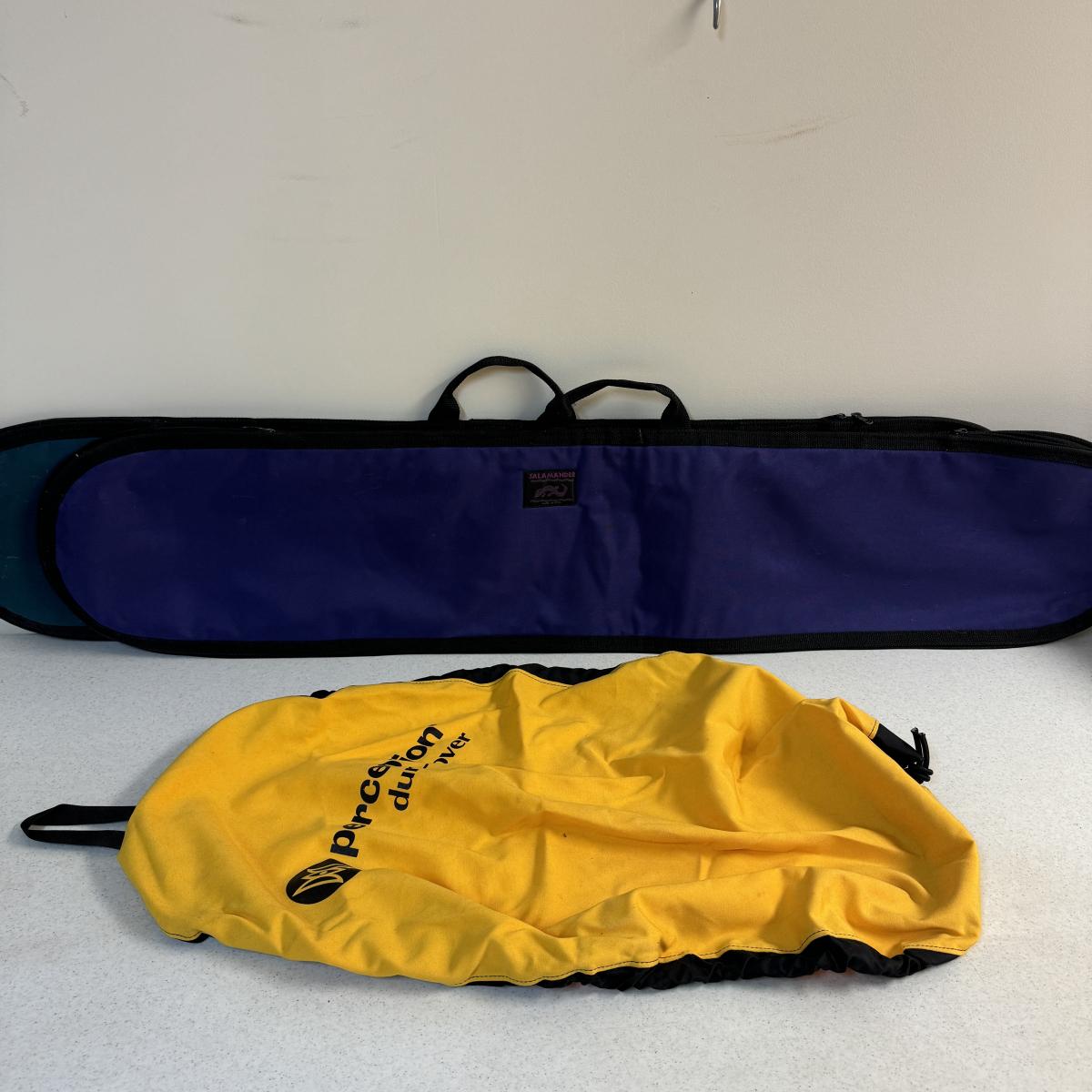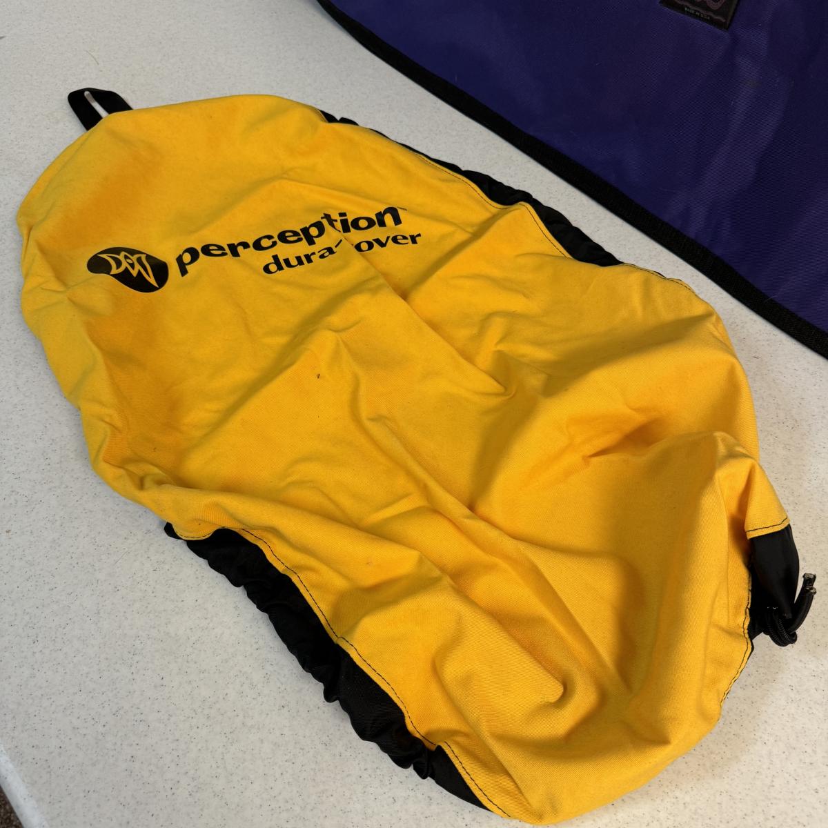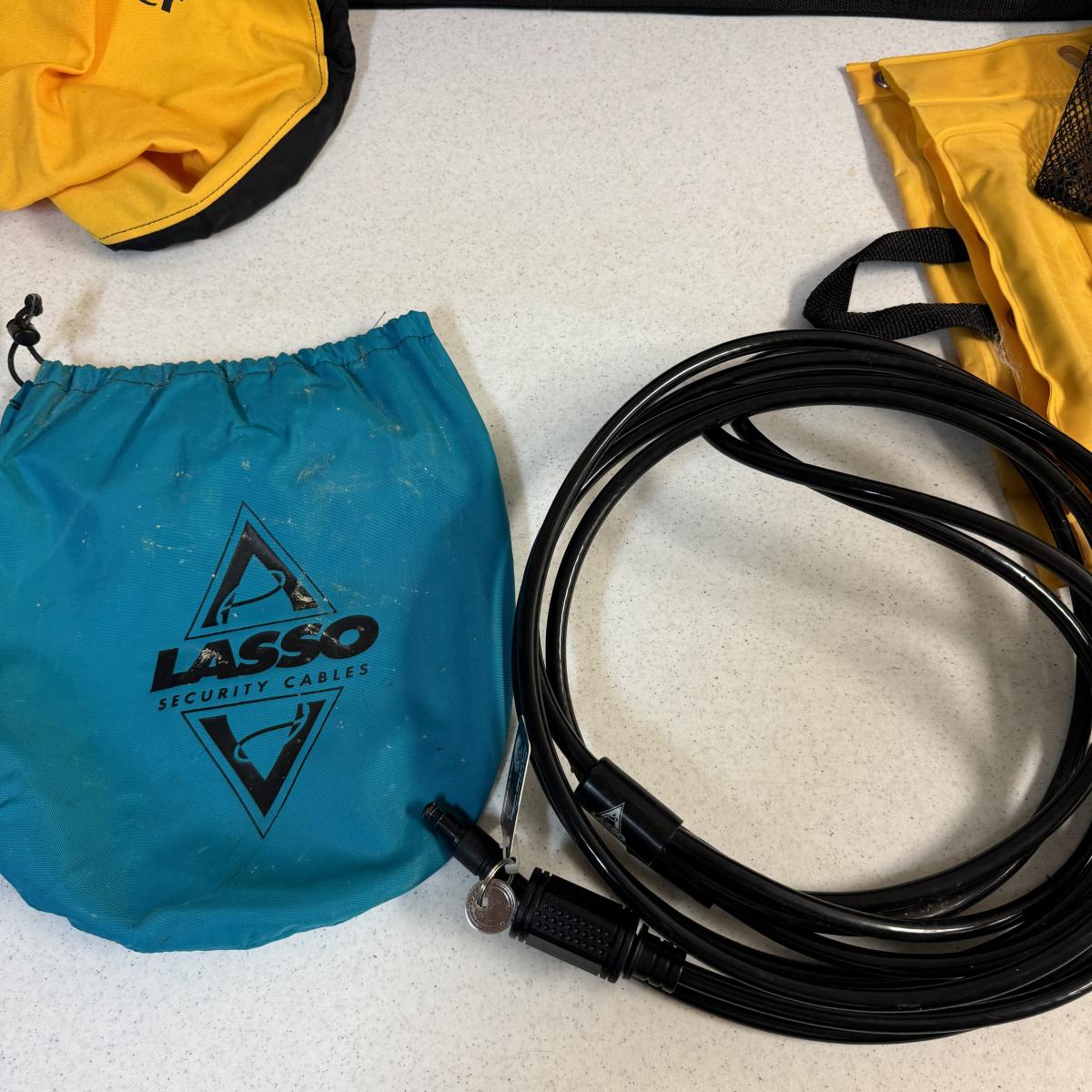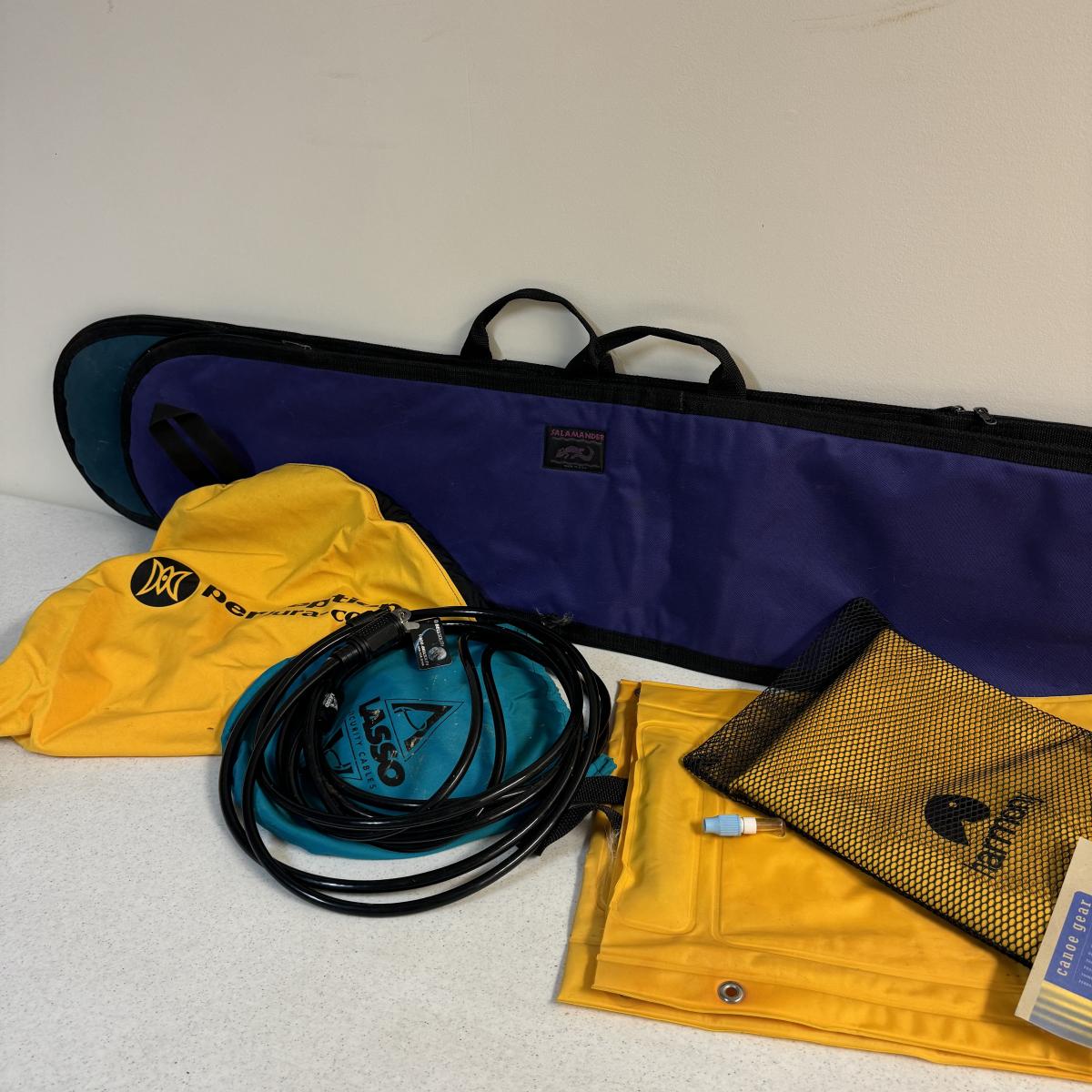 You’ll find two paddle carrying cases by Salamander that measure 50” x 11” and three Float end bags (for safety when capsized). Two bags are by Duo-Float and one is new in bag and is by Harmony. Lot also includes a Perception dura-cover and two Lasso security cables (to lock up two kayaks) with key and storage bag. Lastly there are some repair kit accessories as well as two new Dagger large D Rings. Shipping available.