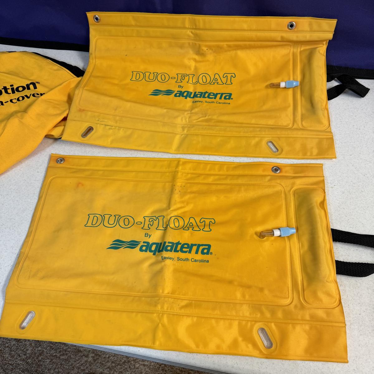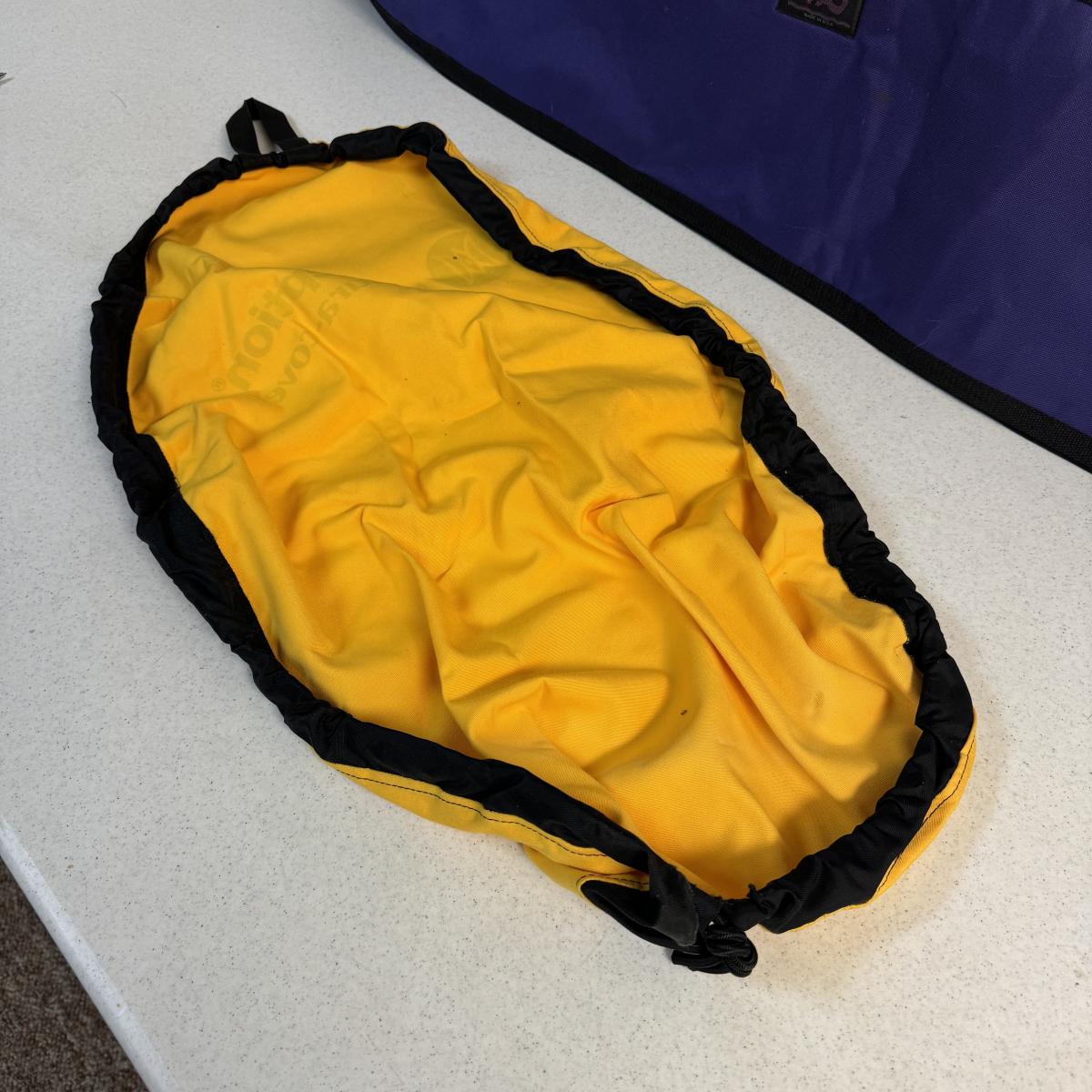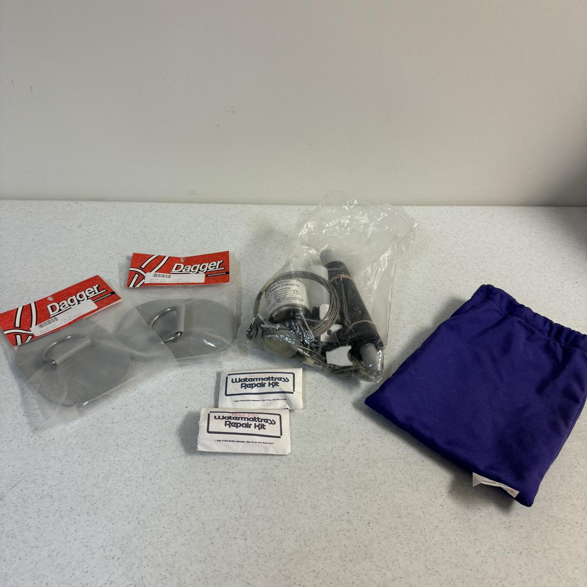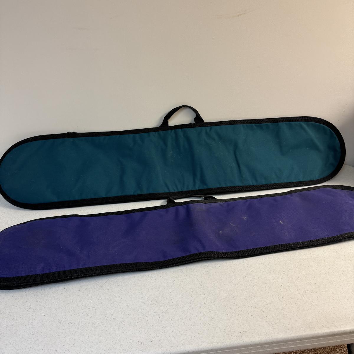 You’ll find two paddle carrying cases by Salamander that measure 50” x 11” and three Float end bags (for safety when capsized). Two bags are by Duo-Float and one is new in bag and is by Harmony. Lot also includes a Perception dura-cover and two Lasso security cables (to lock up two kayaks) with key and storage bag. Lastly there are some repair kit accessories as well as two new Dagger large D Rings. Shipping available.