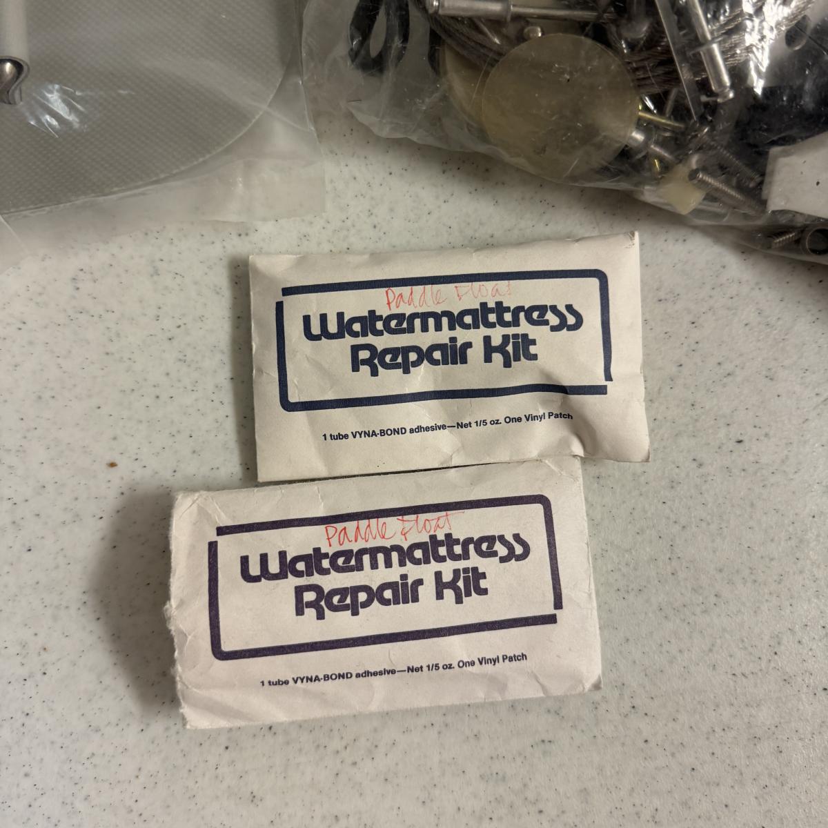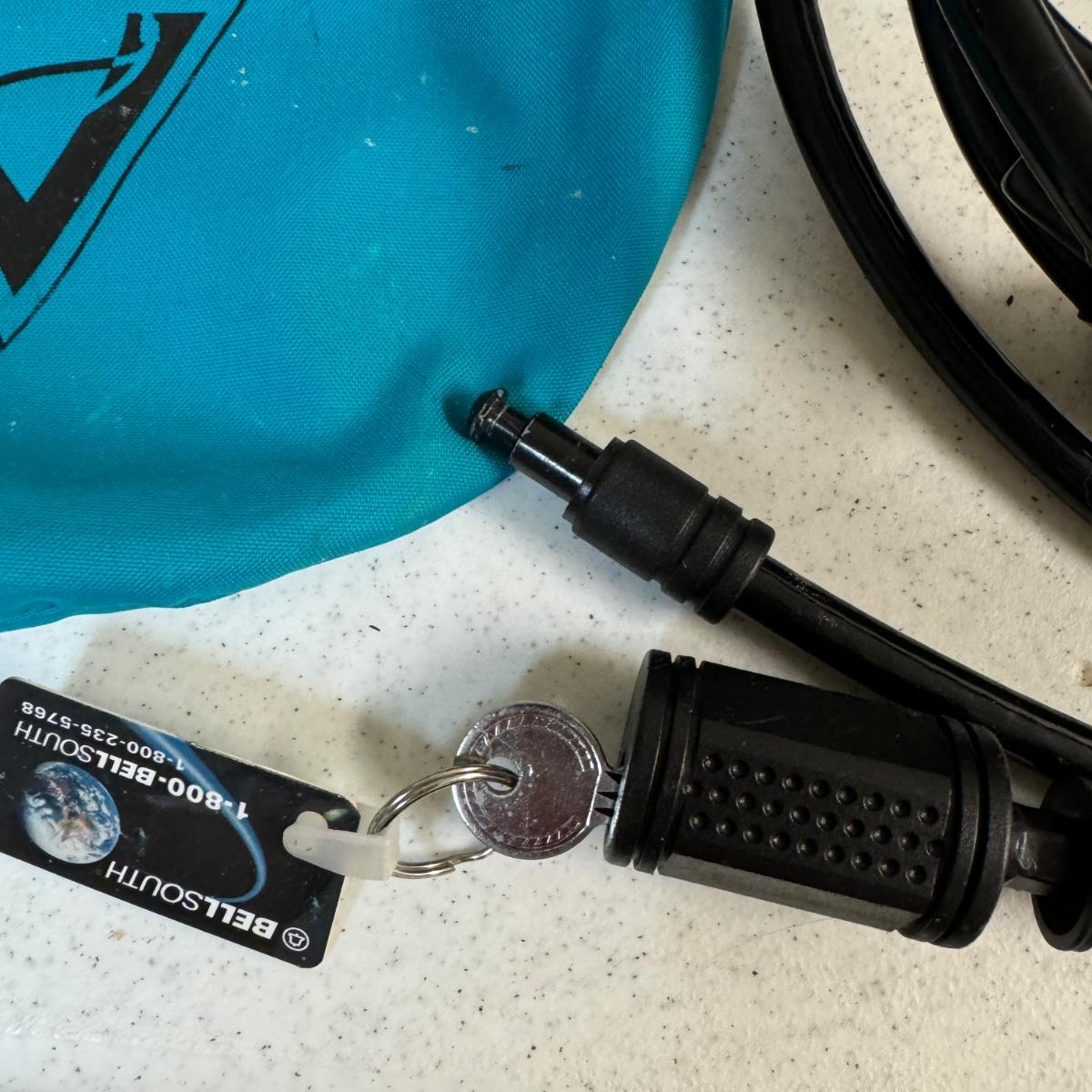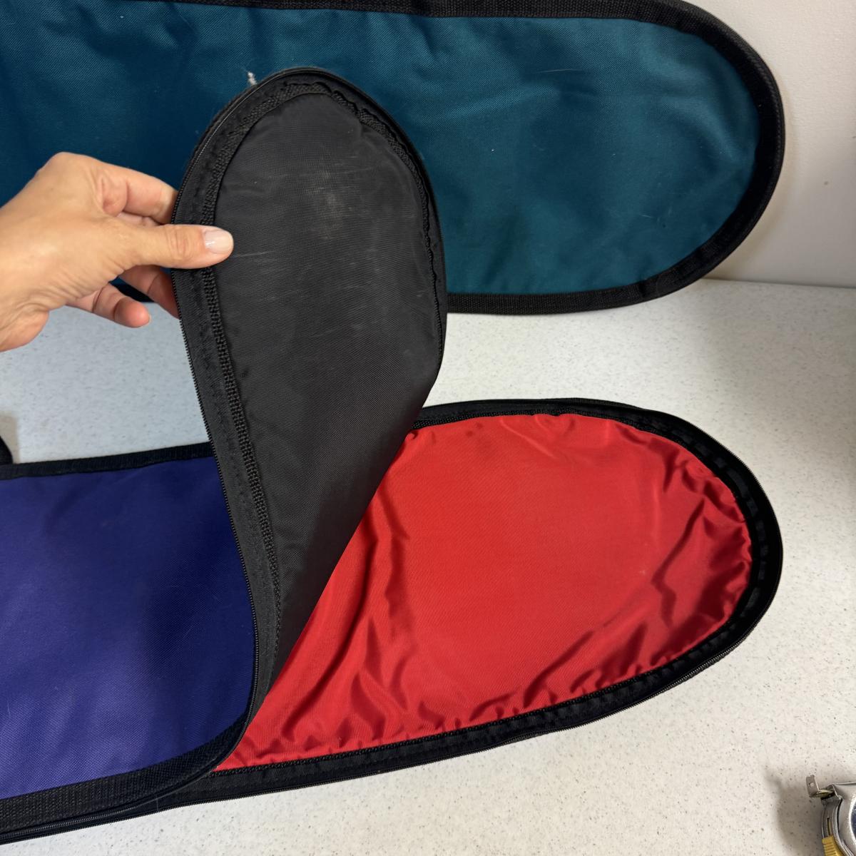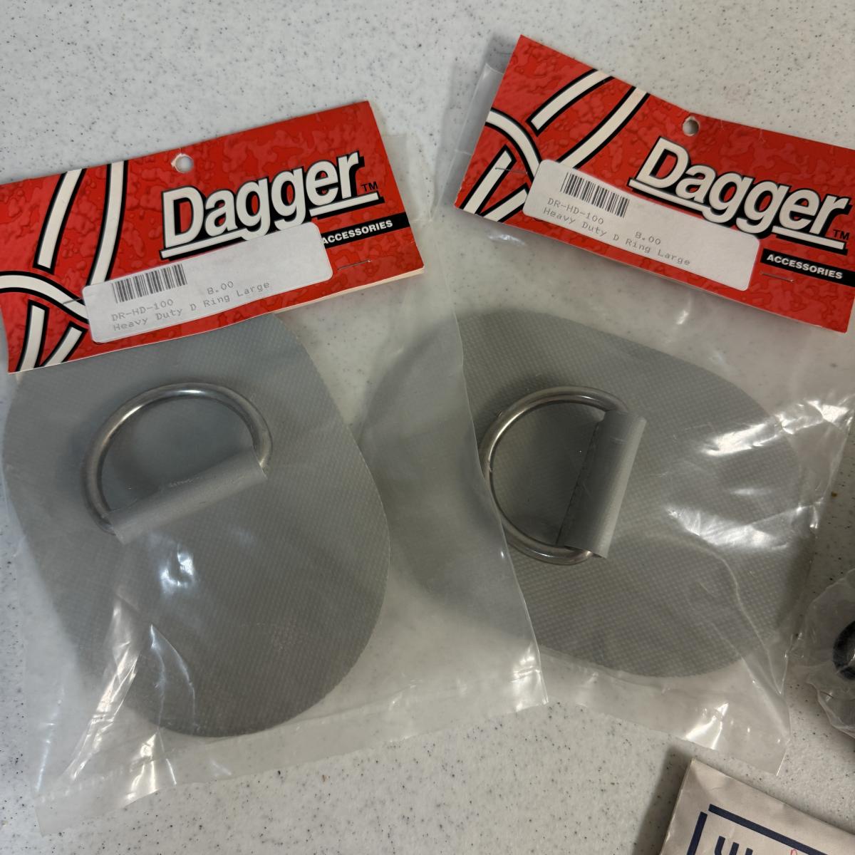 You’ll find two paddle carrying cases by Salamander that measure 50” x 11” and three Float end bags (for safety when capsized). Two bags are by Duo-Float and one is new in bag and is by Harmony. Lot also includes a Perception dura-cover and two Lasso security cables (to lock up two kayaks) with key and storage bag. Lastly there are some repair kit accessories as well as two new Dagger large D Rings. Shipping available.