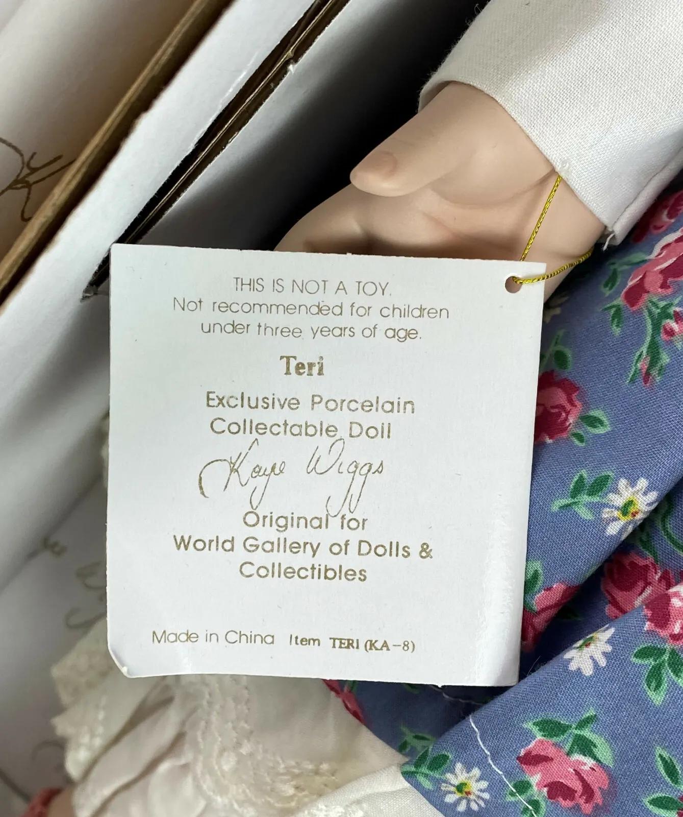 New in the box here is Teri an Exclusive Porcelain Collectible Doll by artist Kaye Wiggs...Chosen as Doll of the Year in 1996...for Artist International/World Gallery of Dolls & Collectibles...24" tall...Limited edition #1547/2000...Dressed in a cute jean outfit with bonnet and rag doll....
