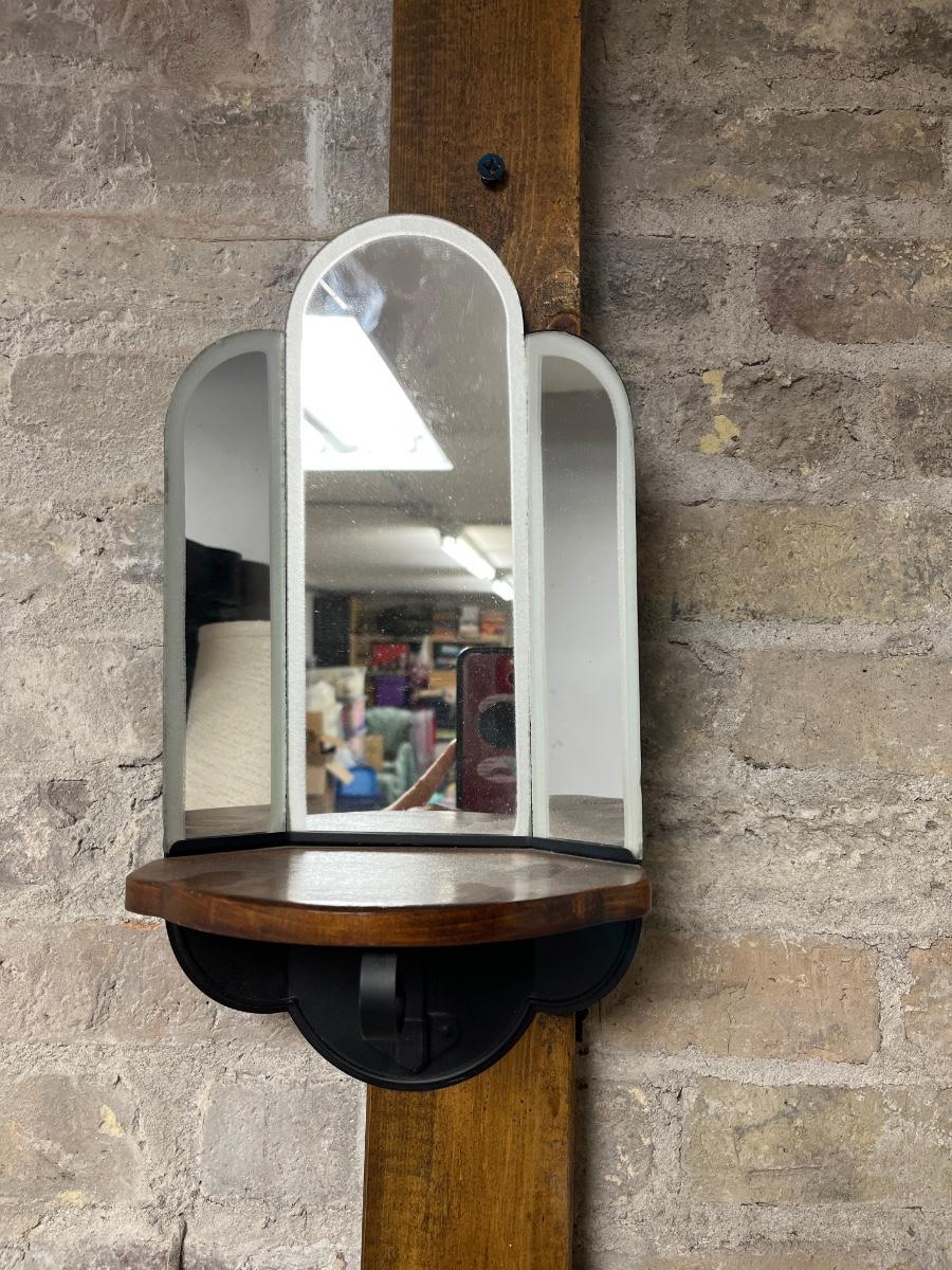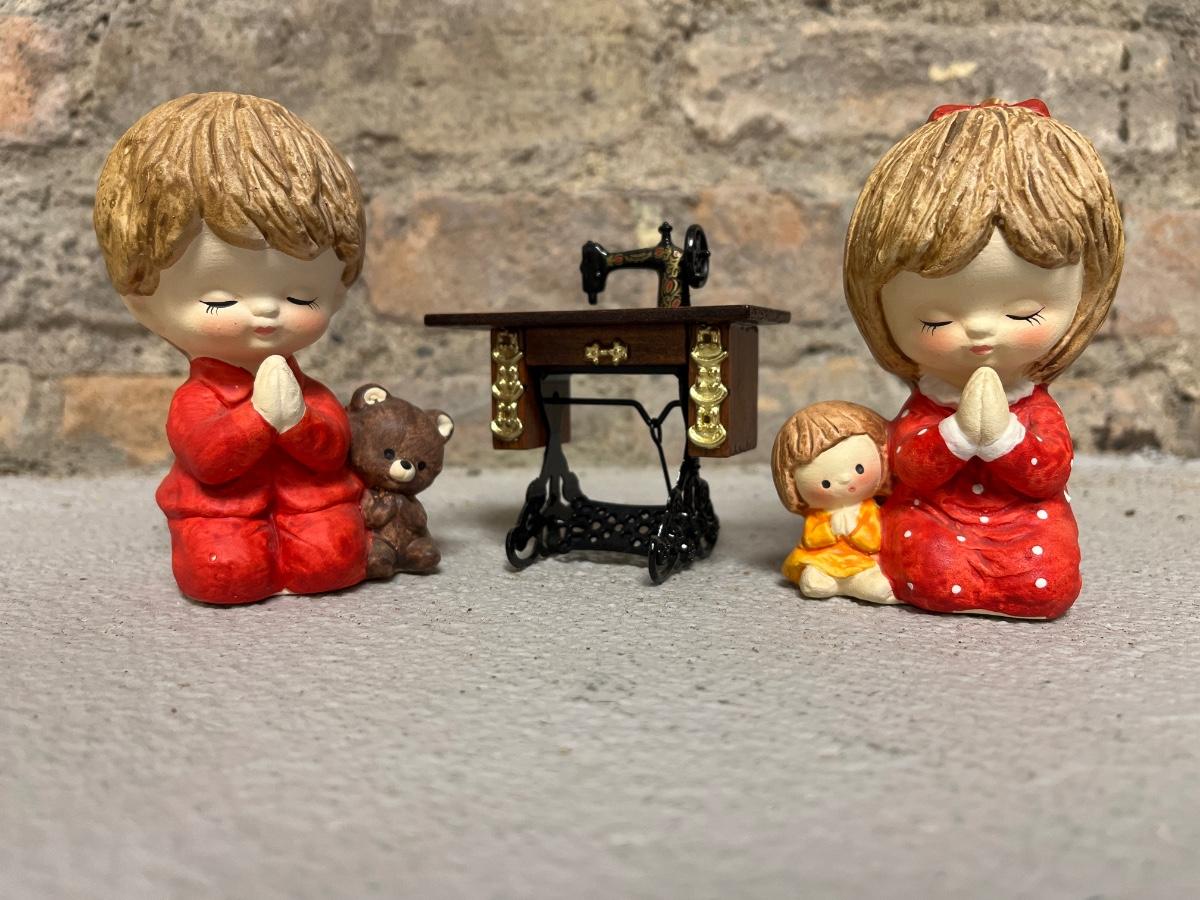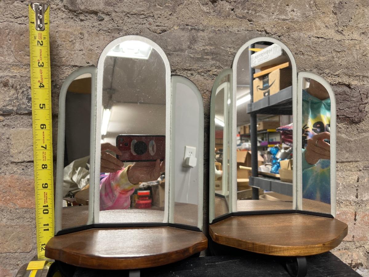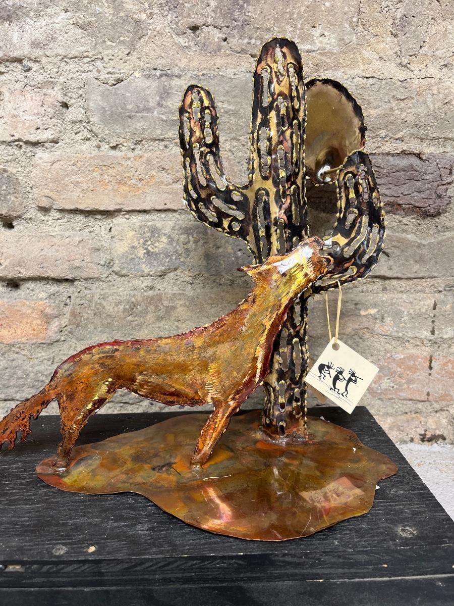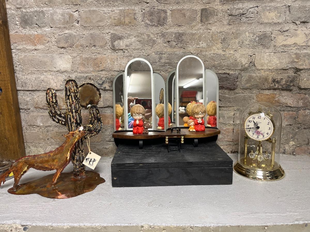 Cute Pair of Praying Children, Pair of mirrored angle hanging shelves, an anniversary clock and Metal Coyote/Cactus sculpture.