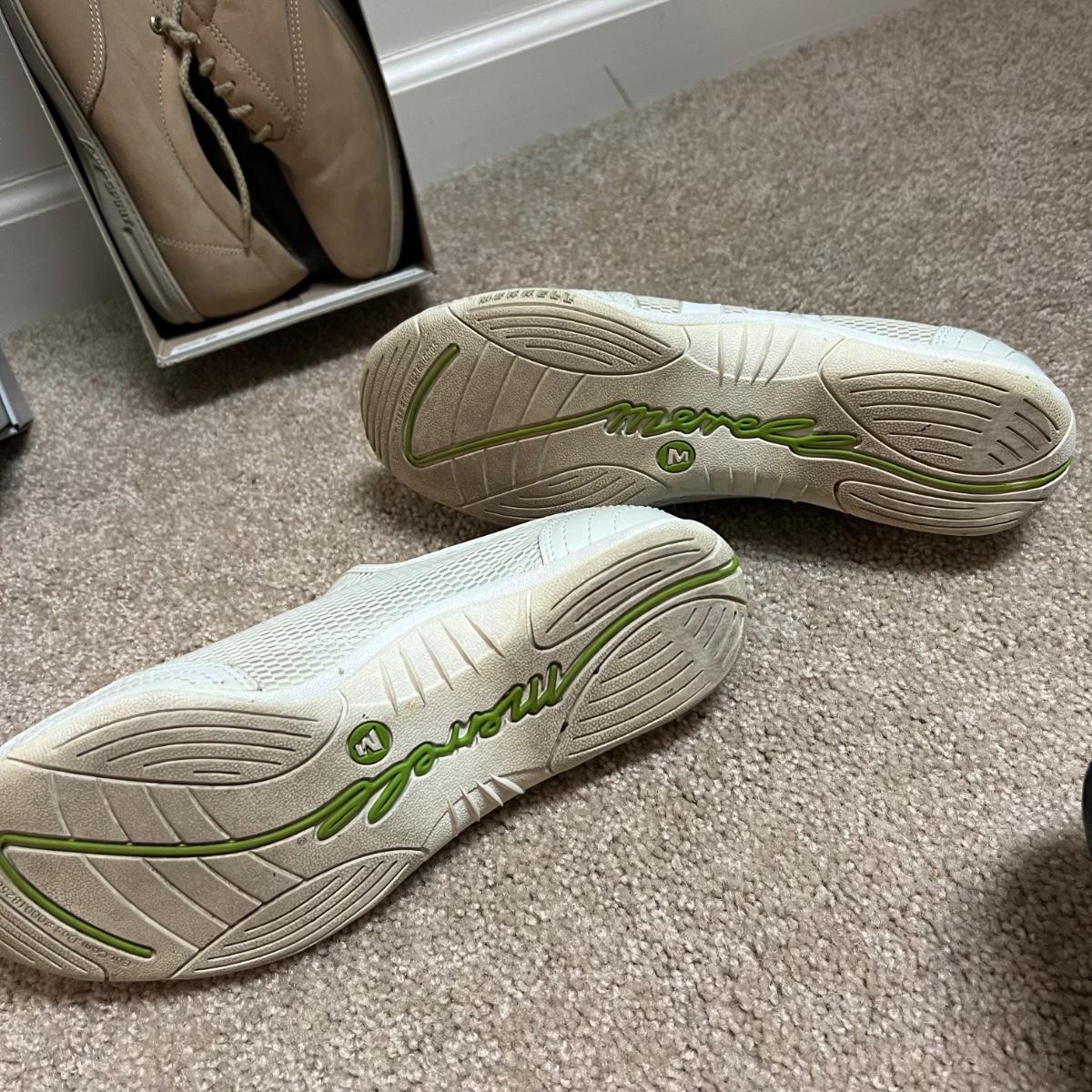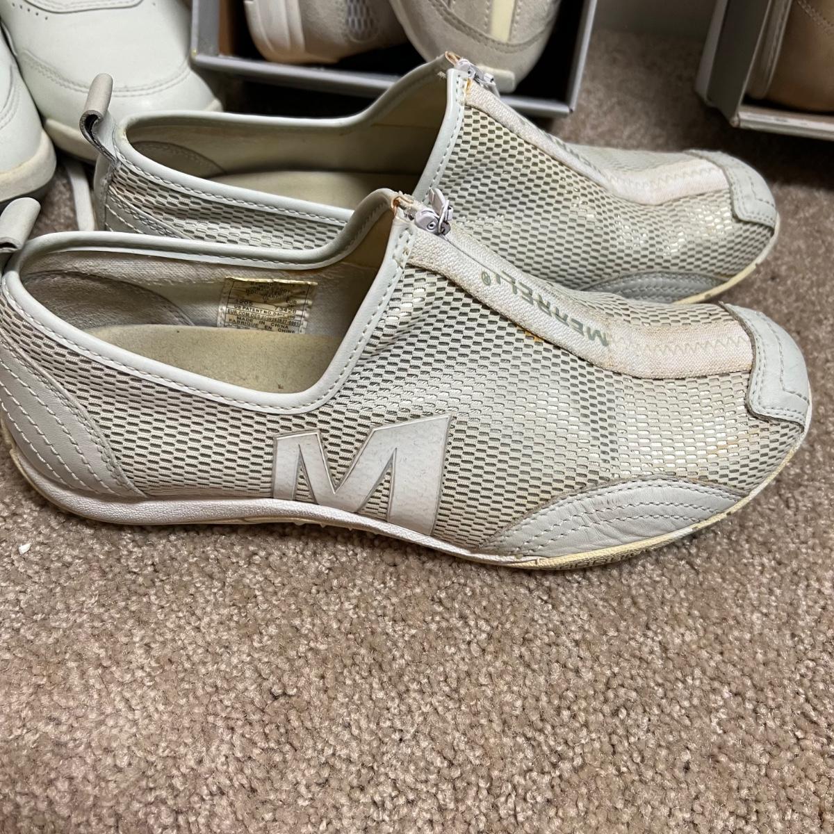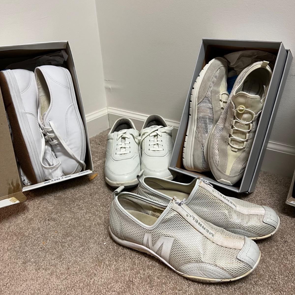 Five pairs of light colored sneakers with some great brand names. All are size 8.5, see images for brands. Merrell shoes are slightly dirty, see image.