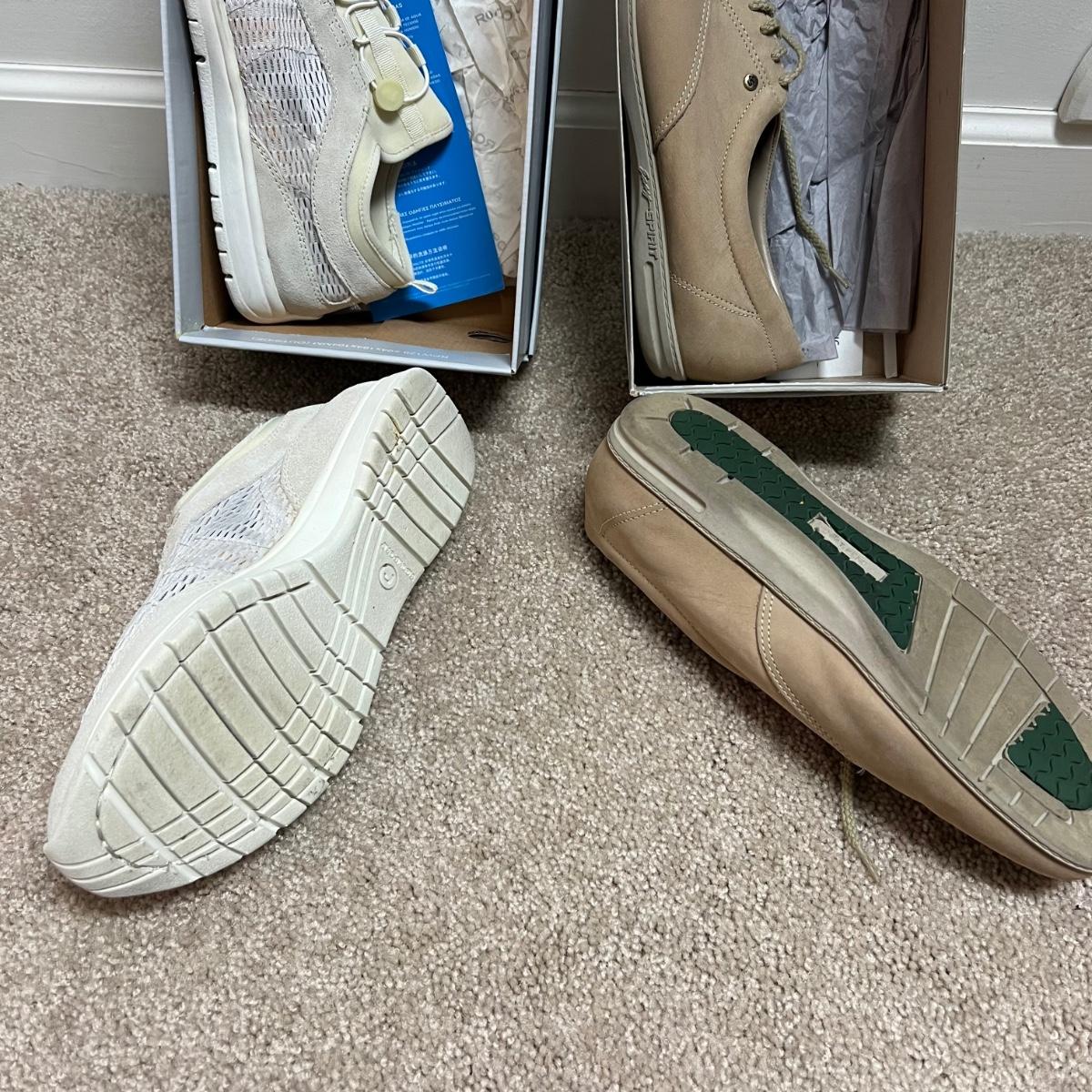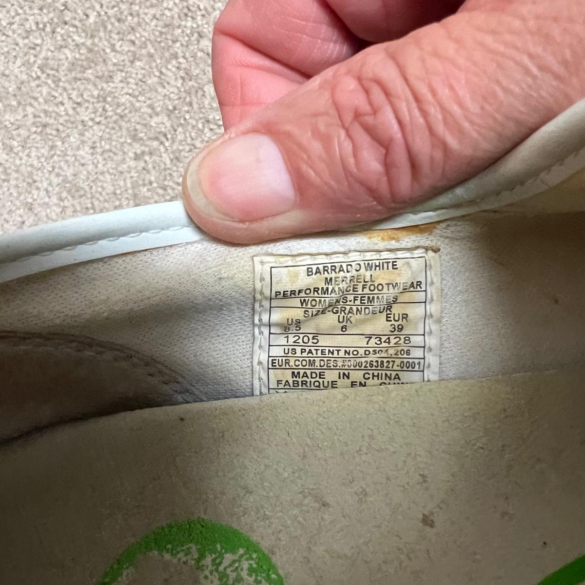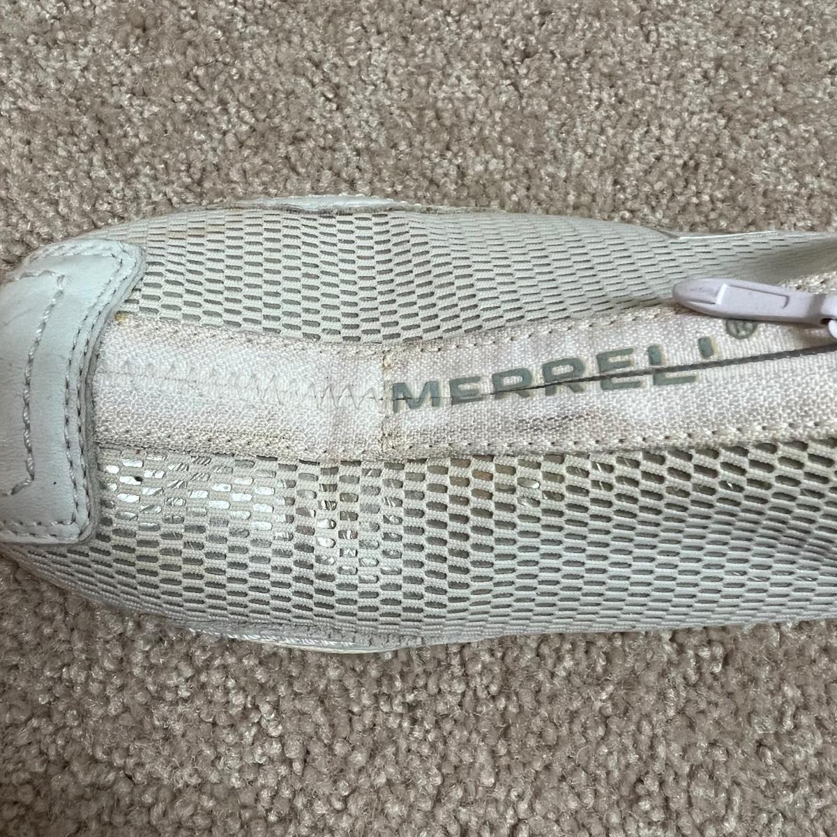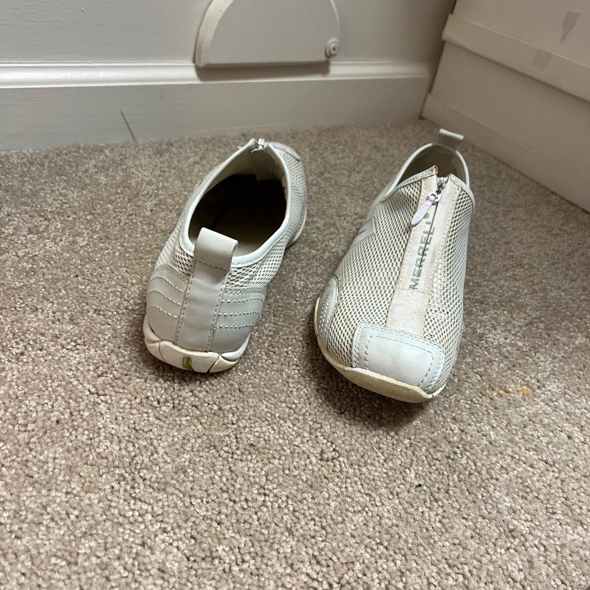 Five pairs of light colored sneakers with some great brand names. All are size 8.5, see images for brands. Merrell shoes are slightly dirty, see image.