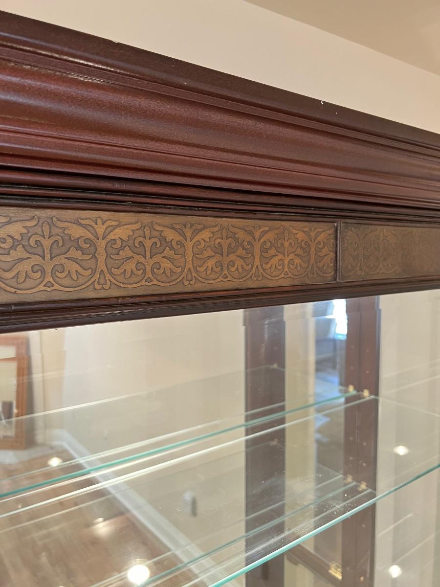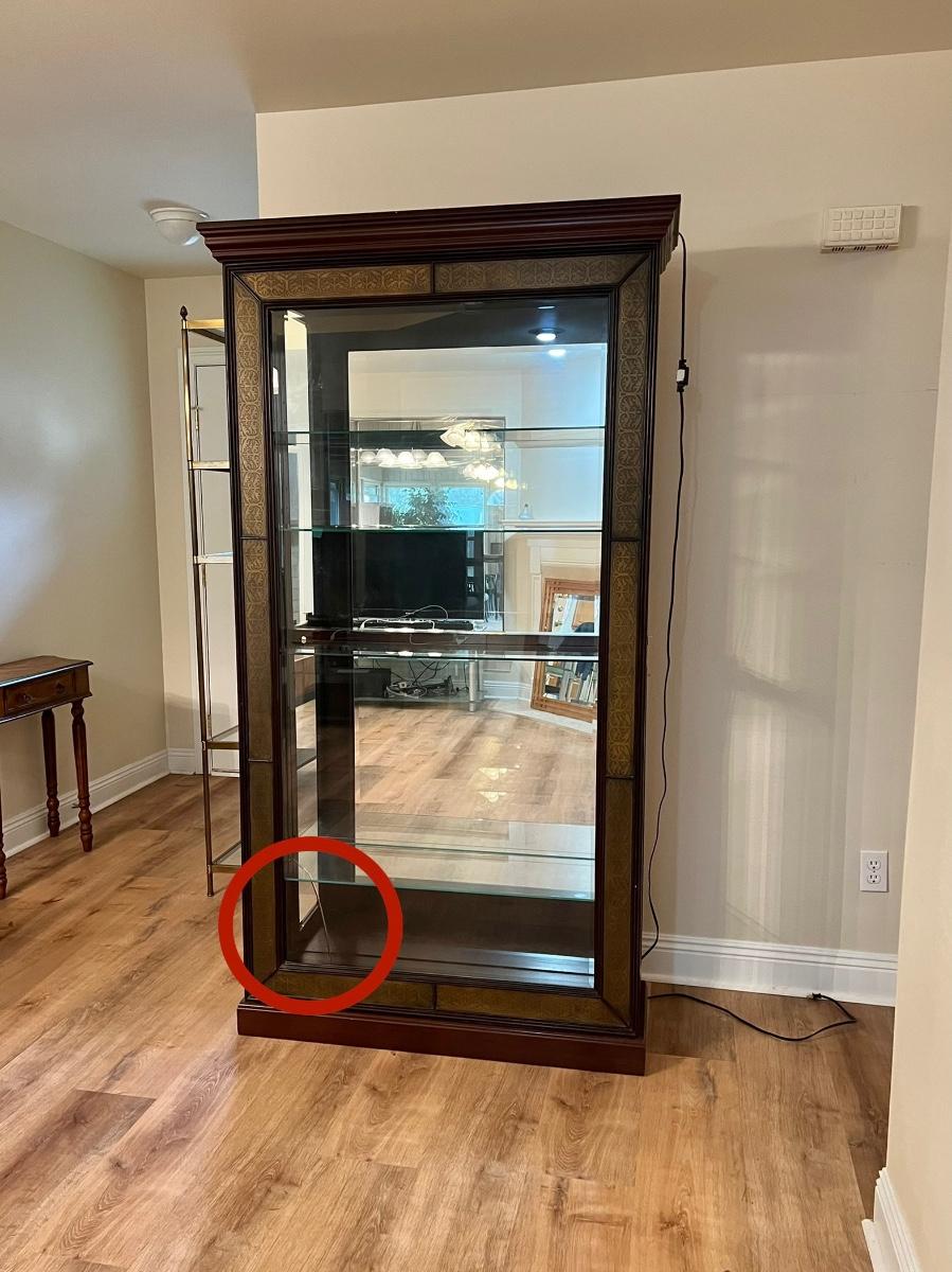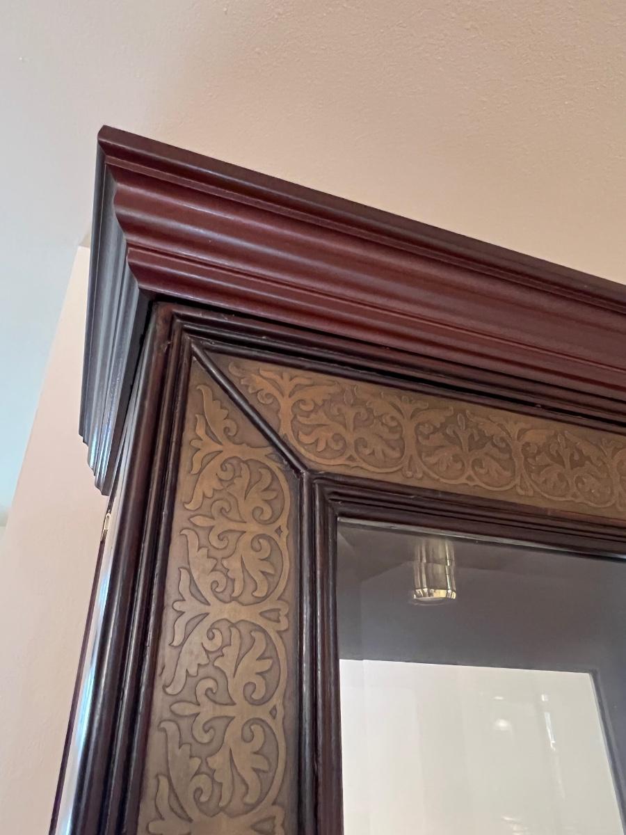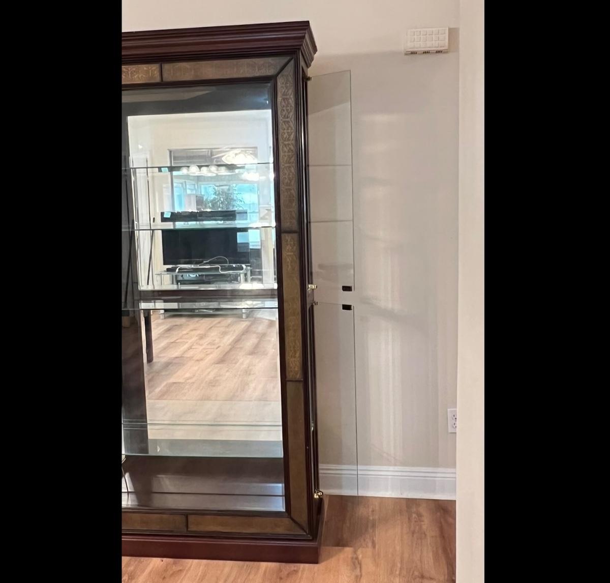This beautiful cabinet has 2 modes for ambience lighting. The entry to the cabinet are through the sides. Inlay around the outer cabinet is a decorative brass inlay. Has 5 shelves, one shelf has a chip in the corner. See photo. Needs some repair to the back to secure the mirror. Please note that the Mirror is cracked in lower left corner. Will need a little extra care when moving. See photo 79” H x 43 W x 15” D