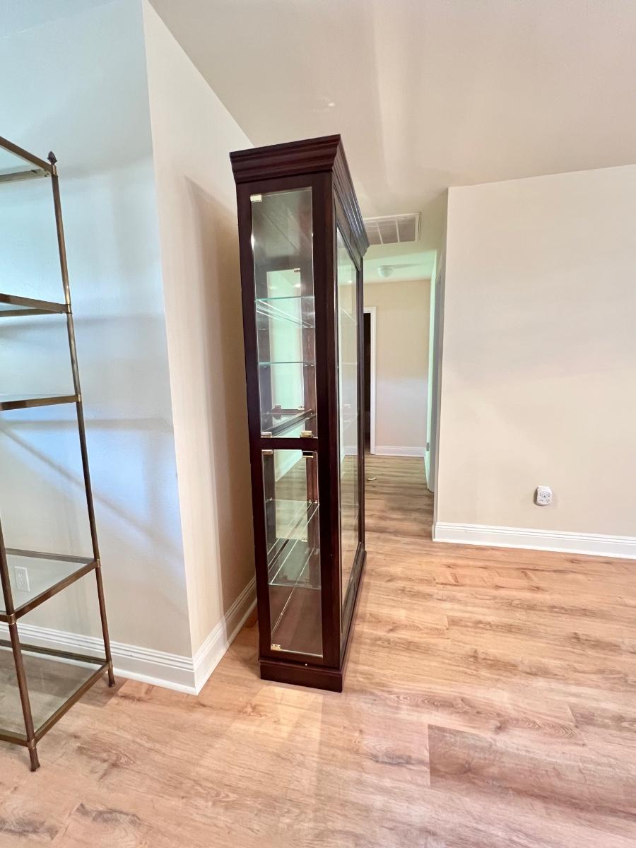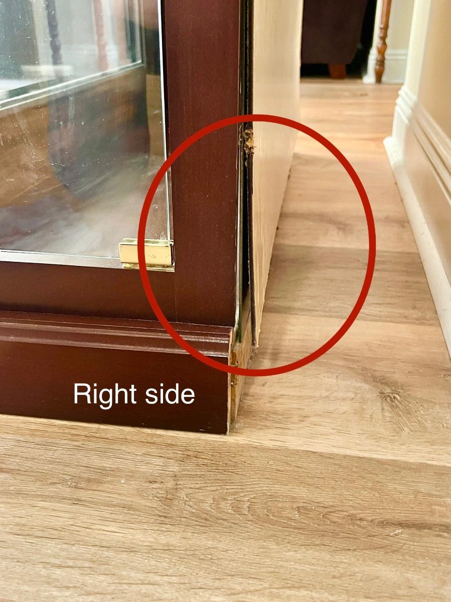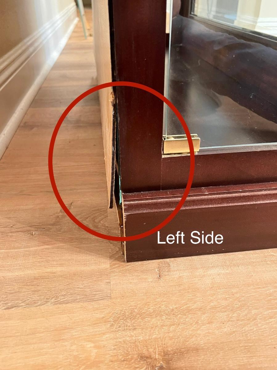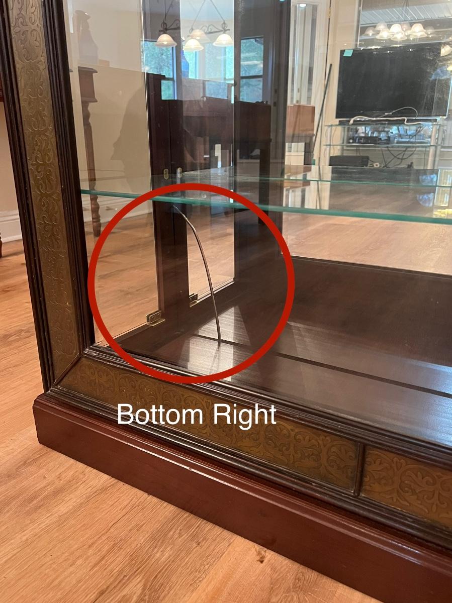 This beautiful cabinet has 2 modes for ambience lighting. The entry to the cabinet are through the sides. Inlay around the outer cabinet is a decorative brass inlay. Has 5 shelves, one shelf has a chip in the corner. See photo. Needs some repair to the back to secure the mirror. Please note that the Mirror is cracked in lower left corner. Will need a little extra care when moving. See photo 79” H x 43 W x 15” D