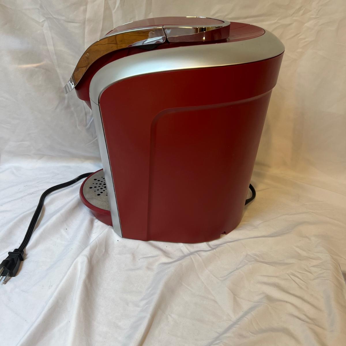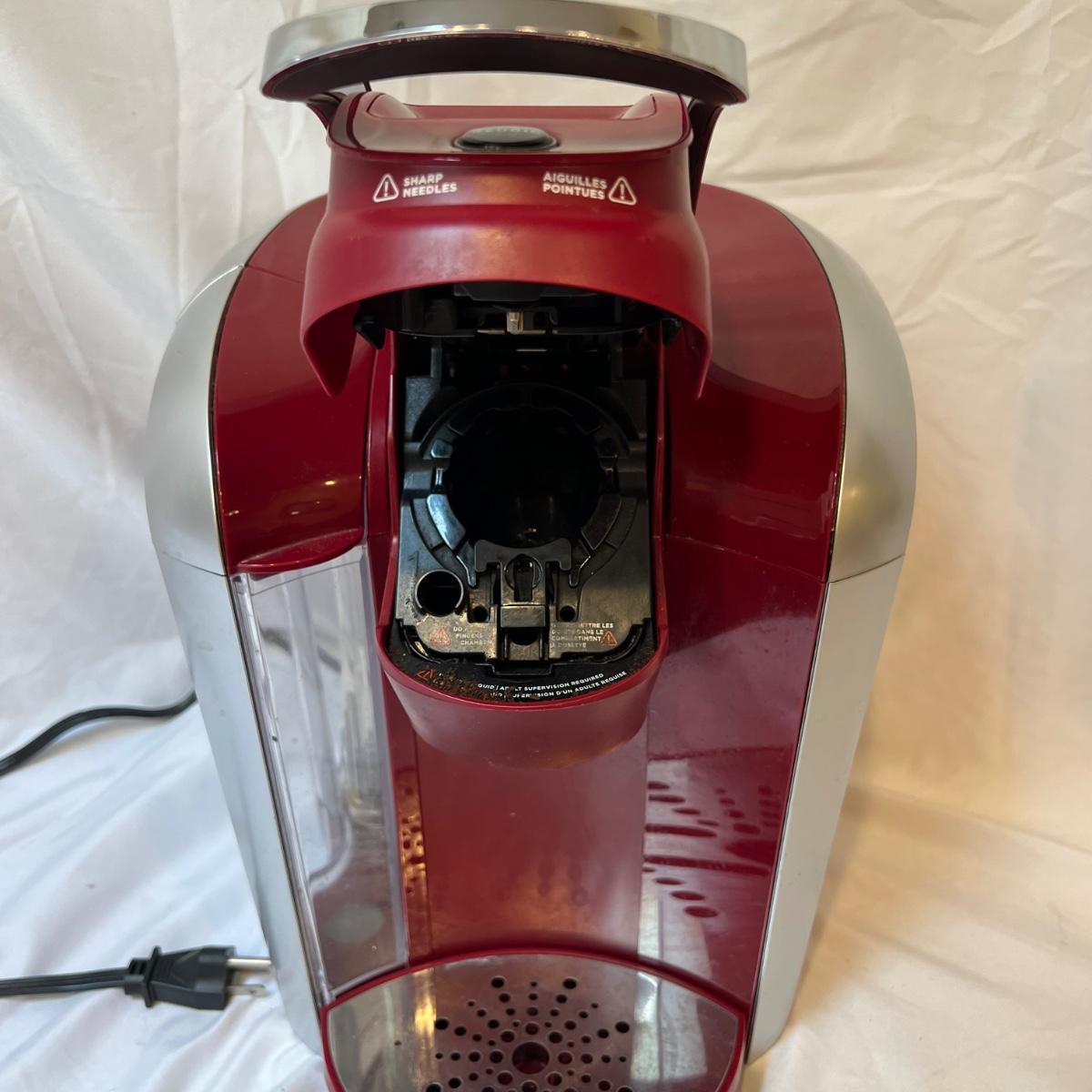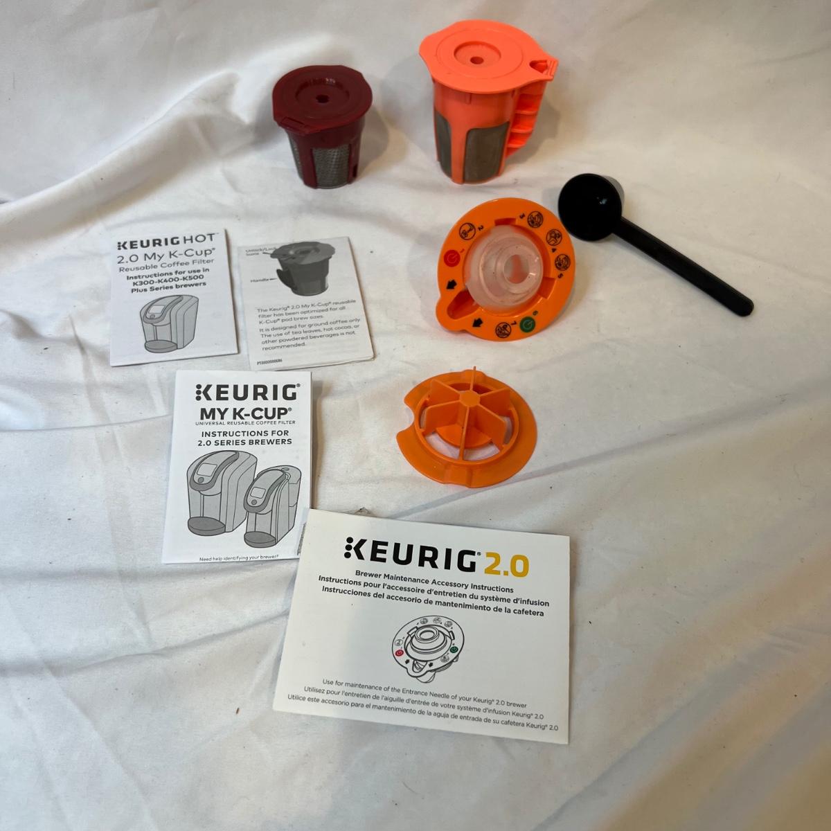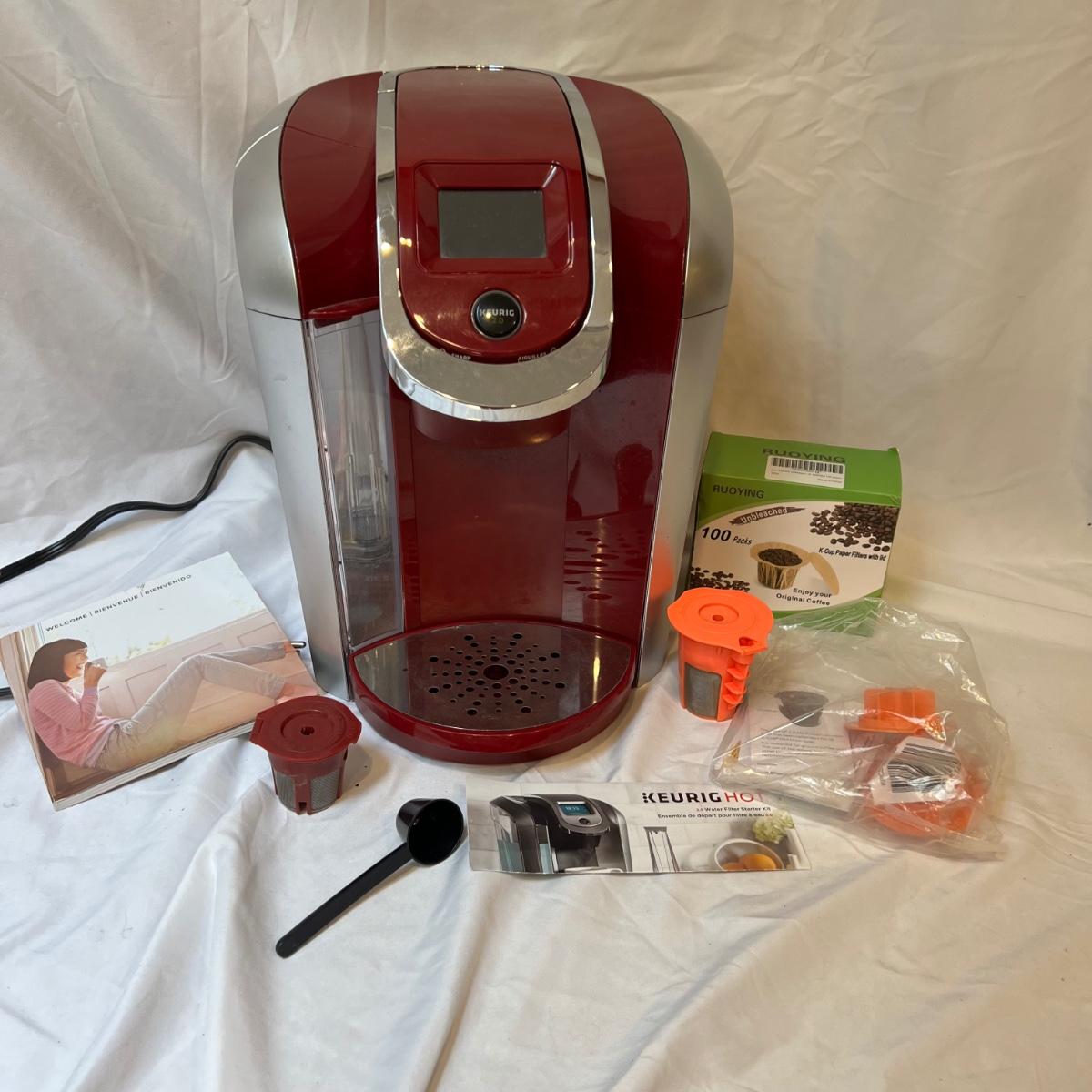 A Keurig K 2.0-400 coffee maker measuring approximately 15” x 11.5” x 12”H. item comes complete with a box of K cup paper filters, and reusable K cups. please note that lid can stick, and a photograph shown here points to what you have to release for the top to shut.