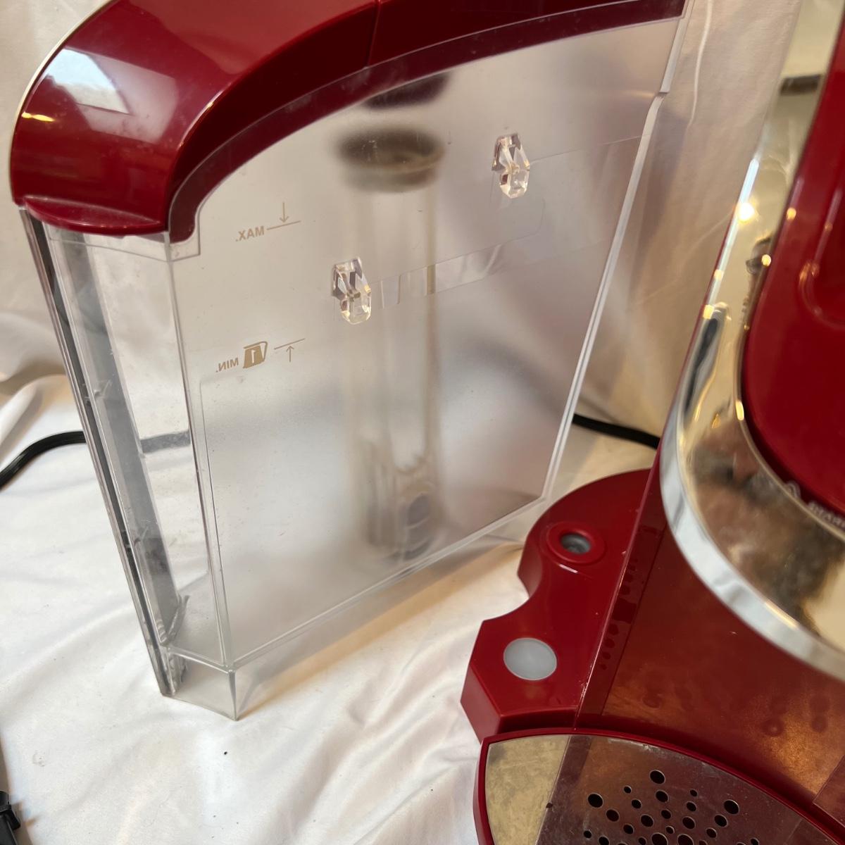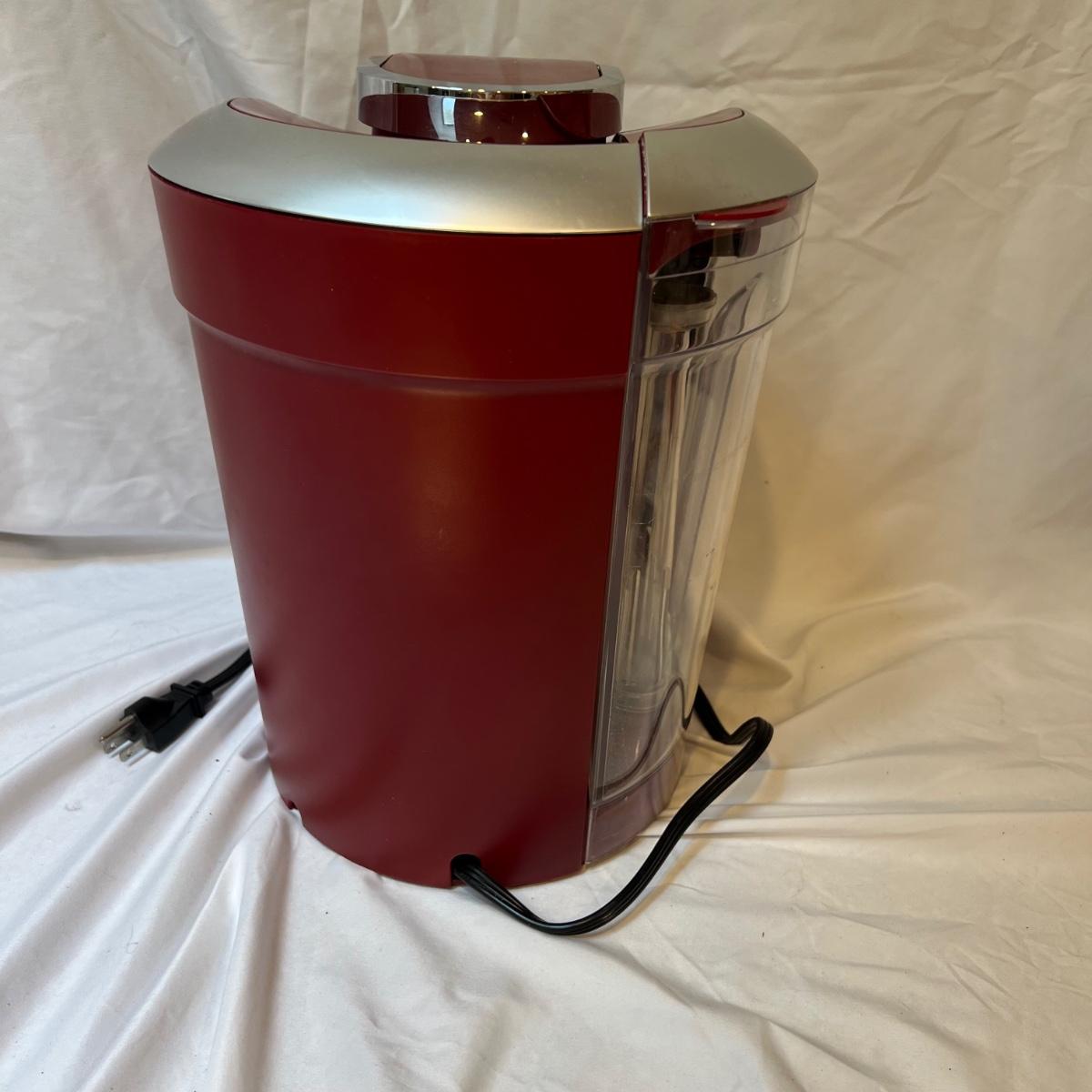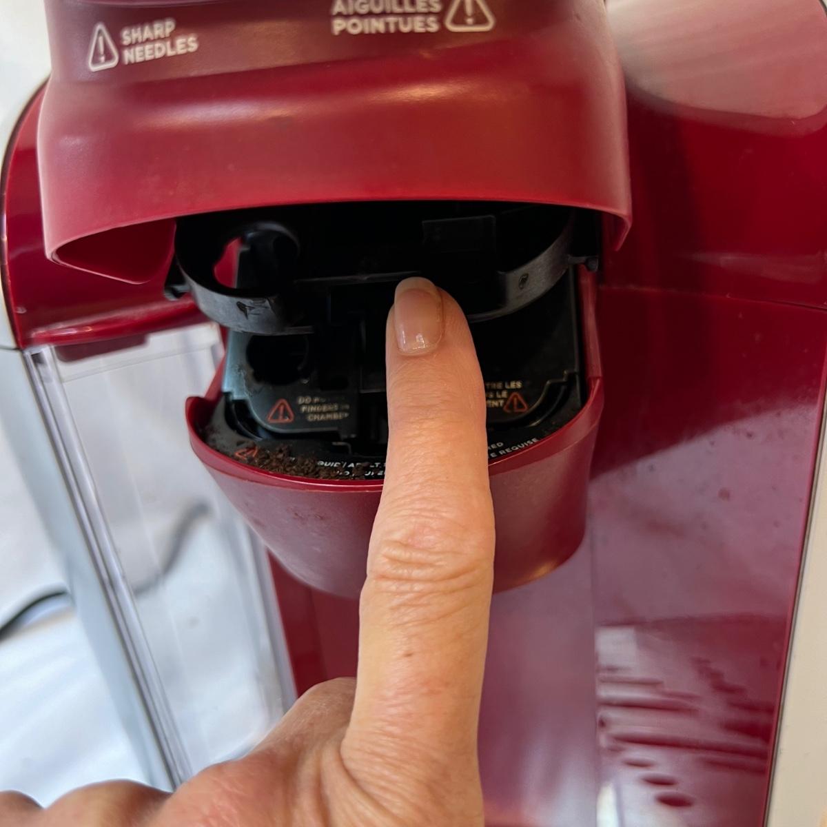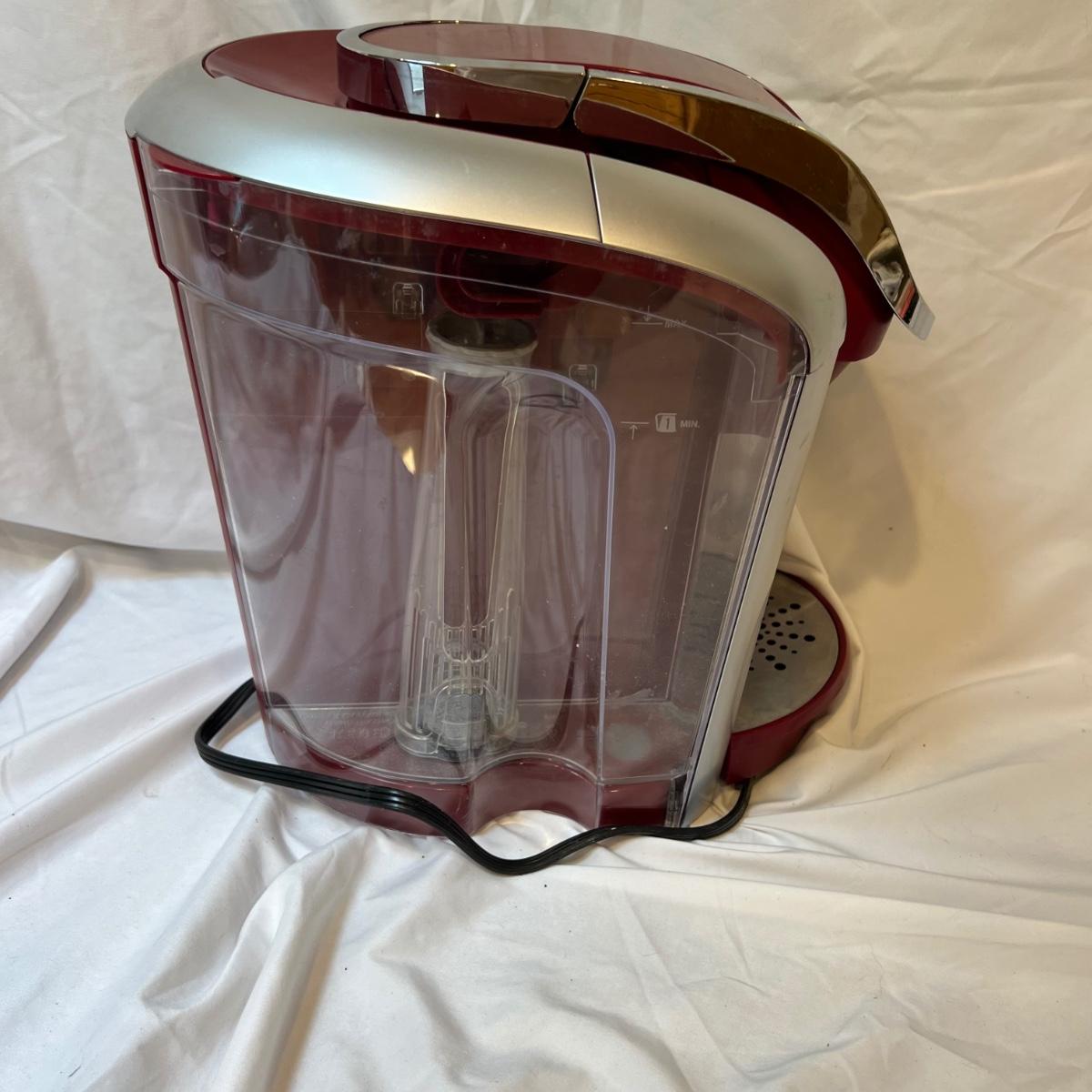 A Keurig K 2.0-400 coffee maker measuring approximately 15” x 11.5” x 12”H. item comes complete with a box of K cup paper filters, and reusable K cups. please note that lid can stick, and a photograph shown here points to what you have to release for the top to shut.