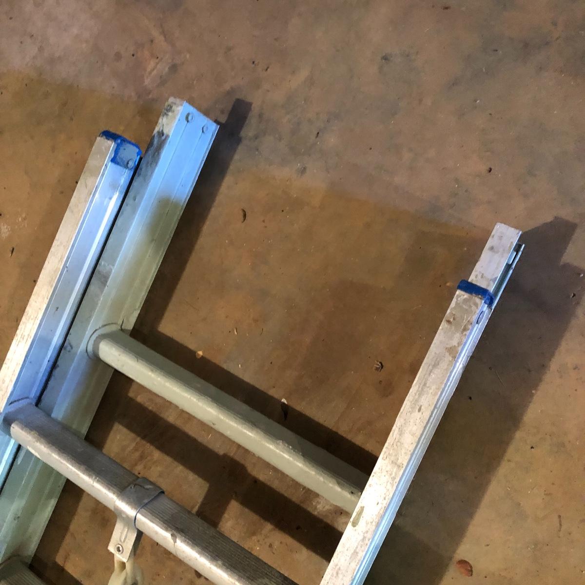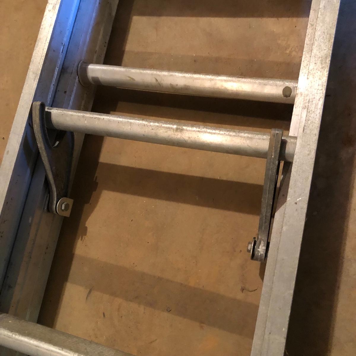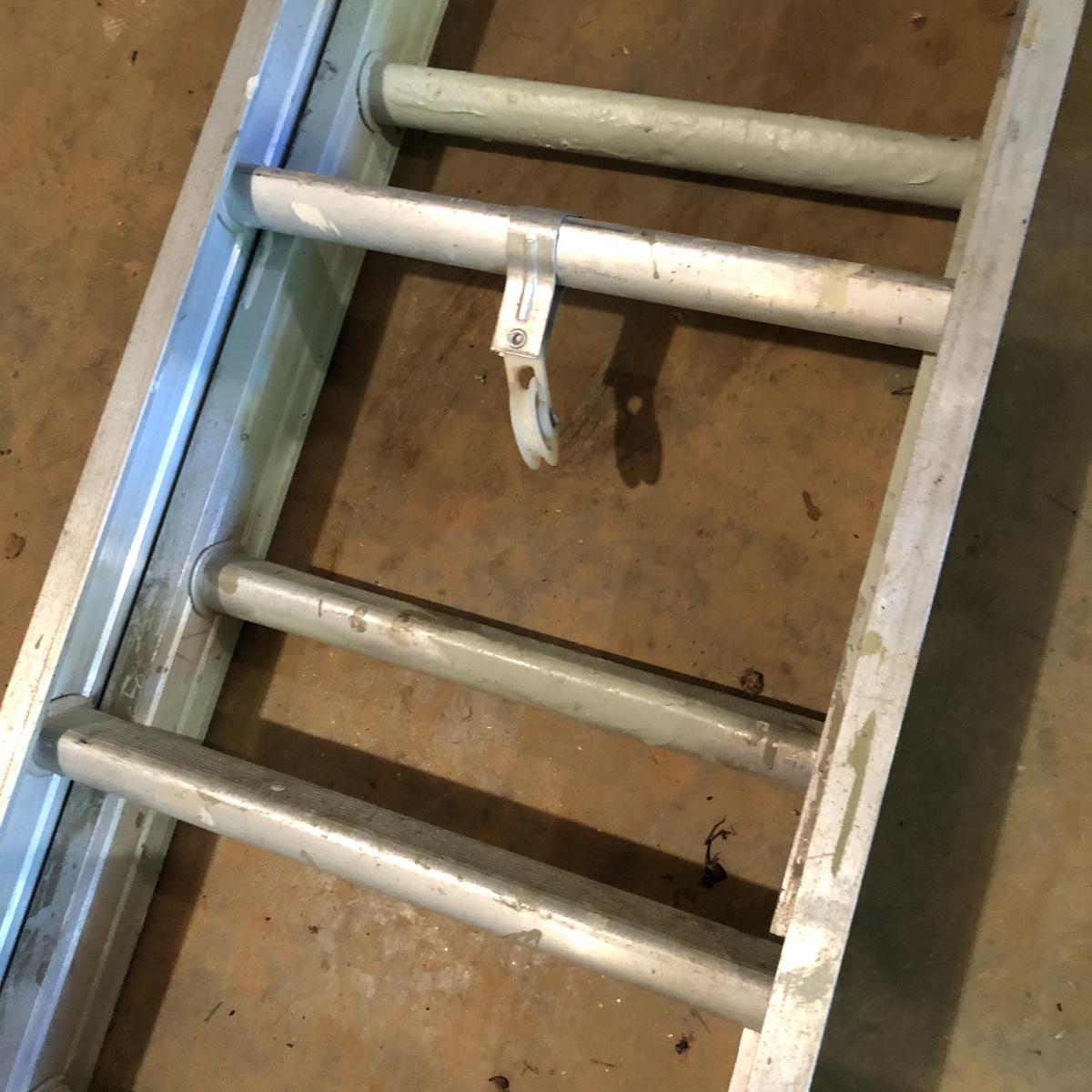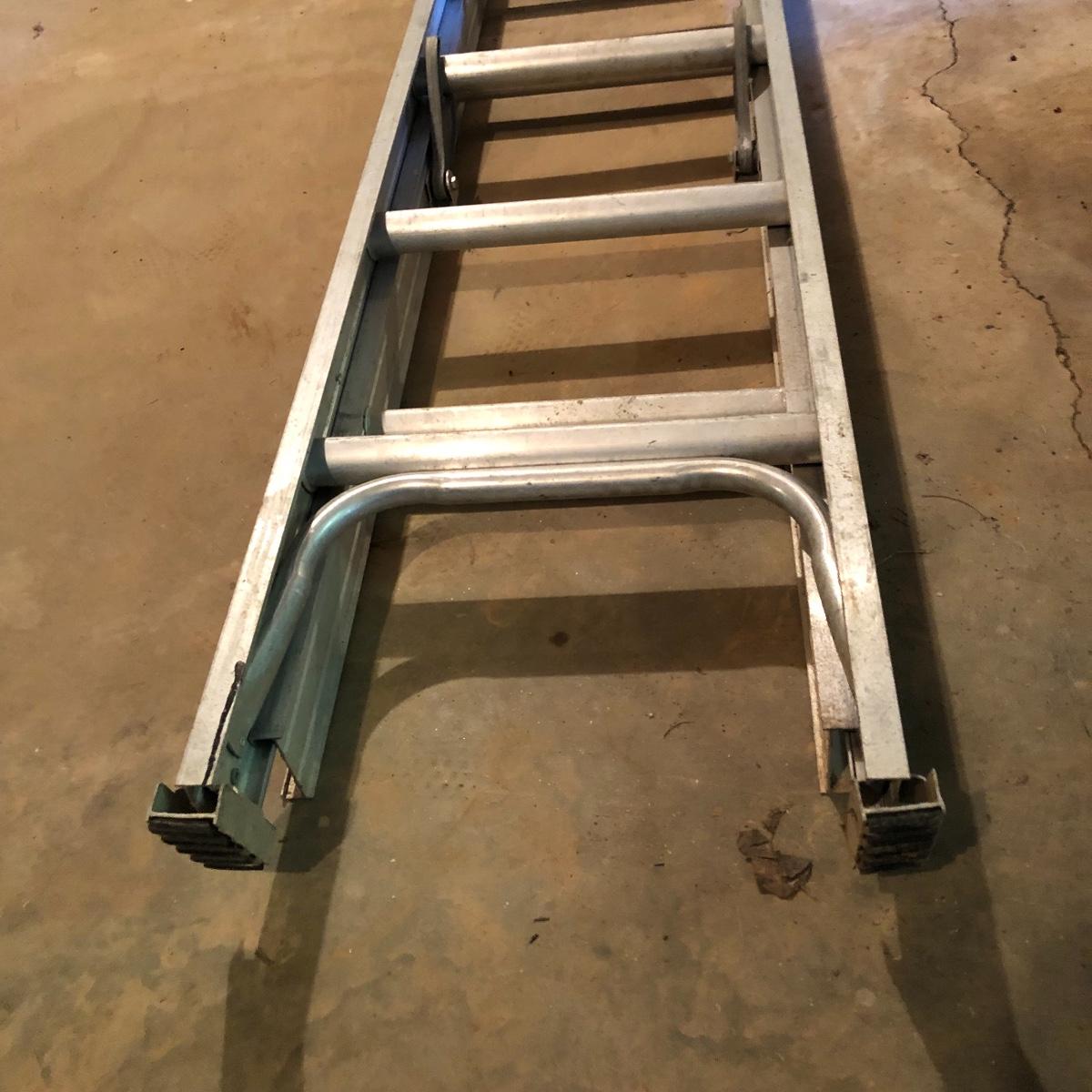 Aluminum Ladder is rated for 200 pounds and has two 10’ sections. The model is 1220. Note the rope to extend ladder is missing. Local pick up only.