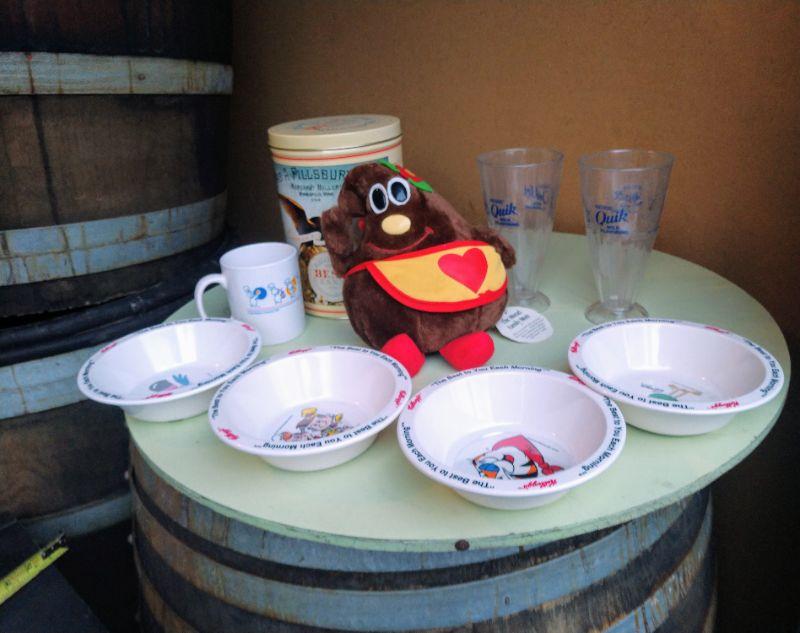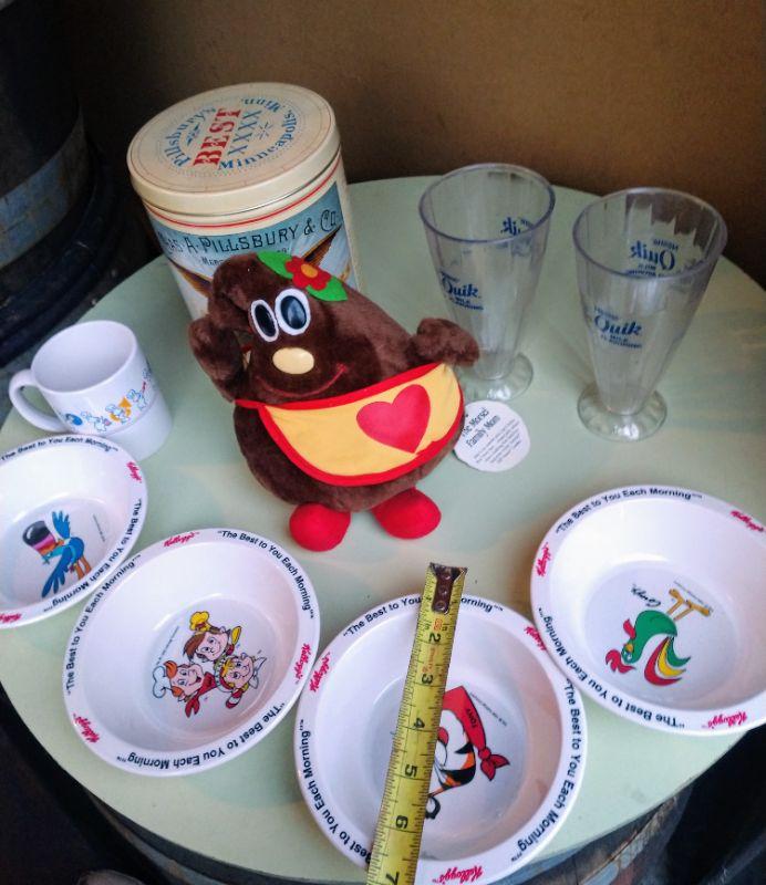 The Little Nestle Morsel Chocolate Chip plushie is the cutest thing. The bowls have and the little coffee cup have not been used. They have been stored in the original boxes they were shipped in.
