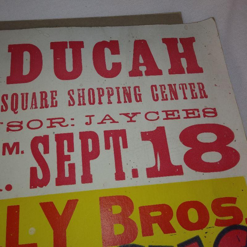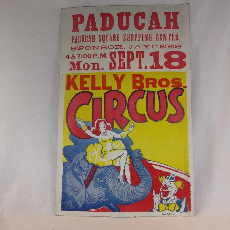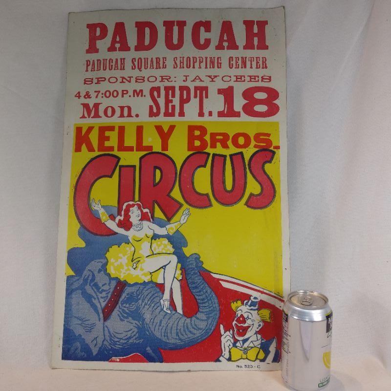 This is a Vintage Kelly Bros. Circus Poster from Paducah, KY. Probably from the late 60s or 70s. Screen printed on cardboard. It is 14-inches X 22-inches. Poster background shows some dirt splatters and a little wear but other than that, pretty amazing. This is the type poster that would be posted on telephone poles along the roadside when the circus was in town.