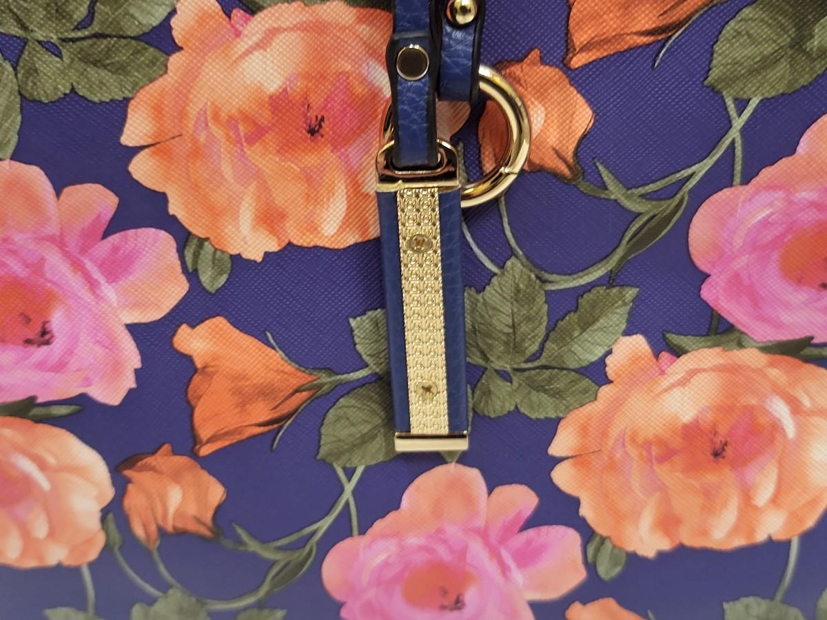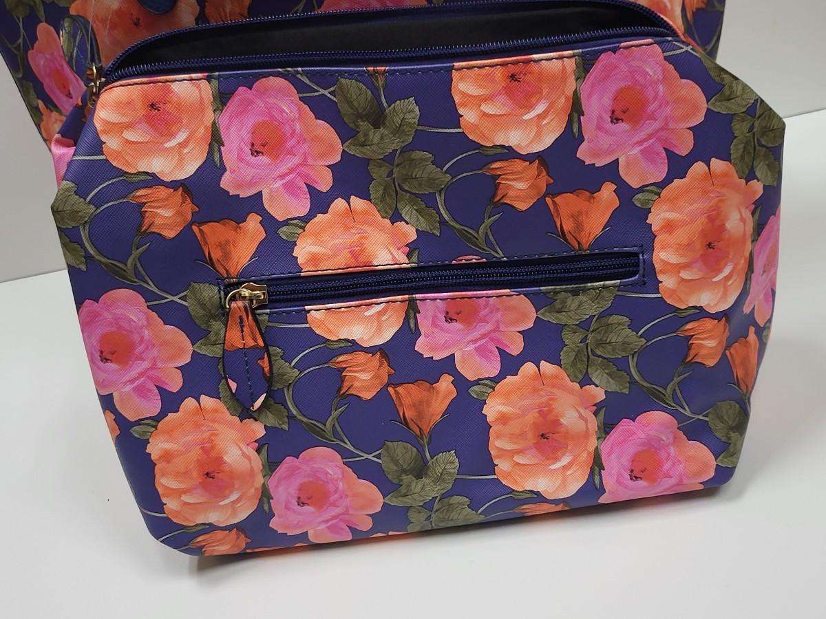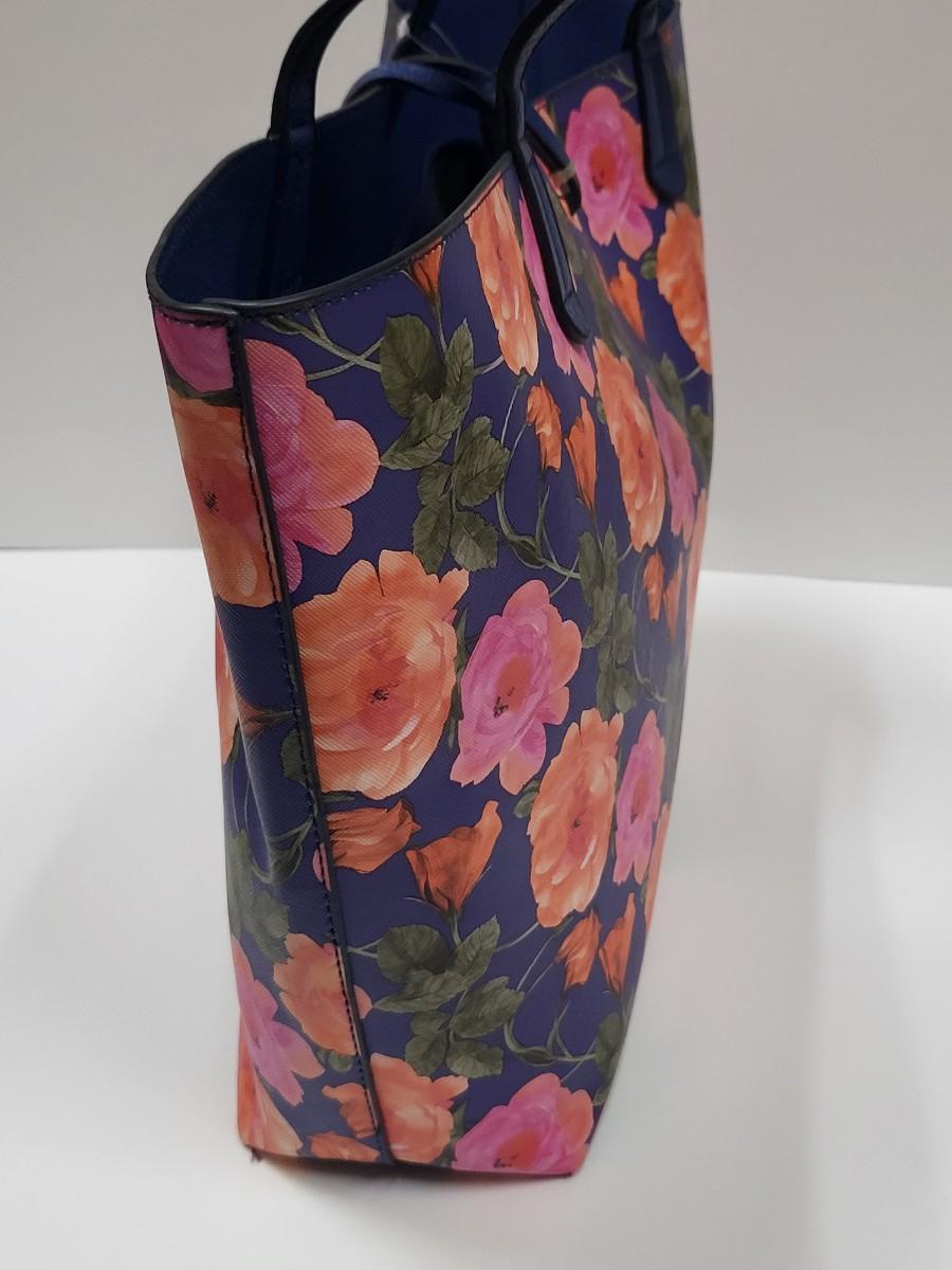 Tote is reversible. One side is floral and turn it insideout for a solid blue look. Measures 16" long x 11" tall 4.5" deep and 9" strap length. Second piece is a matching accessories pouch, zipper top, measures 11" long x 9" tall x 3.5" deep.
