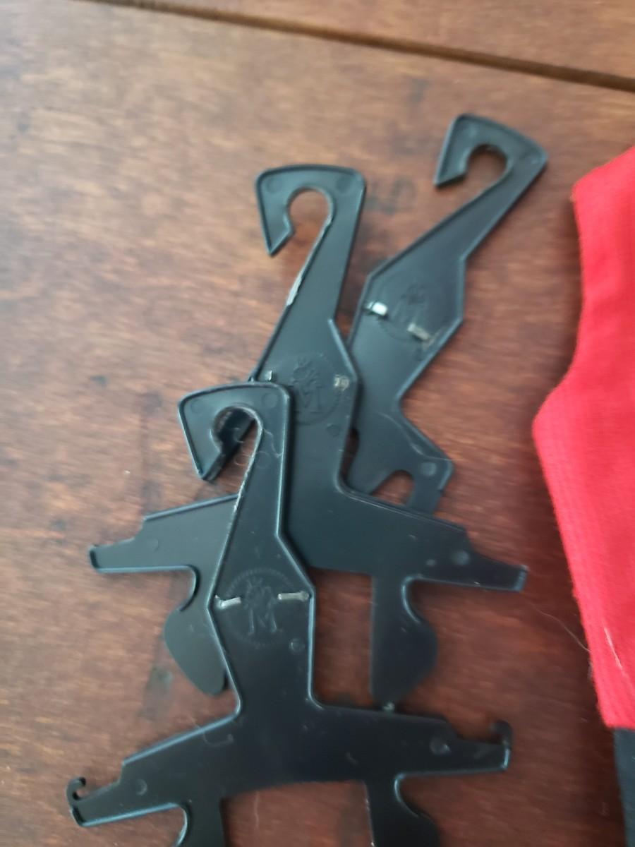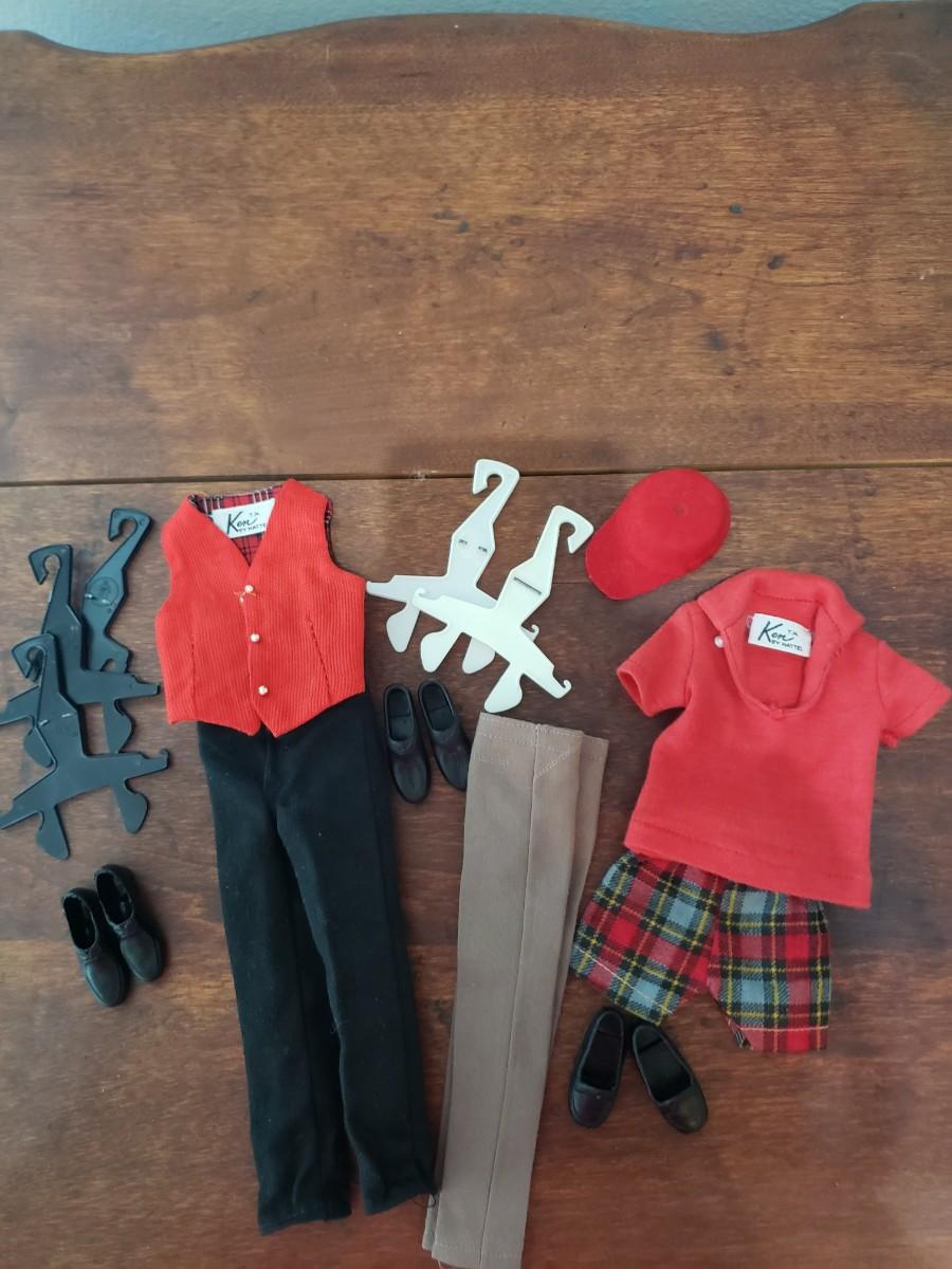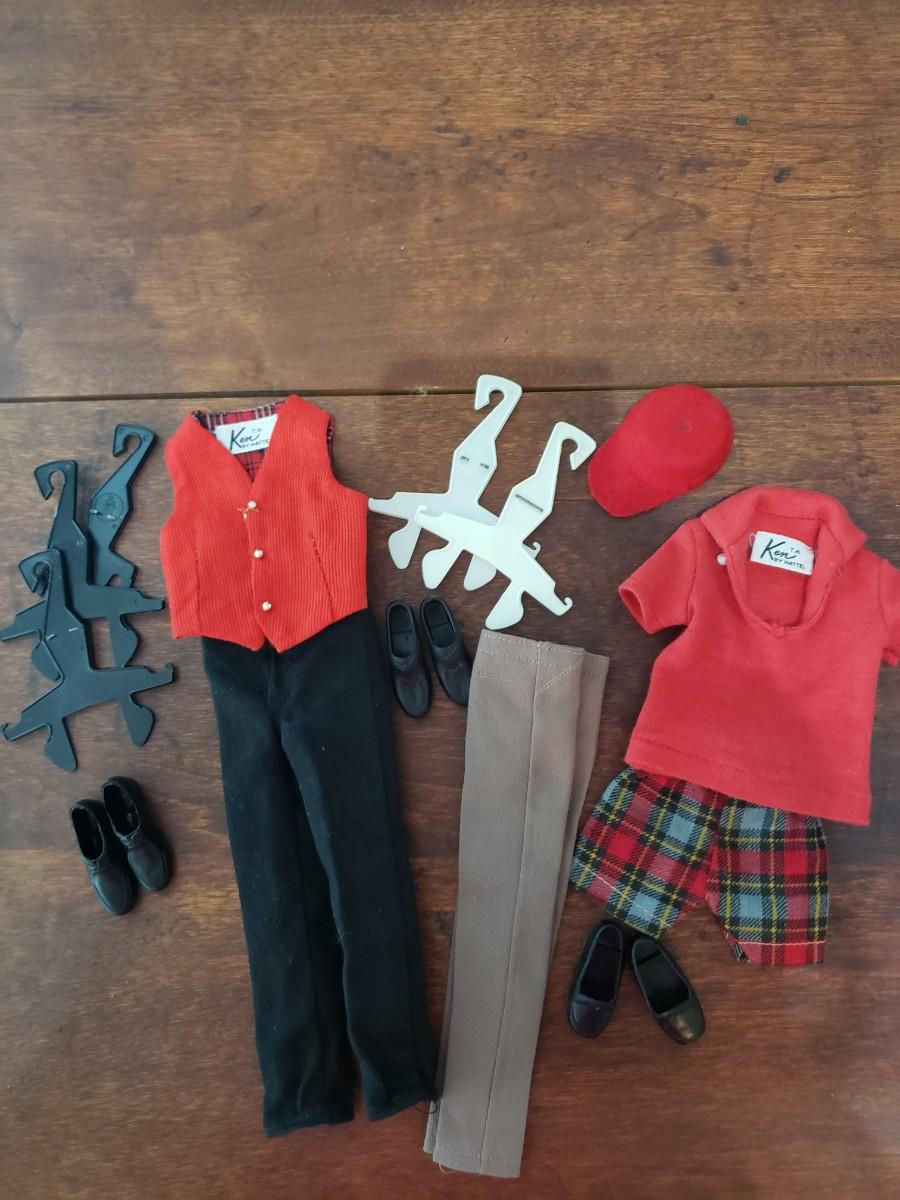 Ken doll labeled clothing. 2 pants, shorts, vest, red shirt, 3 pair of shoes, 5 Mattel hangers & 1 hat.