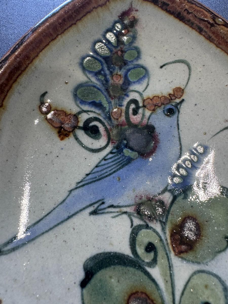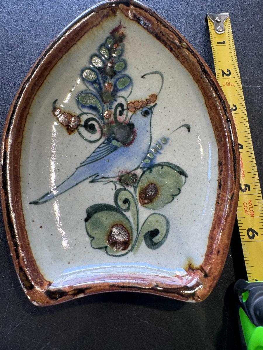 Design and Use: This specific piece features a vibrant blue bird as a central motif, surrounded by stylized floral elements, reflecting the natural inspirations common in Tonala pottery. It's designed as a trinket dish or small tray, suitable for decorative purposes or holding small items.