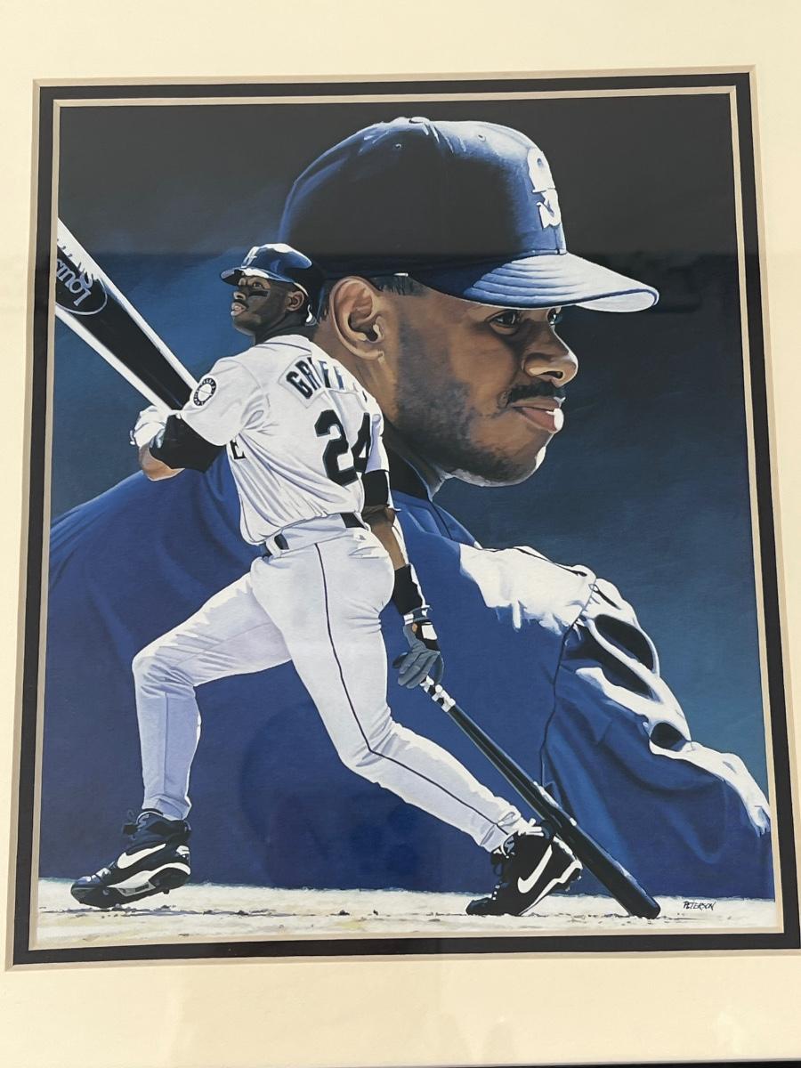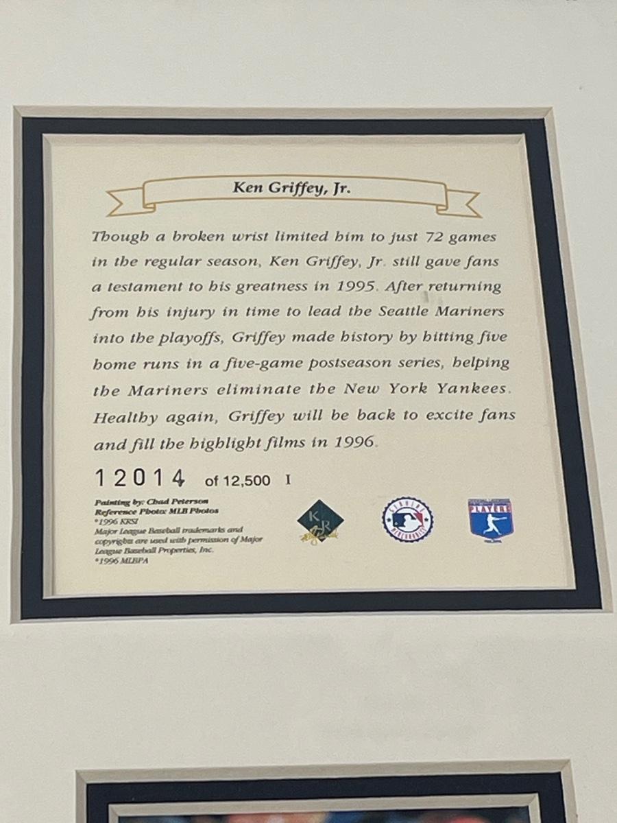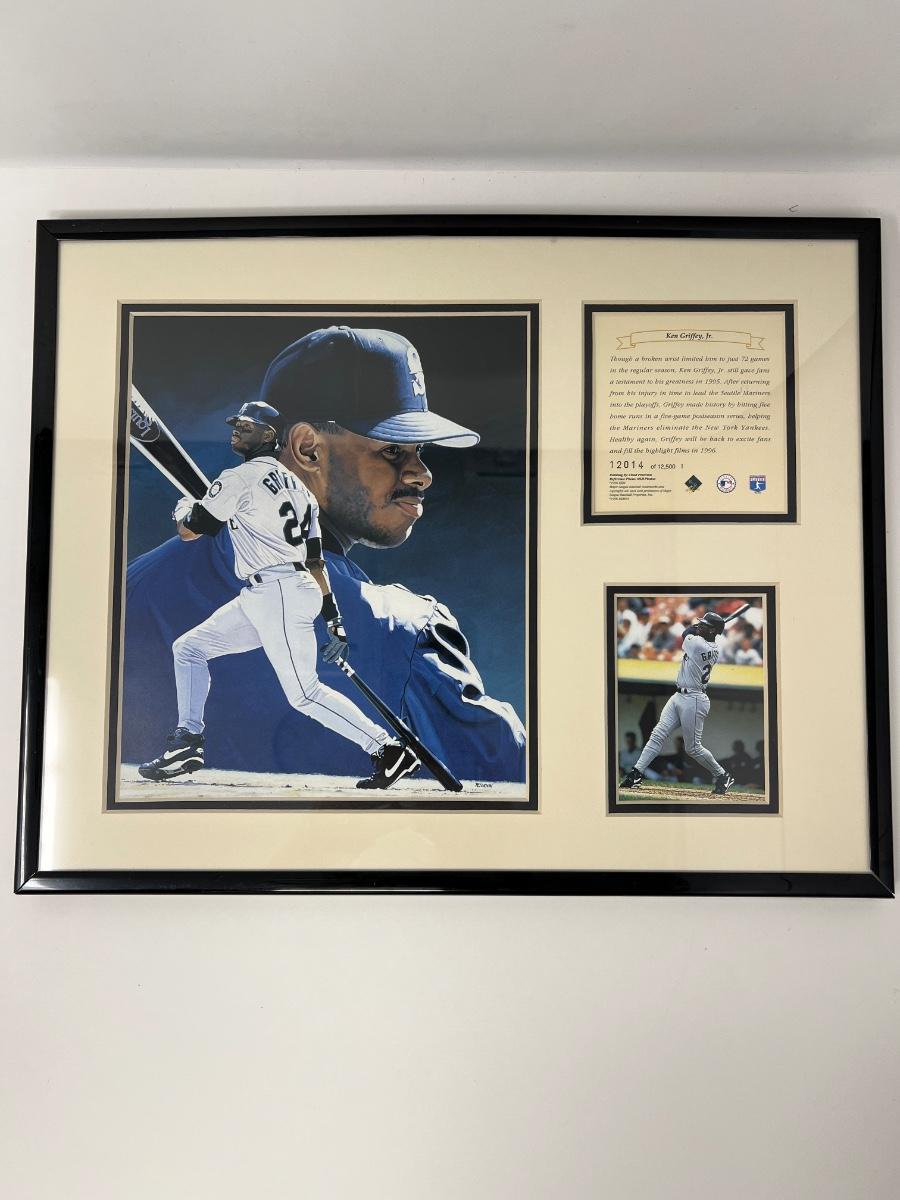 Limited Edition Ken Griffey, Jr. photo wall plaque. #12014 of 12,500 produced. Metal frame and matted. Glass appears to be free of scratches.