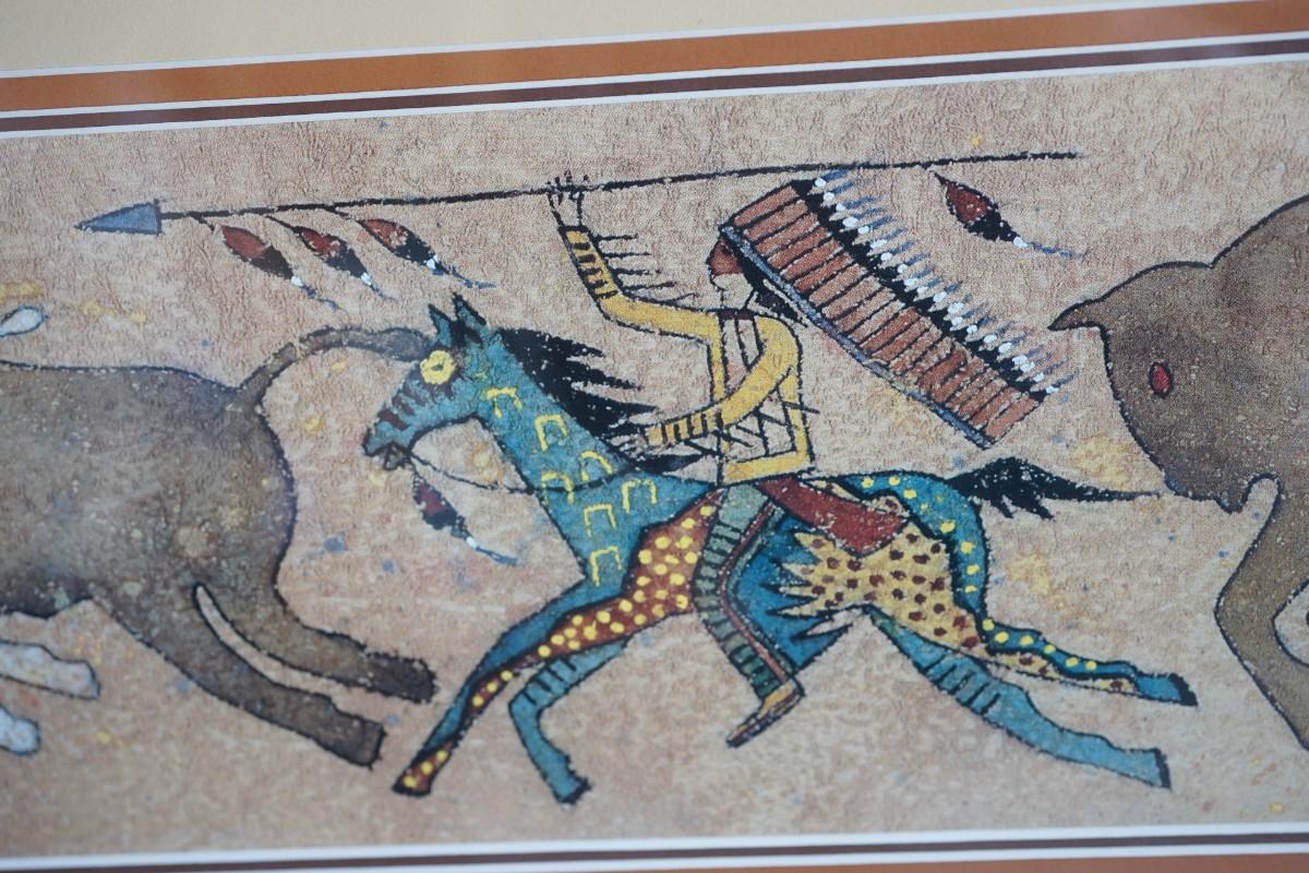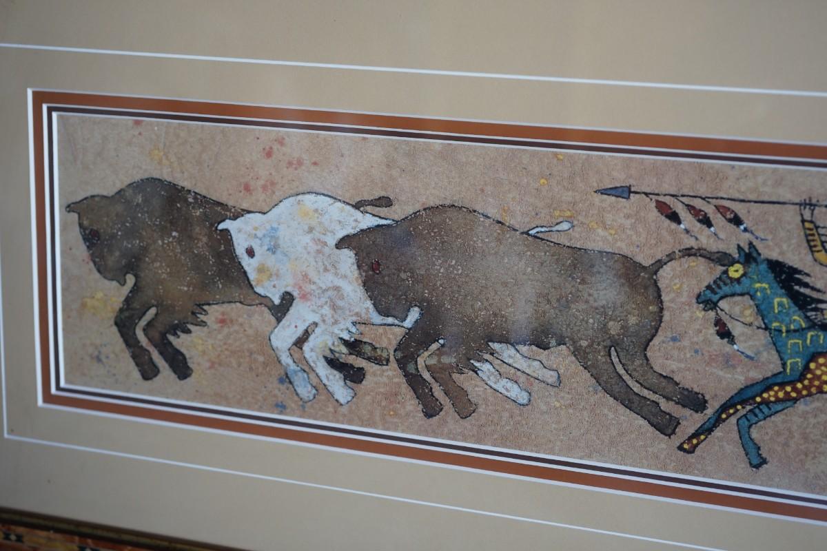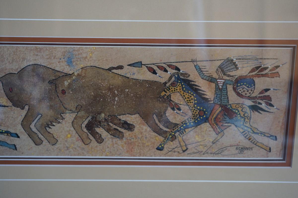 KEN SCHMIDT PRINT BISON HUNT.  3FT. FRAMED IN A INLAY FRAME.
