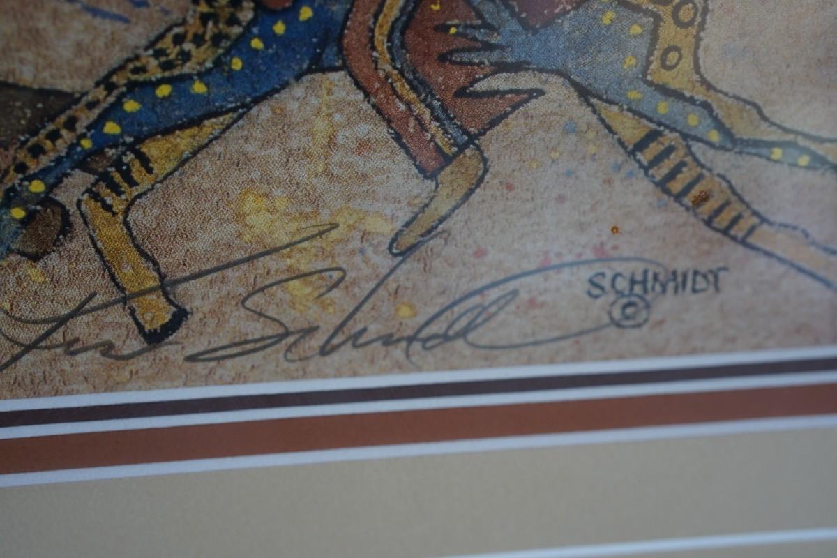 KEN SCHMIDT PRINT BISON HUNT. 3FT. FRAMED IN A INLAY FRAME.