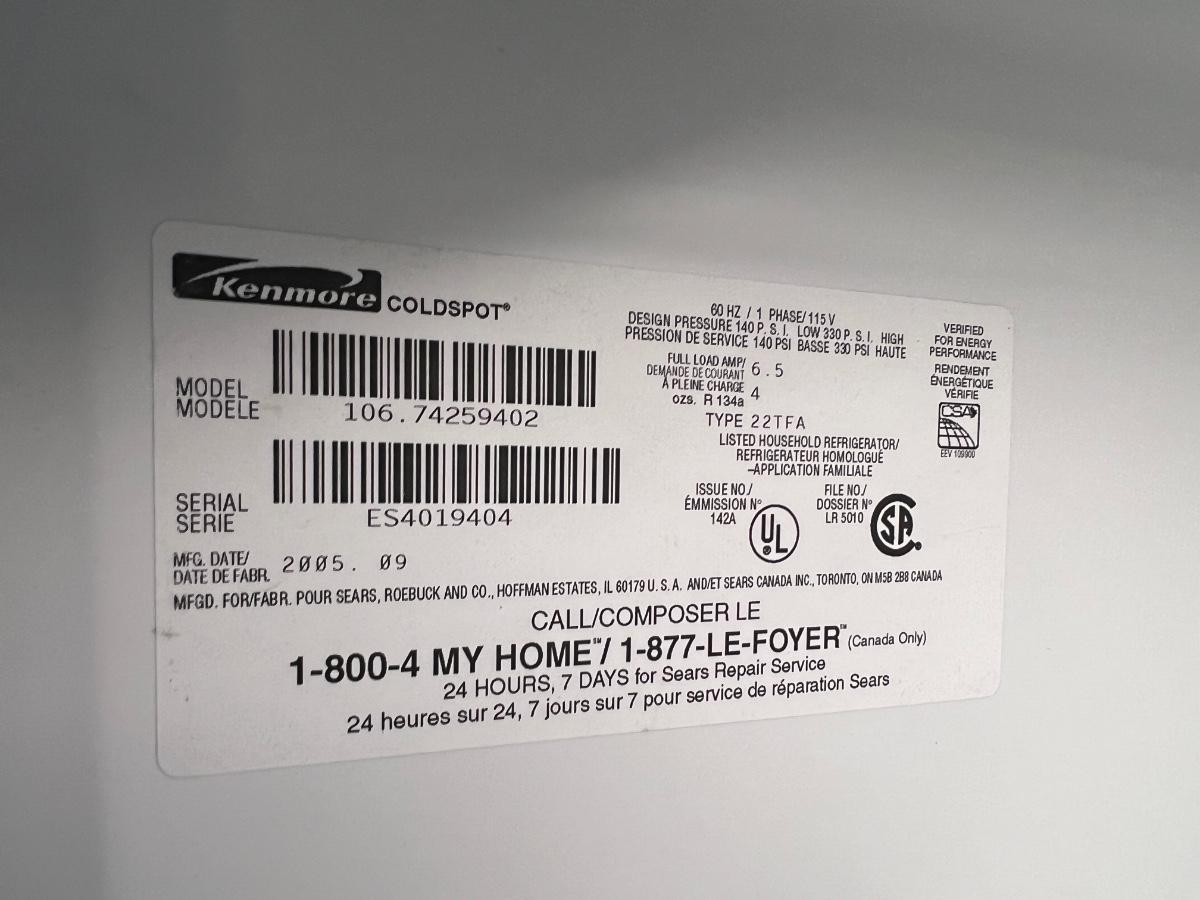 Black KENMORE COLDSPOT REFRIDGERATOR was used as an extra fridge for the home. Model number 106.74259402