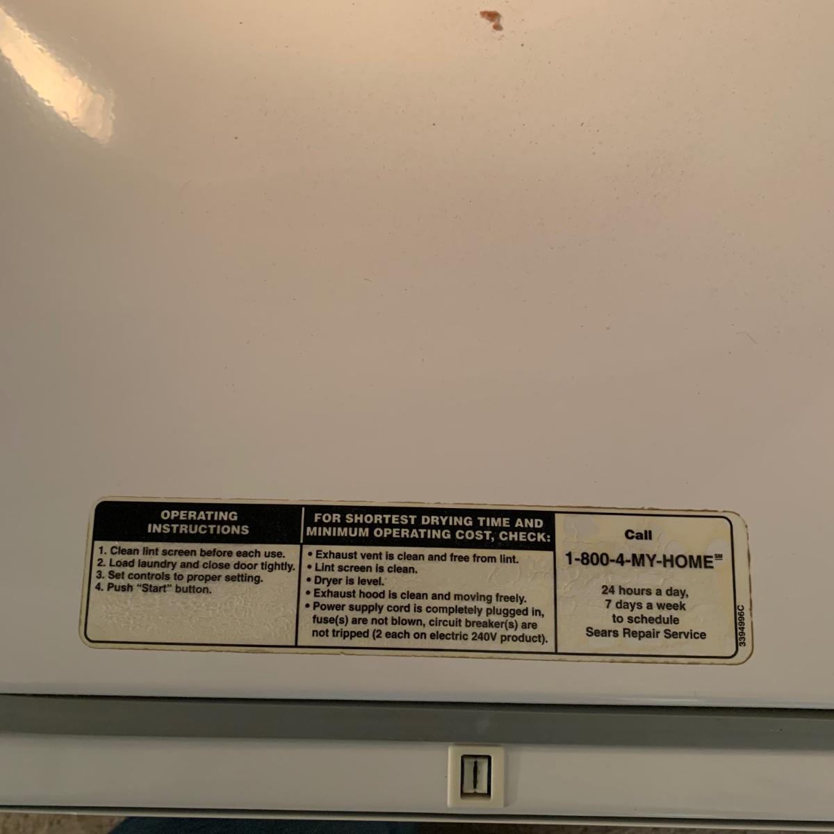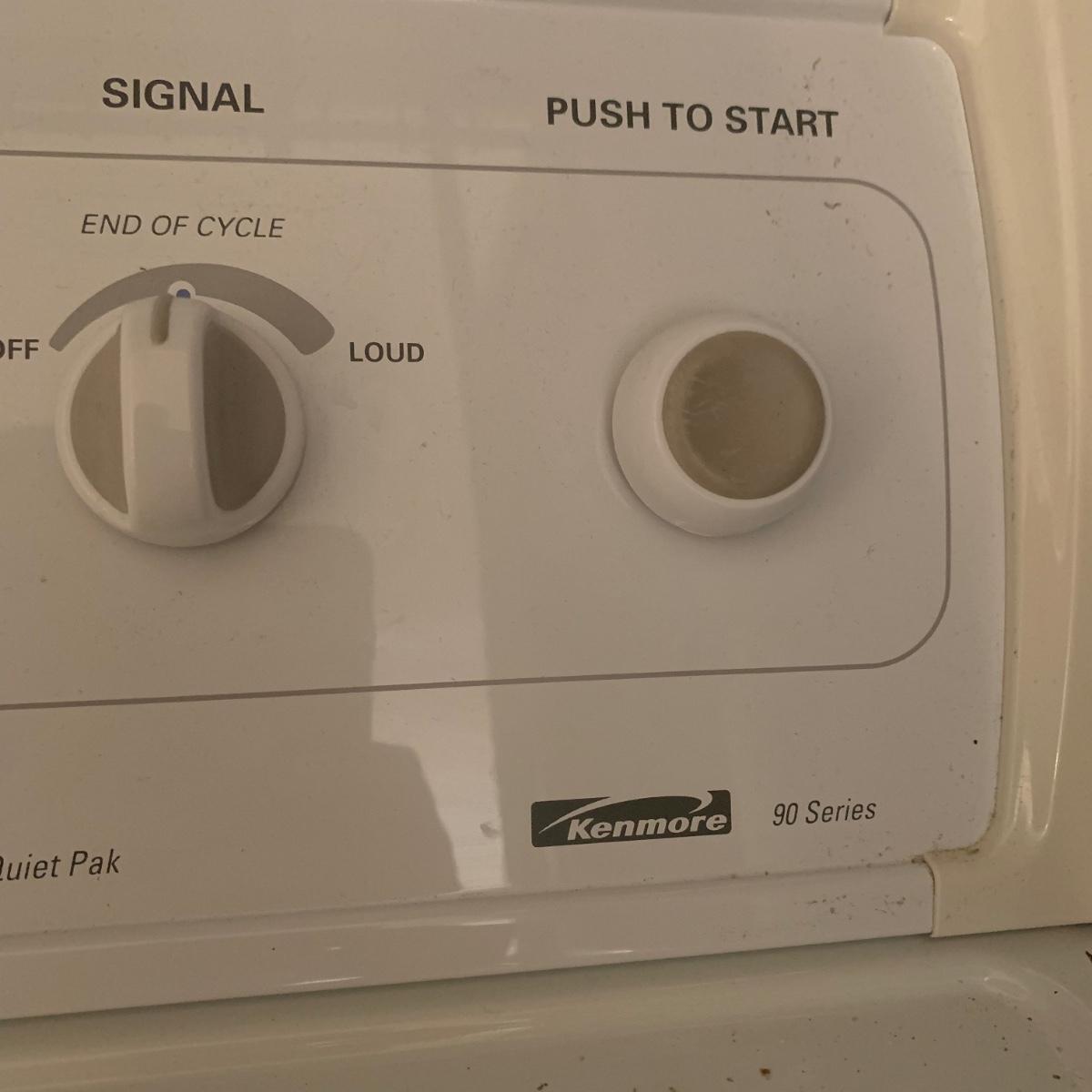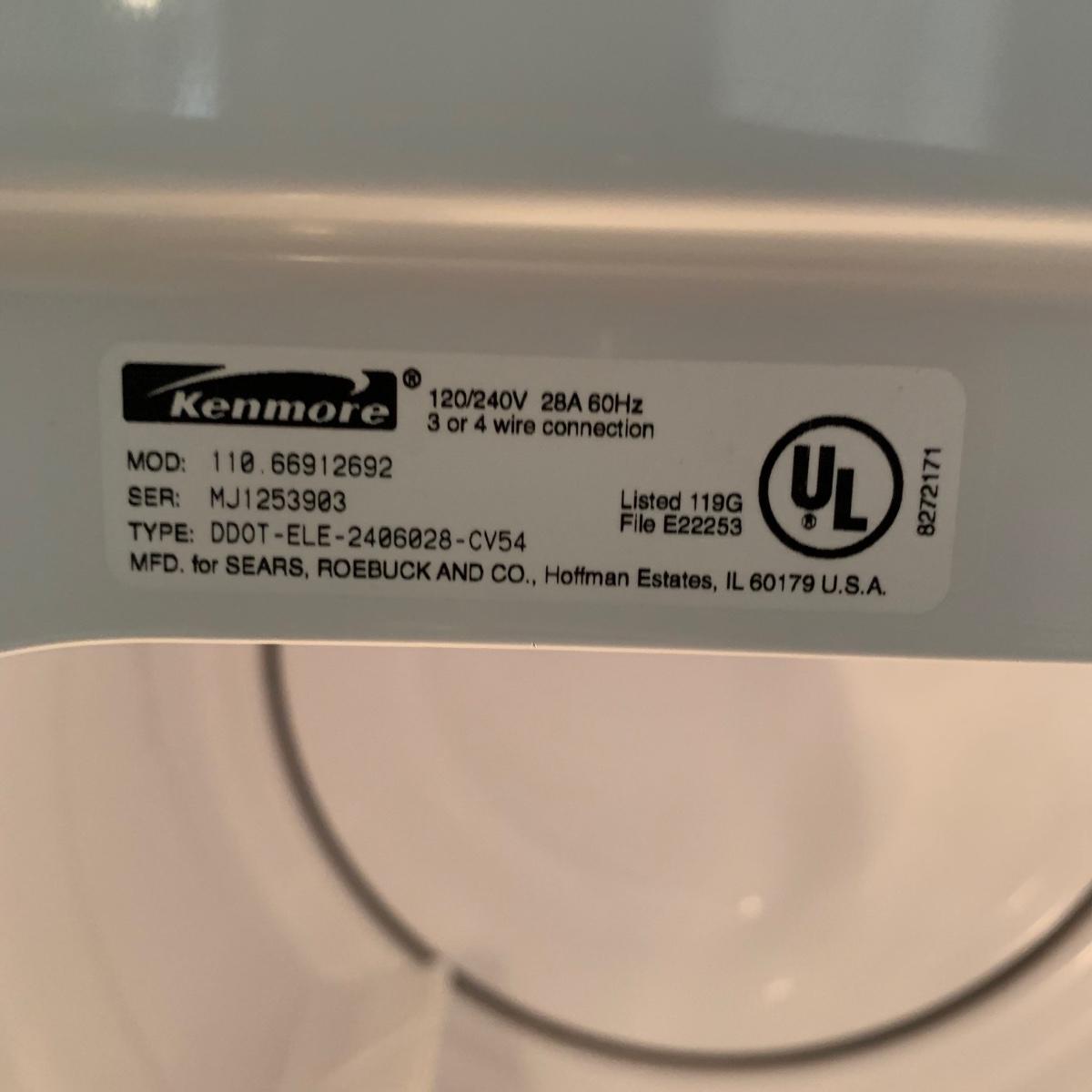 Kenmore 90 Series front load clothes dryer. Measures 27” x 26” x 44”H. Dryer powered on when tested. There is some slight rust on the top surface. Please see photos for model number.