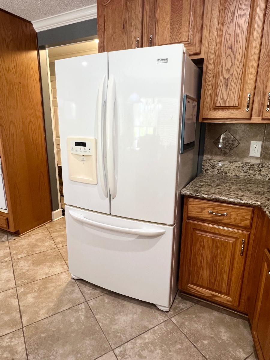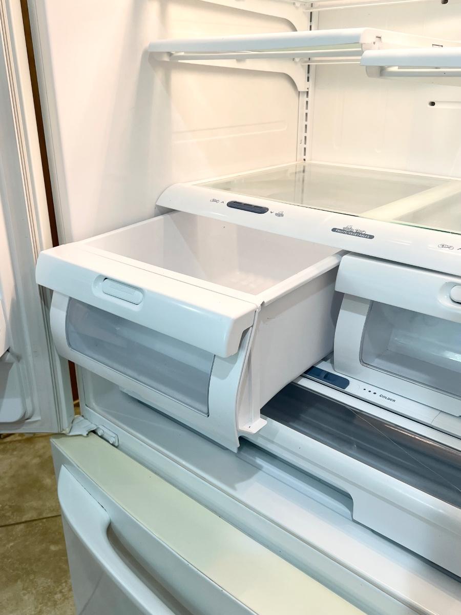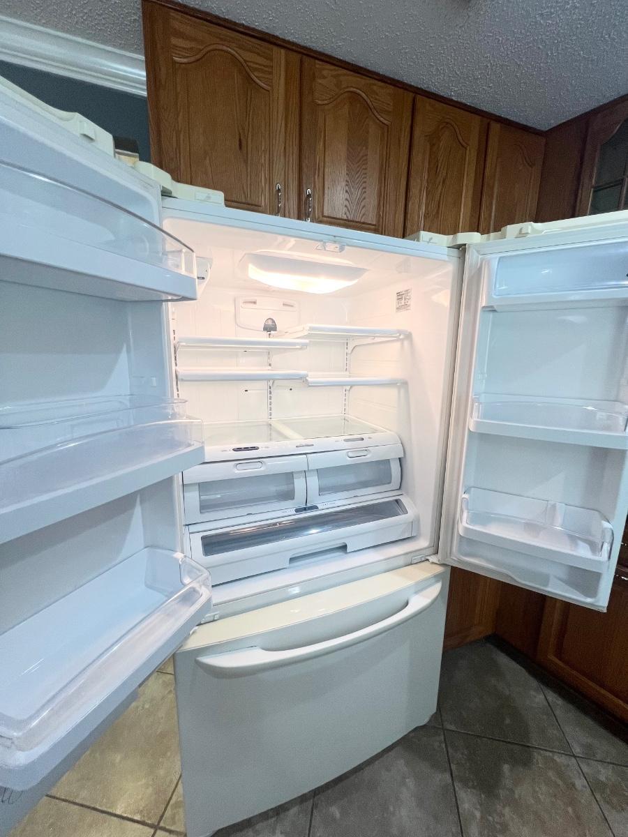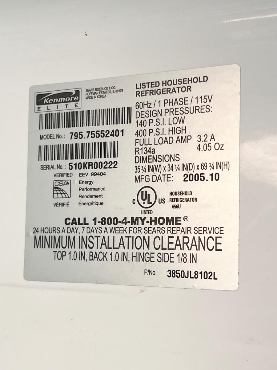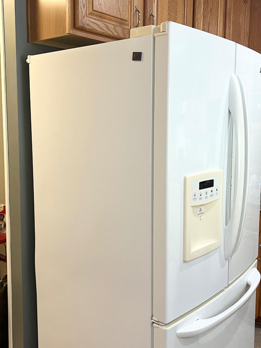 Water dispenser & ice maker works ~ Fridge has wear & tear, see photos ~ Works great ~ Be prepared to unhook waterline to fridge, bring tools ~ Dry erase board is stuck with adhesive to the side of the fridge ~ 70” H x 36.5” W x 37” D