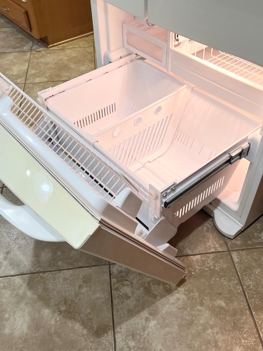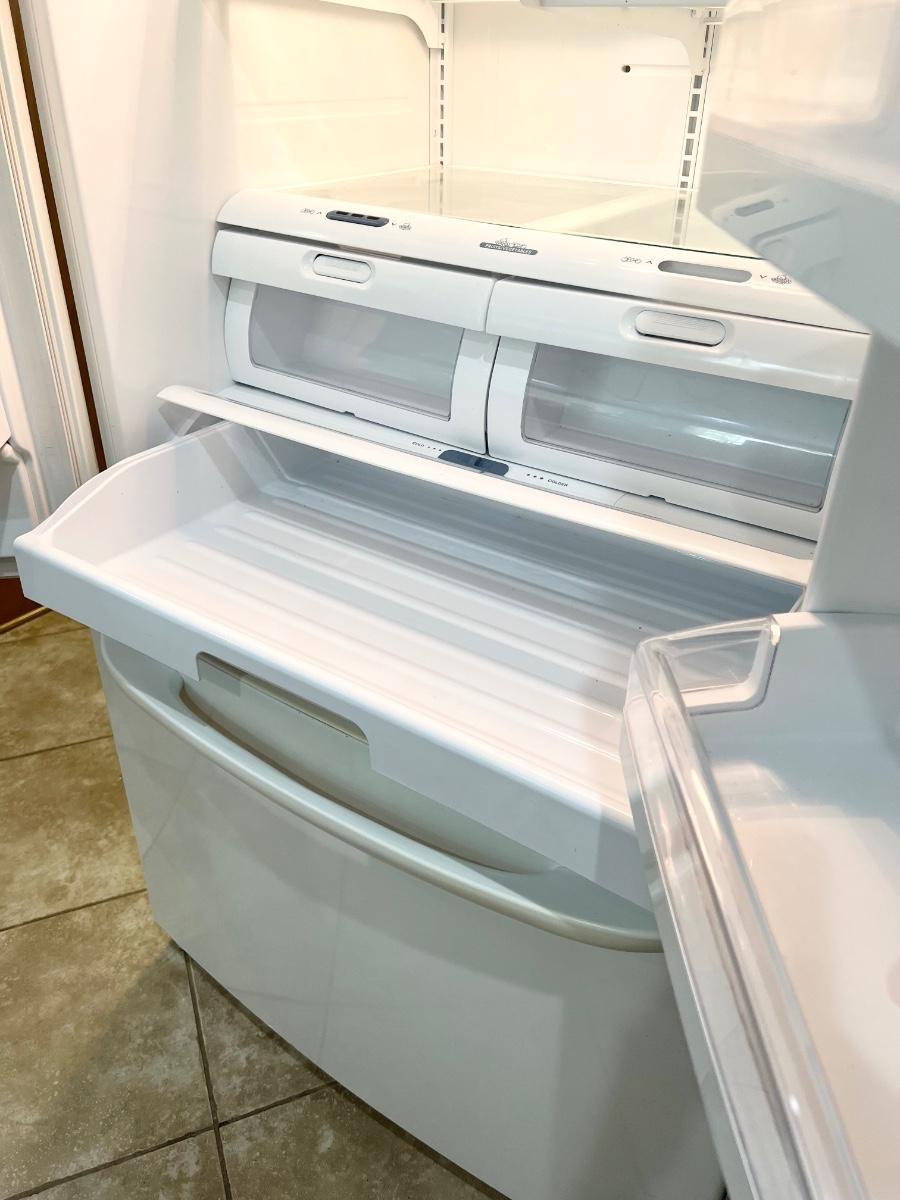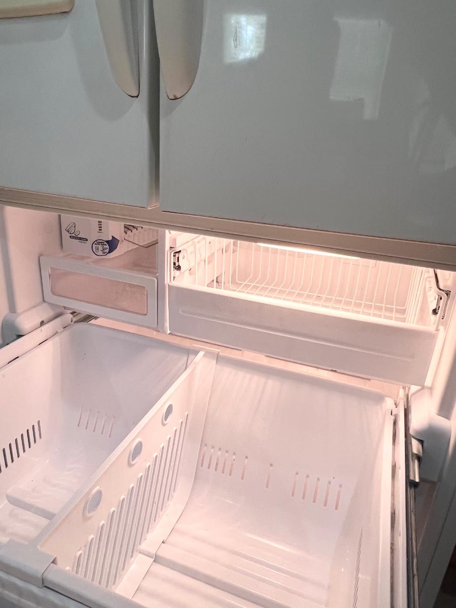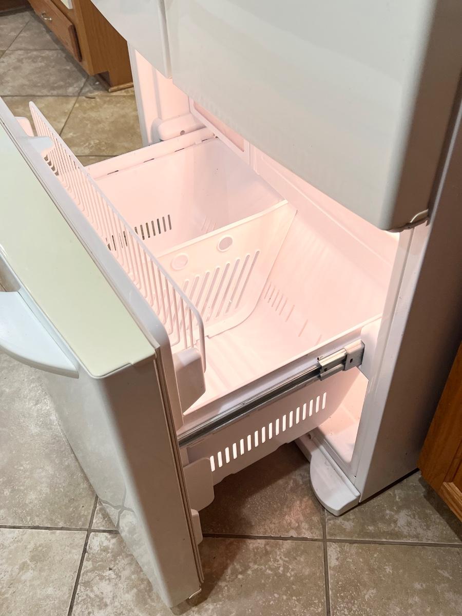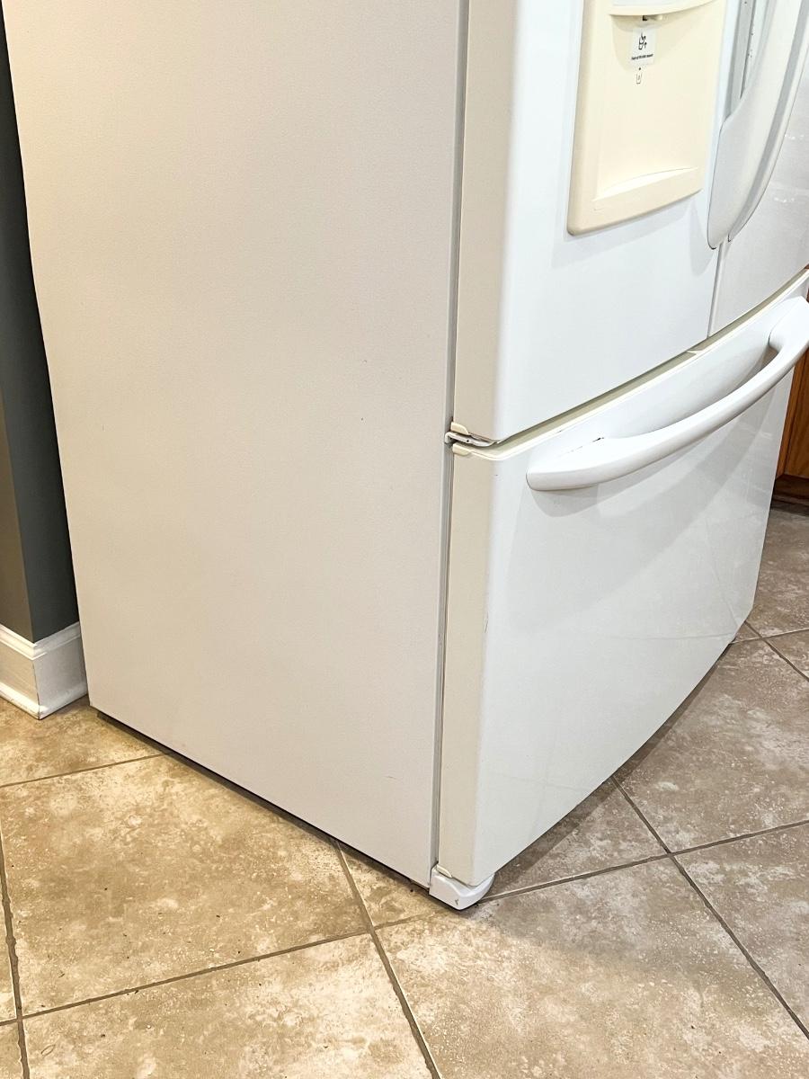 Water dispenser & ice maker works ~ Fridge has wear & tear, see photos ~ Works great ~ Be prepared to unhook waterline to fridge, bring tools ~ Dry erase board is stuck with adhesive to the side of the fridge ~ 70” H x 36.5” W x 37” D