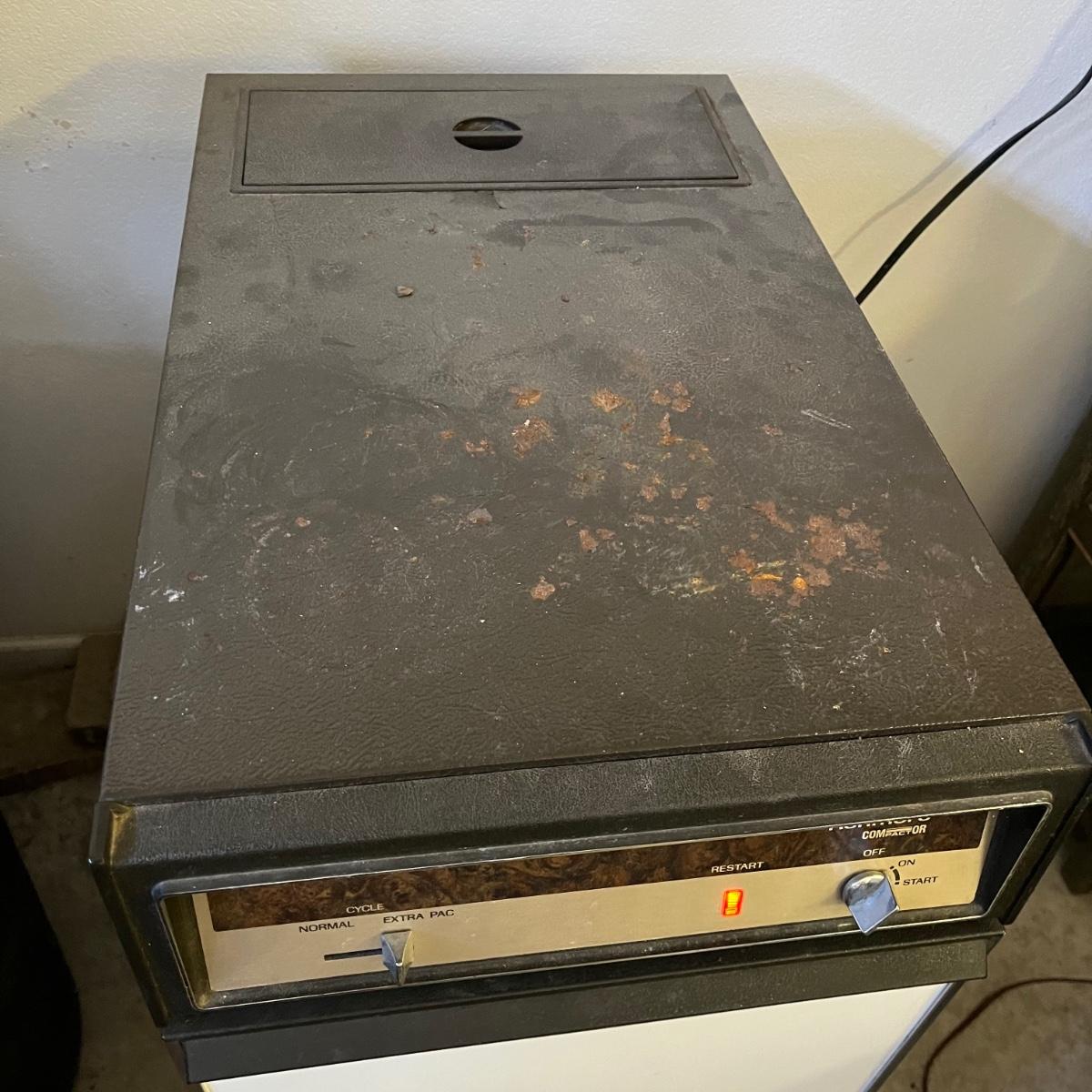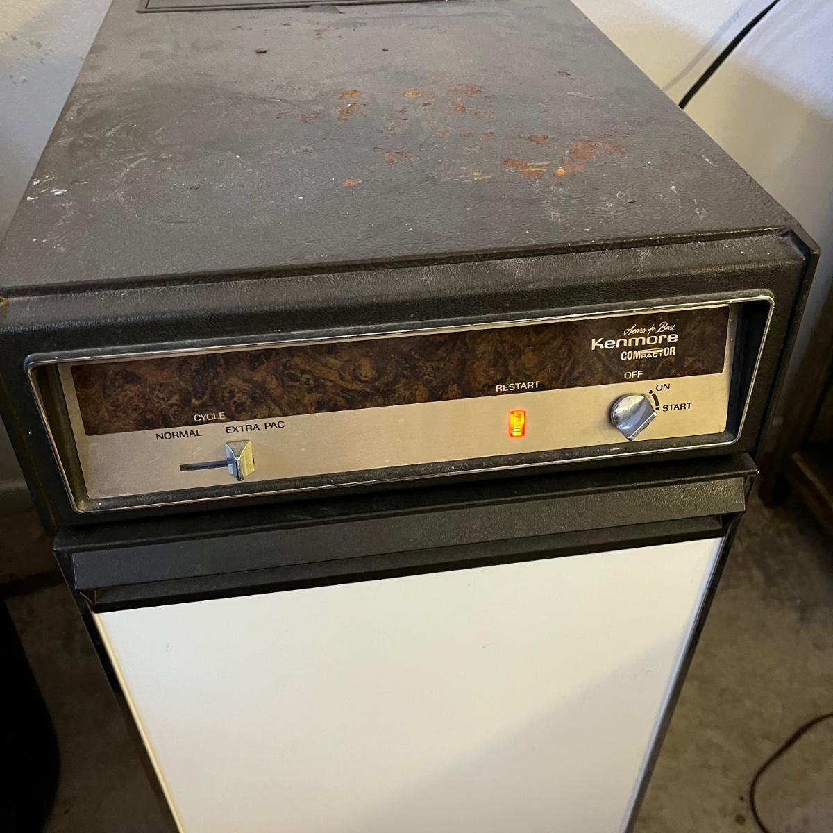 Lot includes a Kenmore compactor that powered on when tested. Compactor measures 15” x 24” x 35”. Bring help at pickup as item is substantial. Machine has some rust on top, see pictures.