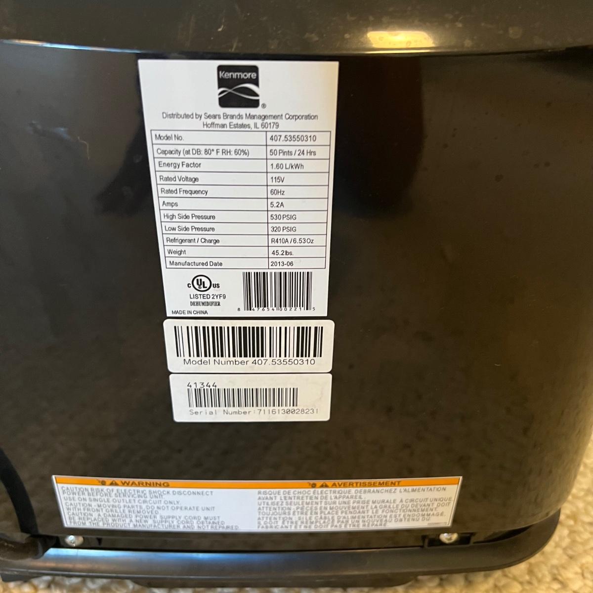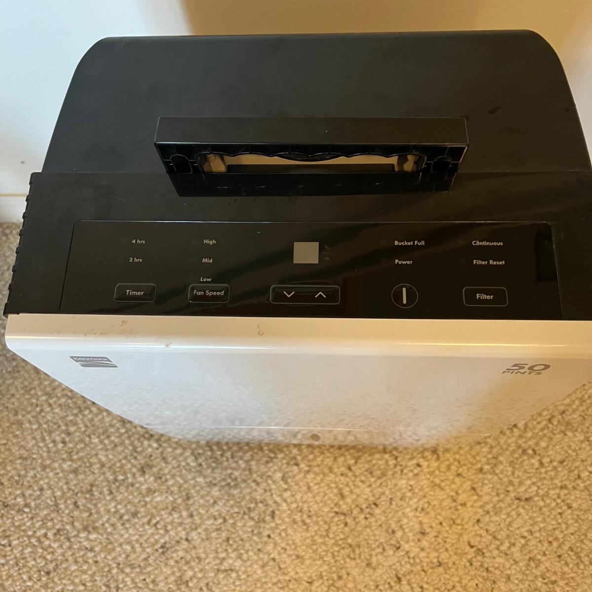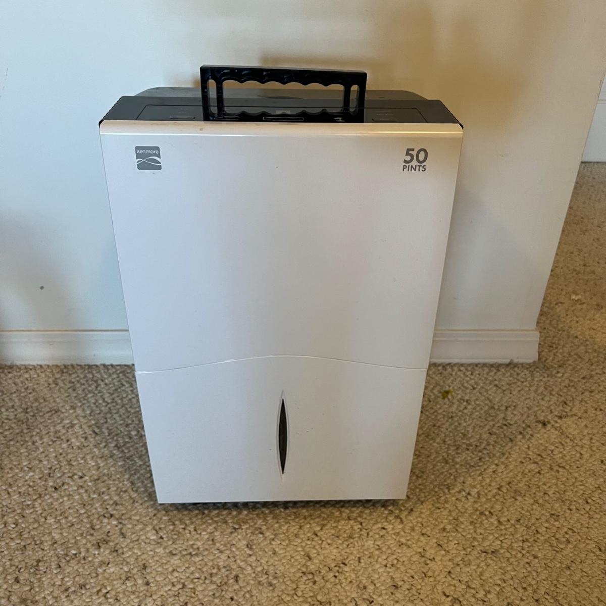 A 50 pint Kenmore dehumidifier measures 15” x 10.5” x 24”H. The item powers on went plugged in and pulls water. Local pick up only.