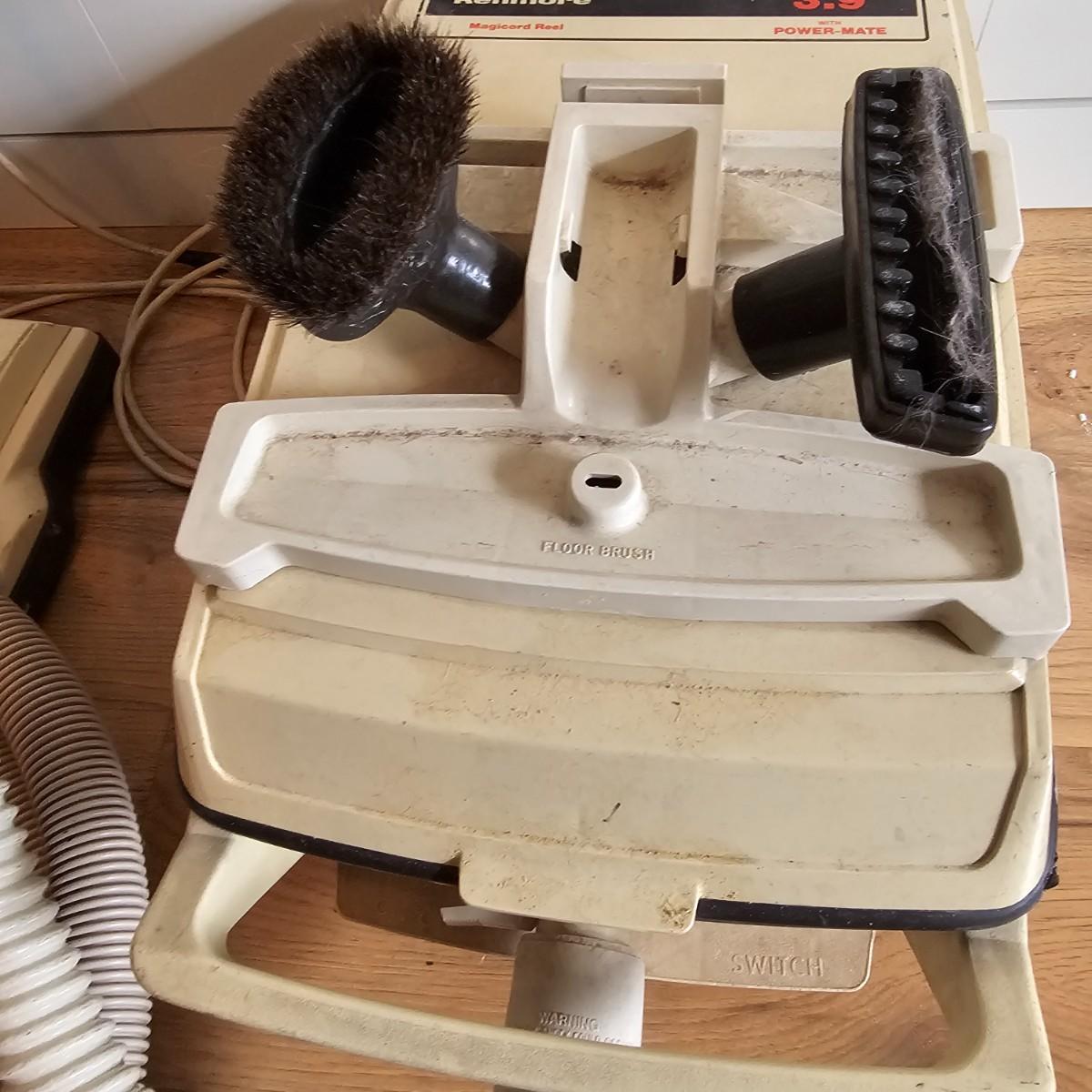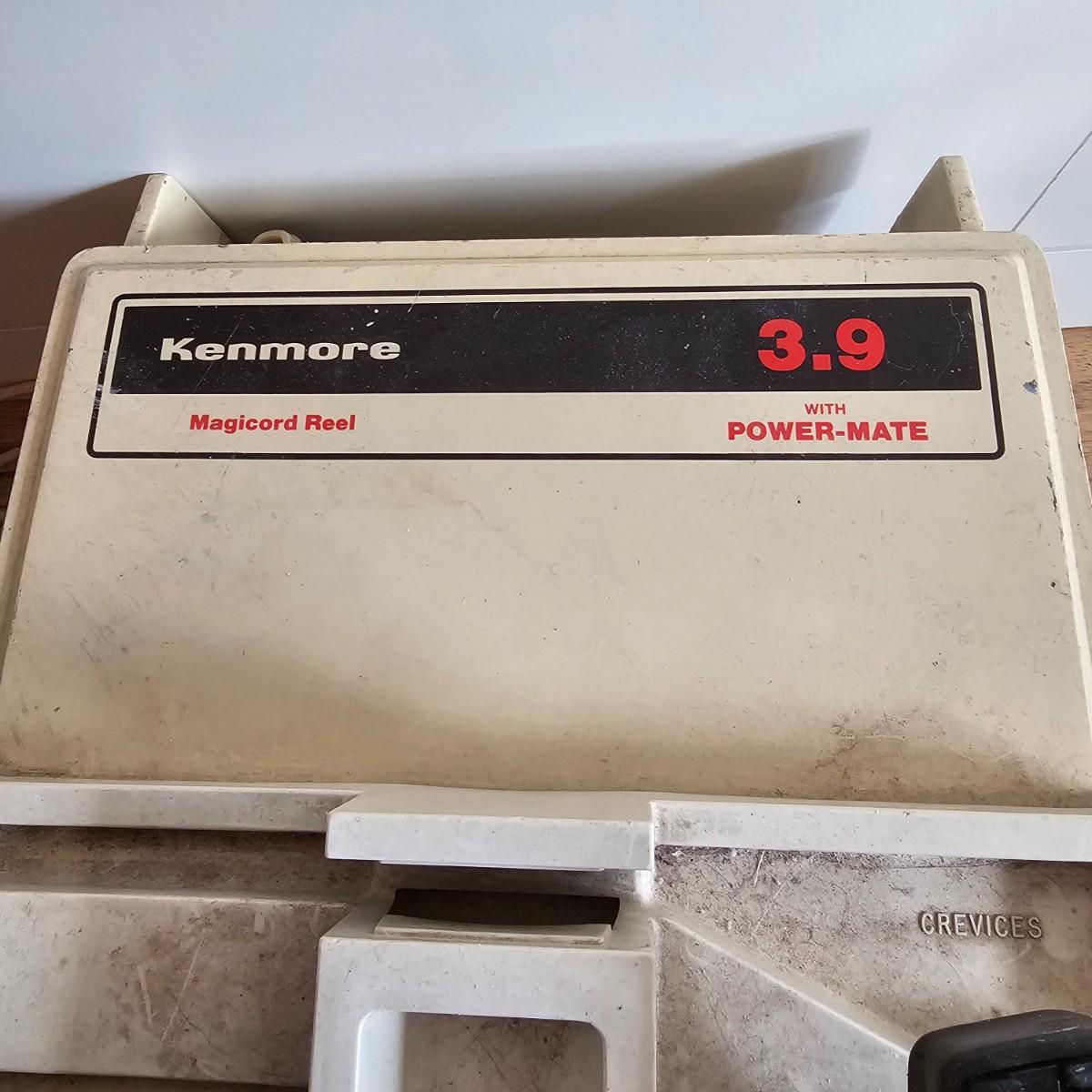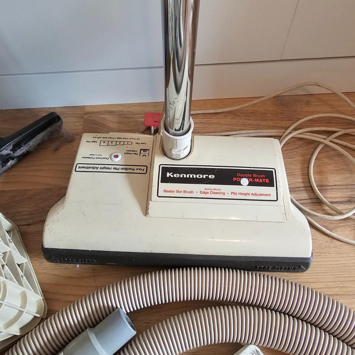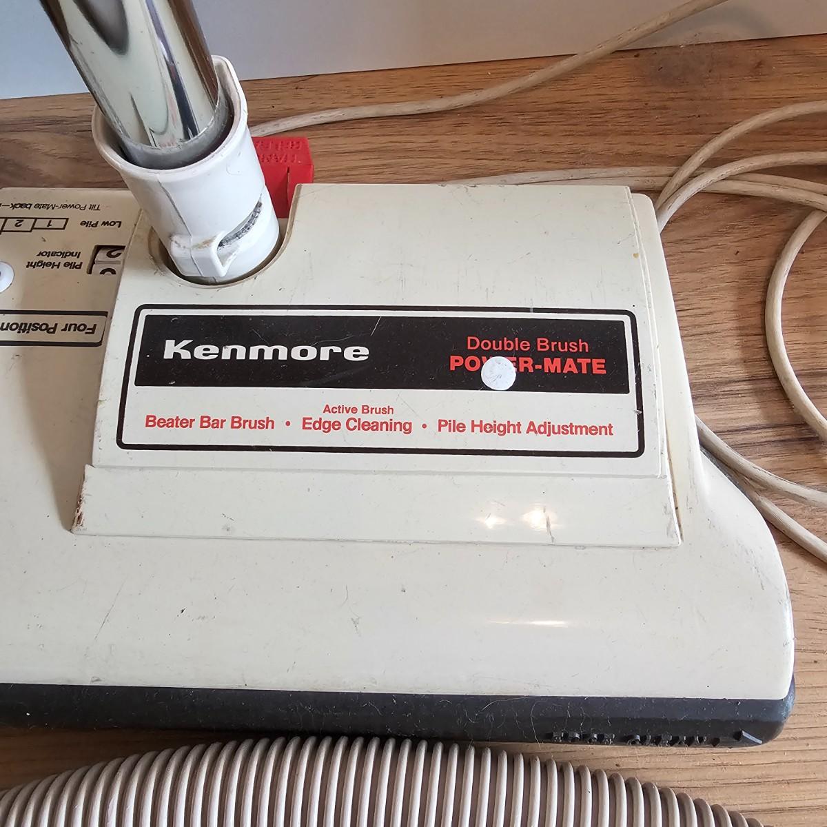 Sears Kenmore canister double brush vacuum. Comes with Power Mate head, extra bags and attachments, additional floor wand and another hose for extended reach. Measures 12" x 21" x 9"H, powered on when plugged in. Power cord has one taped area, case has minor scratches & scuffs. See photos for details. Local pickup only.